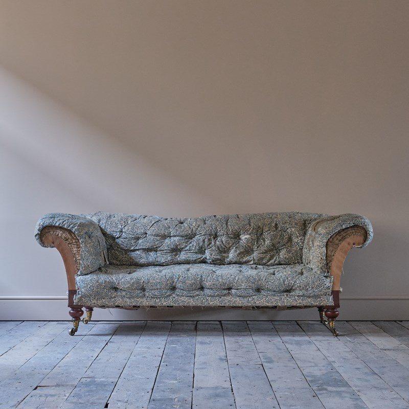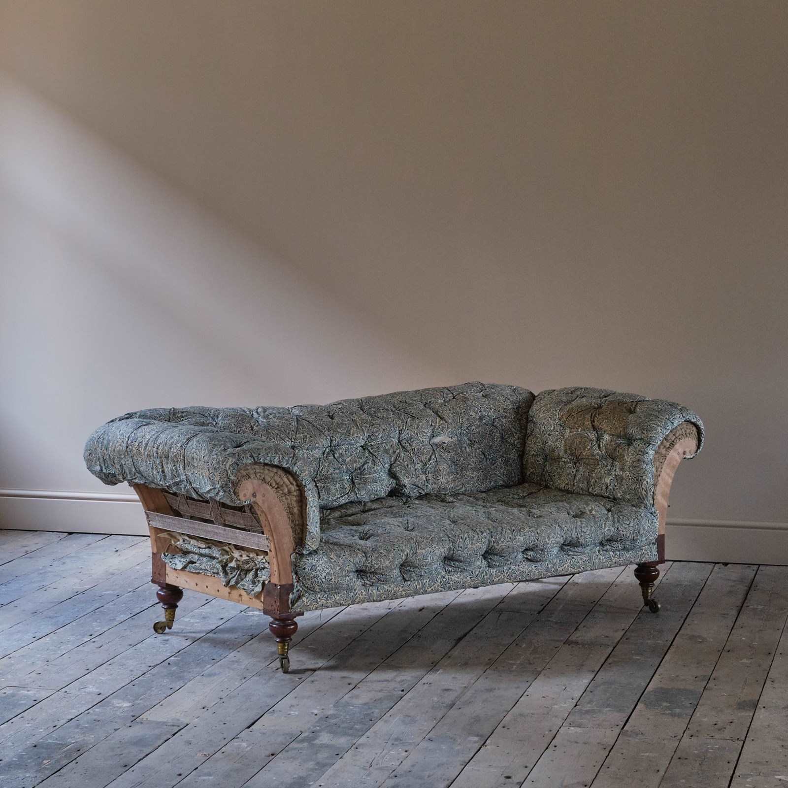 A well drawn mid 19th century country house chesterfield sofa which retains its original fabric, buttoned and sprung fillings to the arms, back and seat which all remain in comfortable condition. We believe this sofa has only had one additional covering which we have removed. The frame is constructed in Oak and Birch with 4 turned mahogany legs and all retain the original brass casters. The timber which is in remarkably well preserved condition is in good solid order with tight joint.