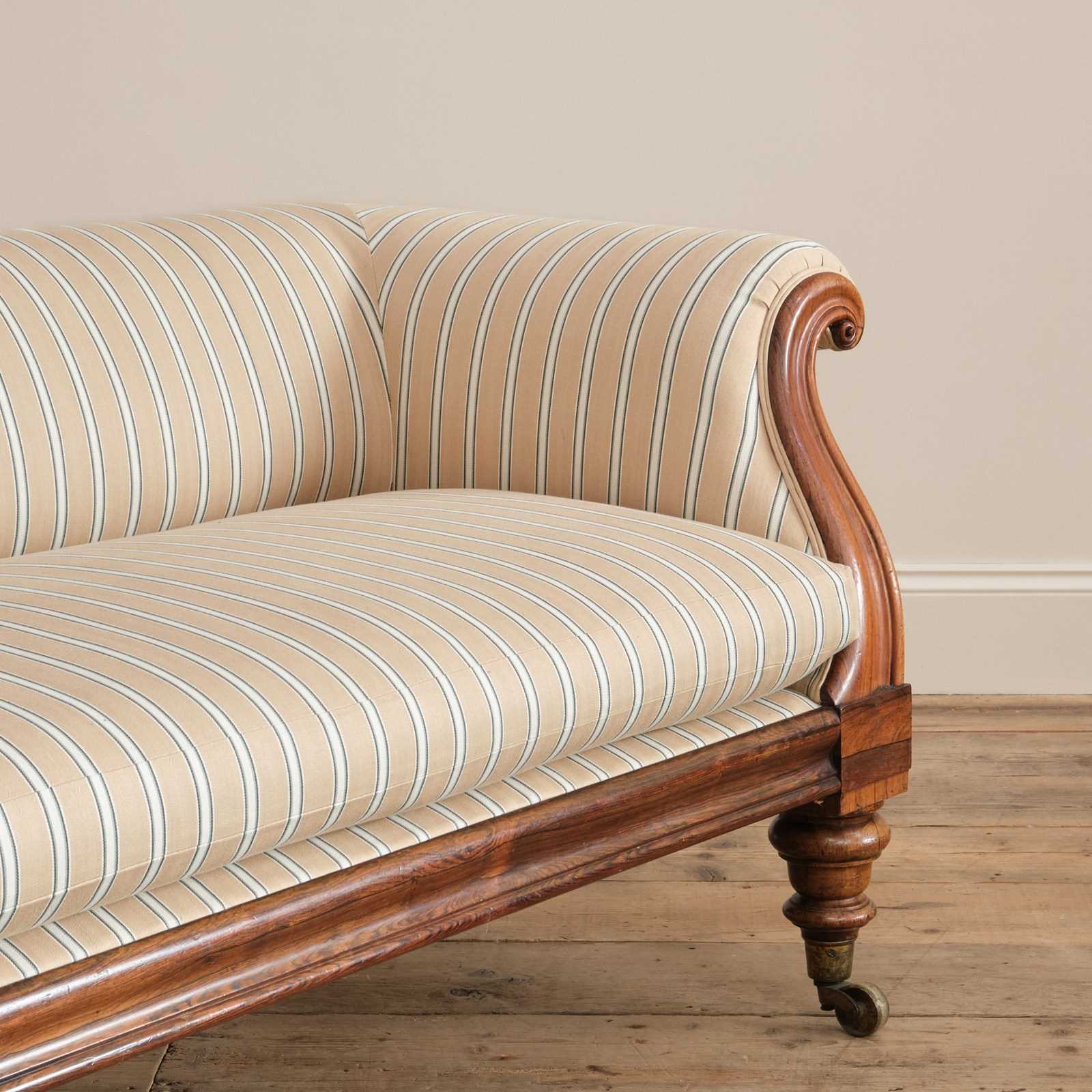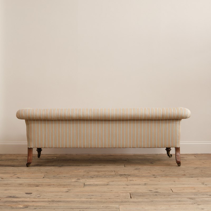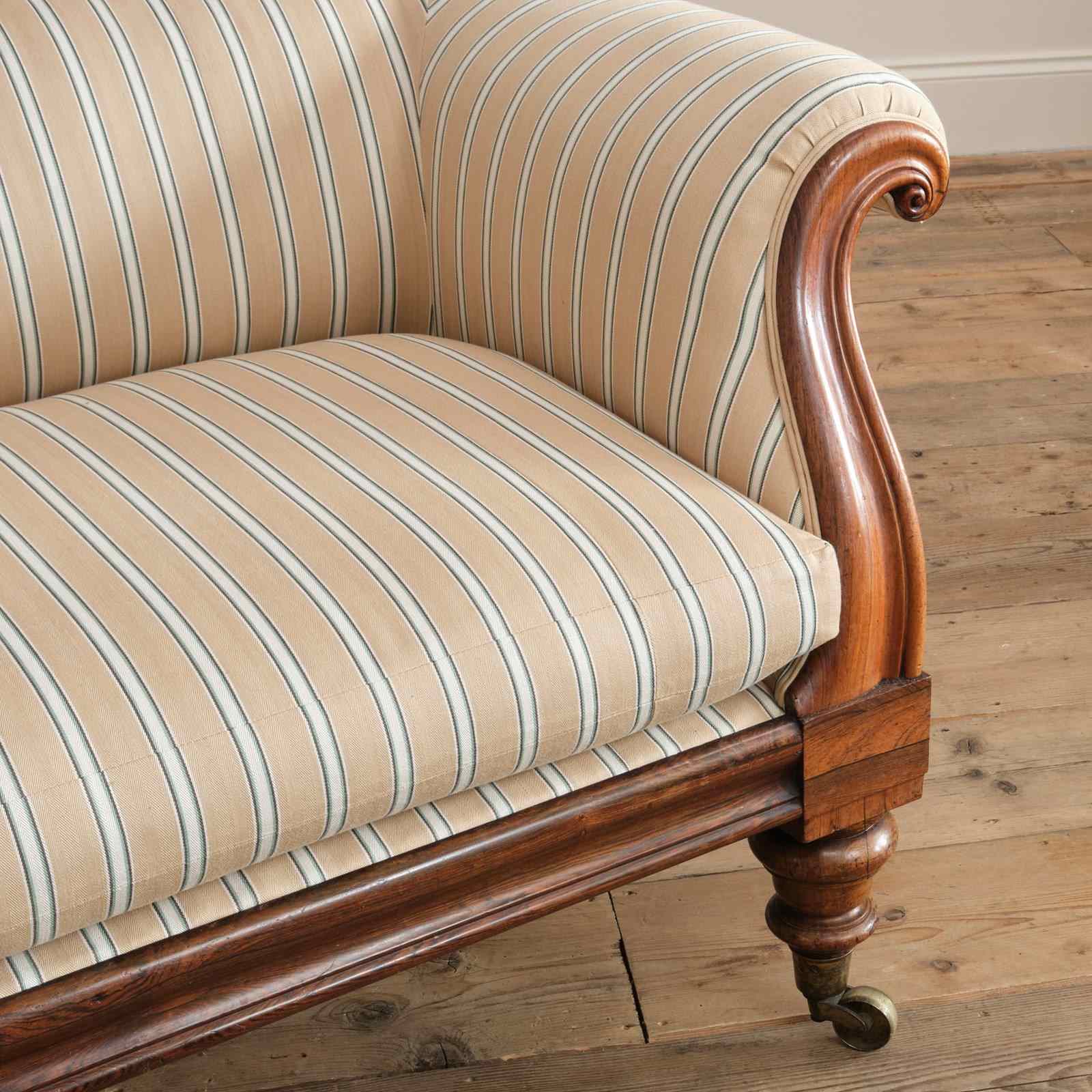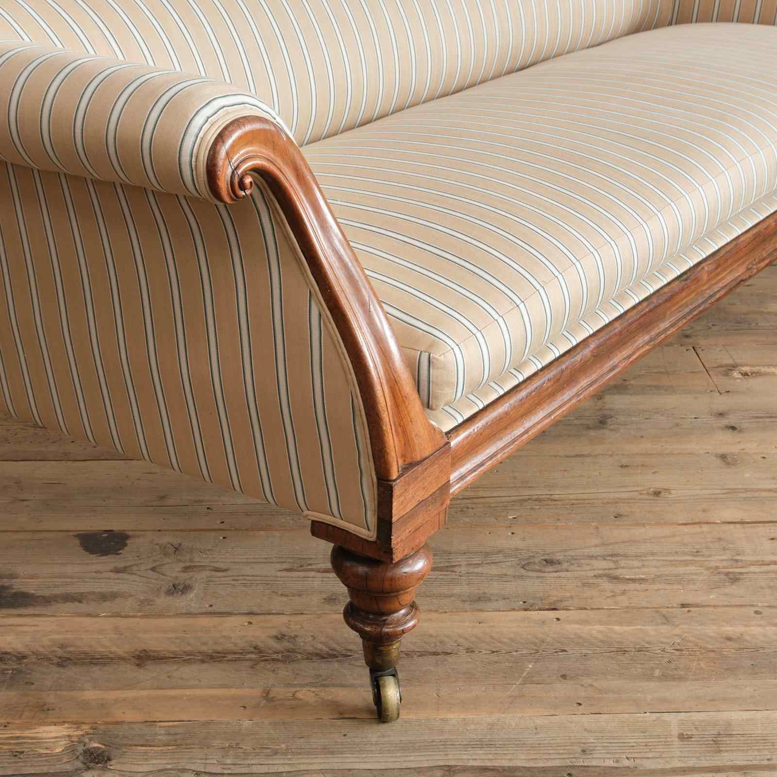 A superb quality low sleek, mid 19th century deep seated country house sofa. Raised on turned Rosewood legs with with the original copes casters. Retaining its original horsehair filled squab seat cushion C1840