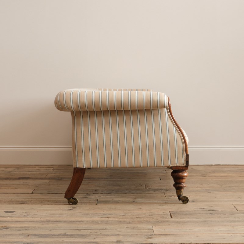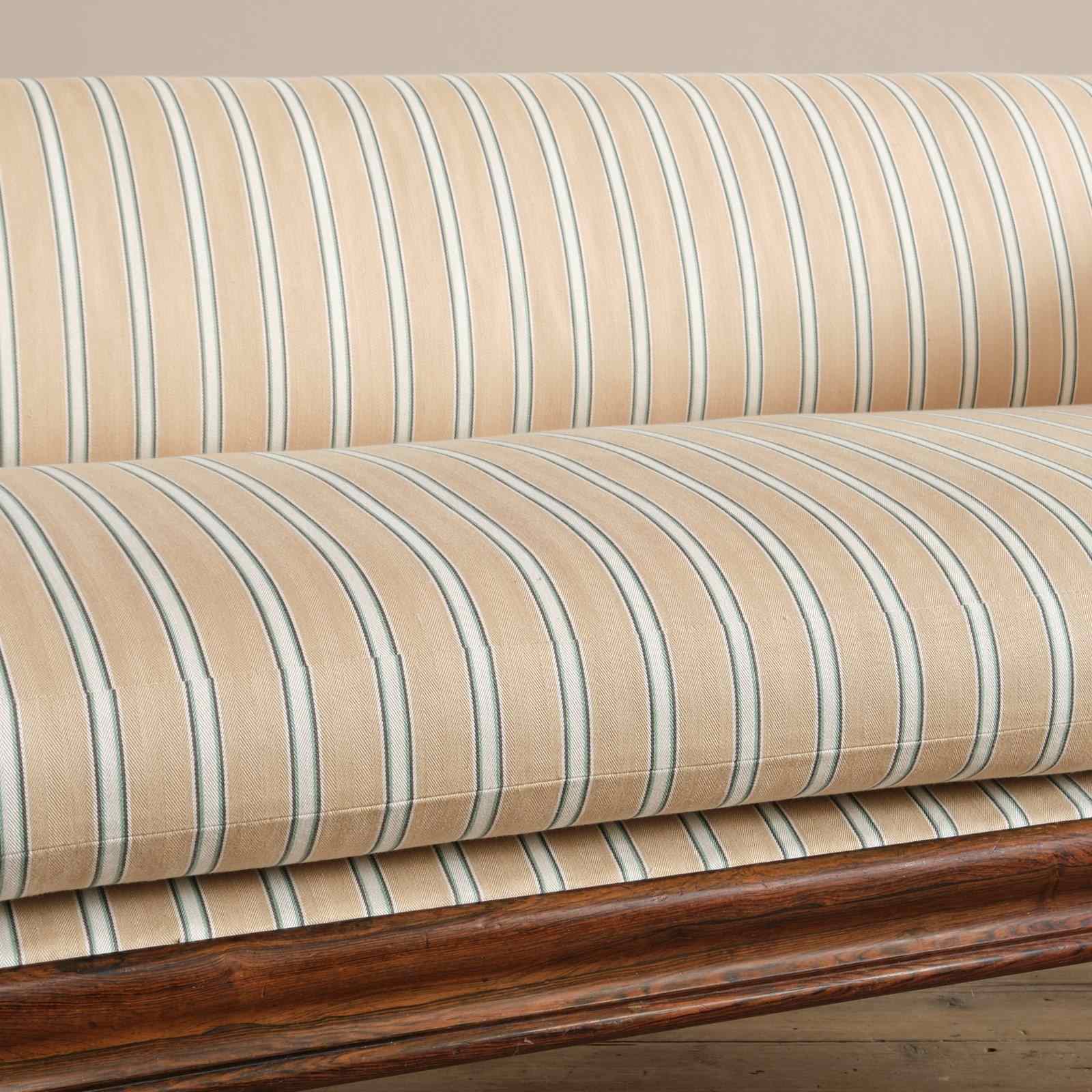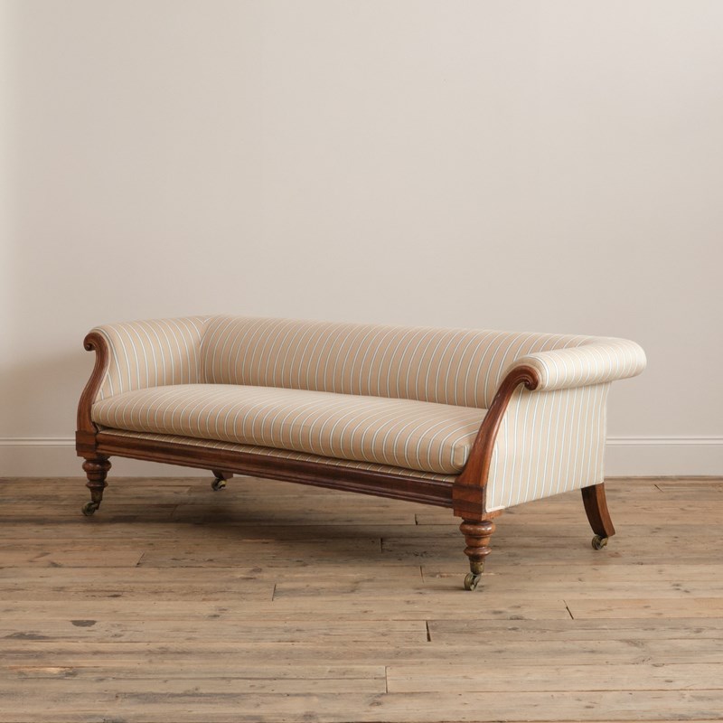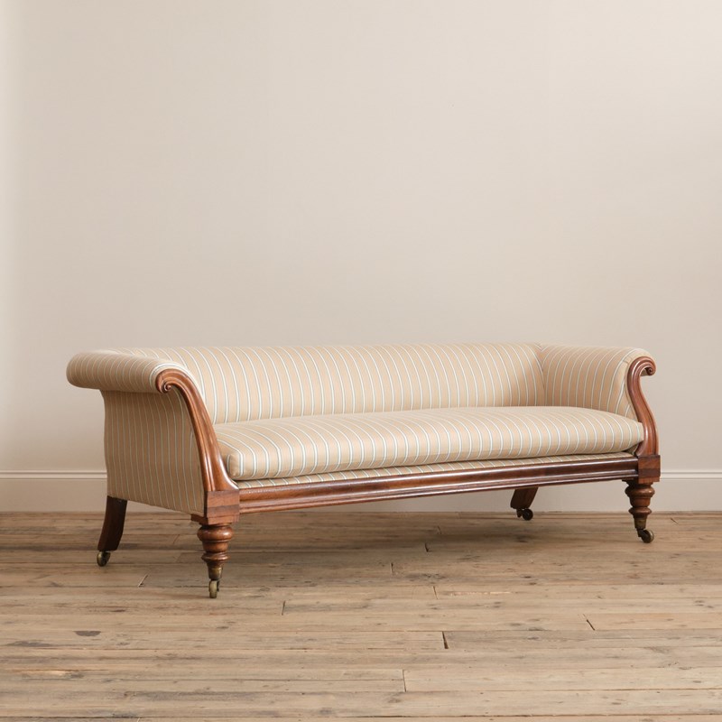 A superb quality low sleek, mid 19th century deep seated country house sofa. Raised on turned Rosewood legs with with the original copes casters. Retaining its original horsehair filled squab seat cushion C1840