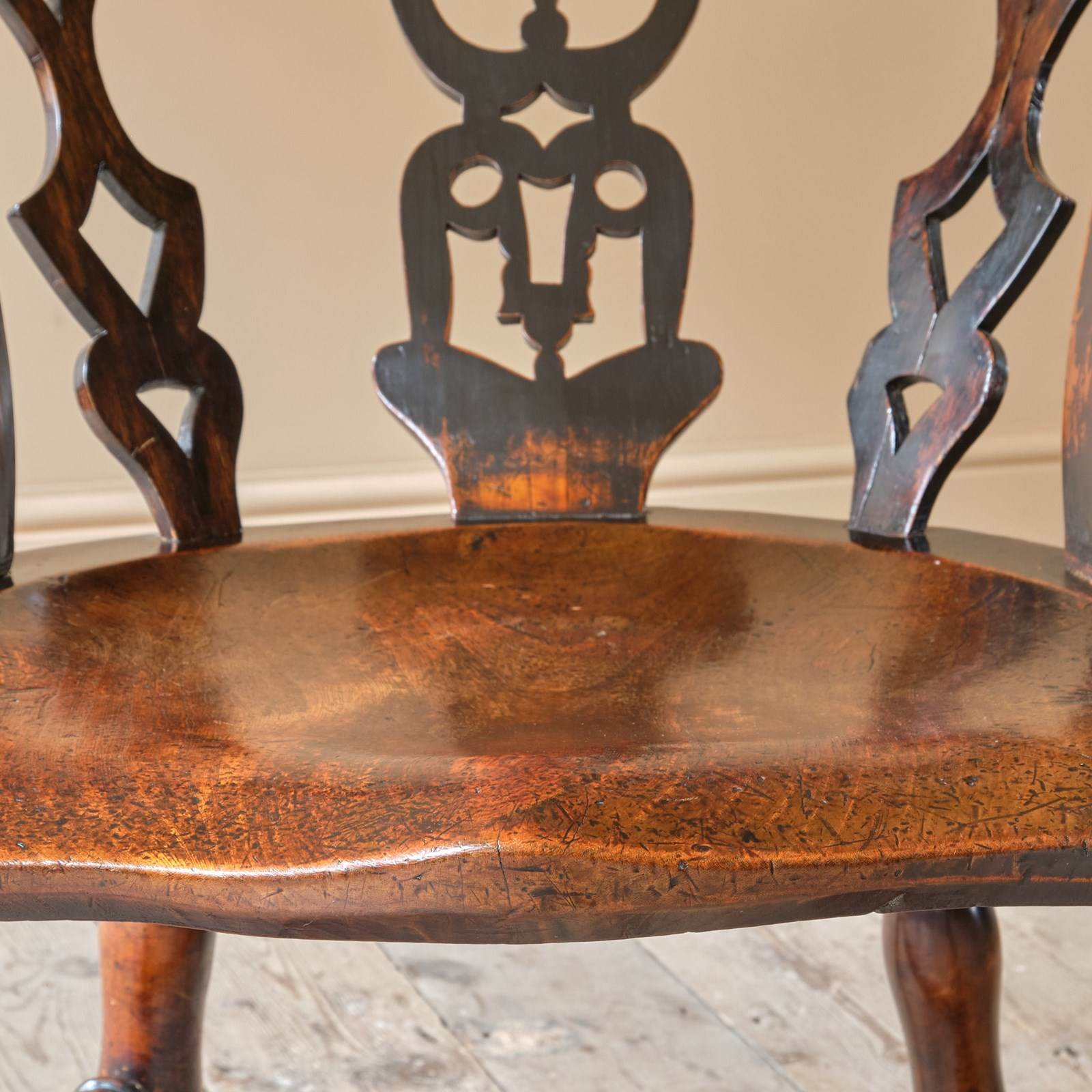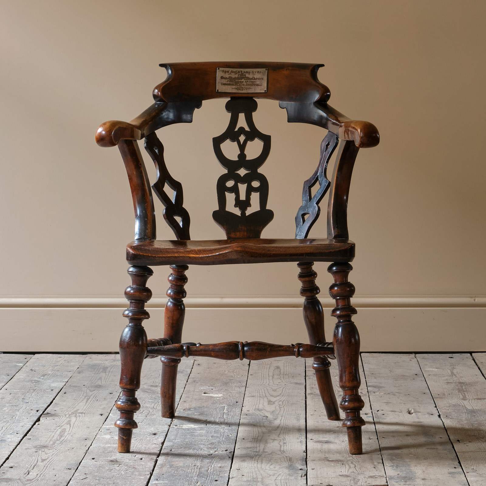 The chair is raised on turned legs joined by stretchers and with a nicely formed elm slab seat. The back with pierced splats joined by a shaped back rest and arms. The backrest with the steel remembrance Plaque.