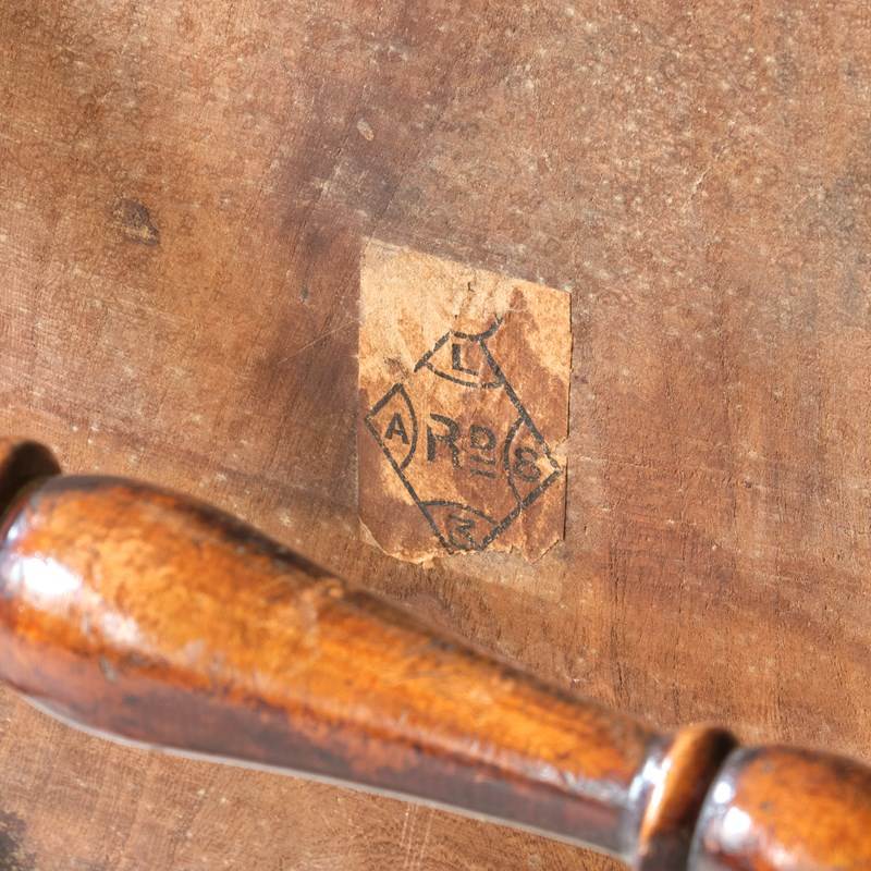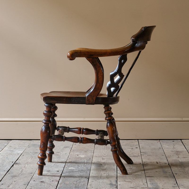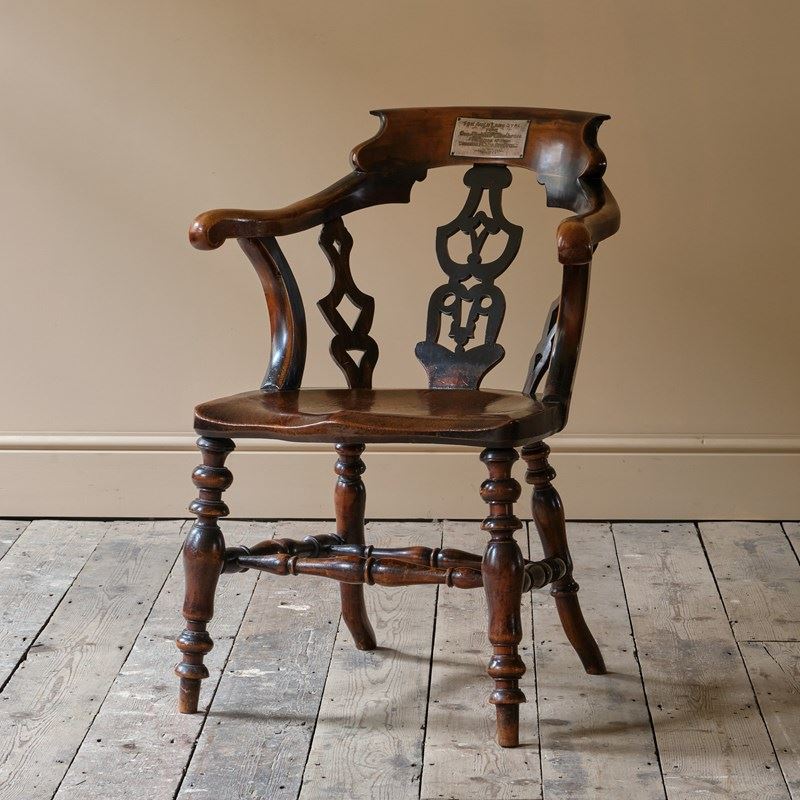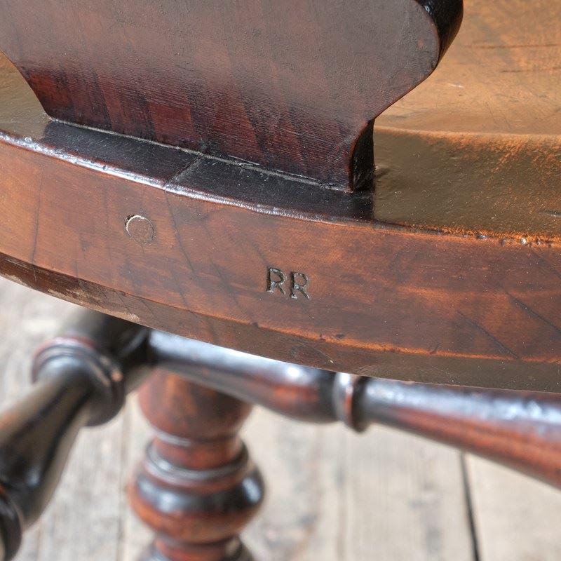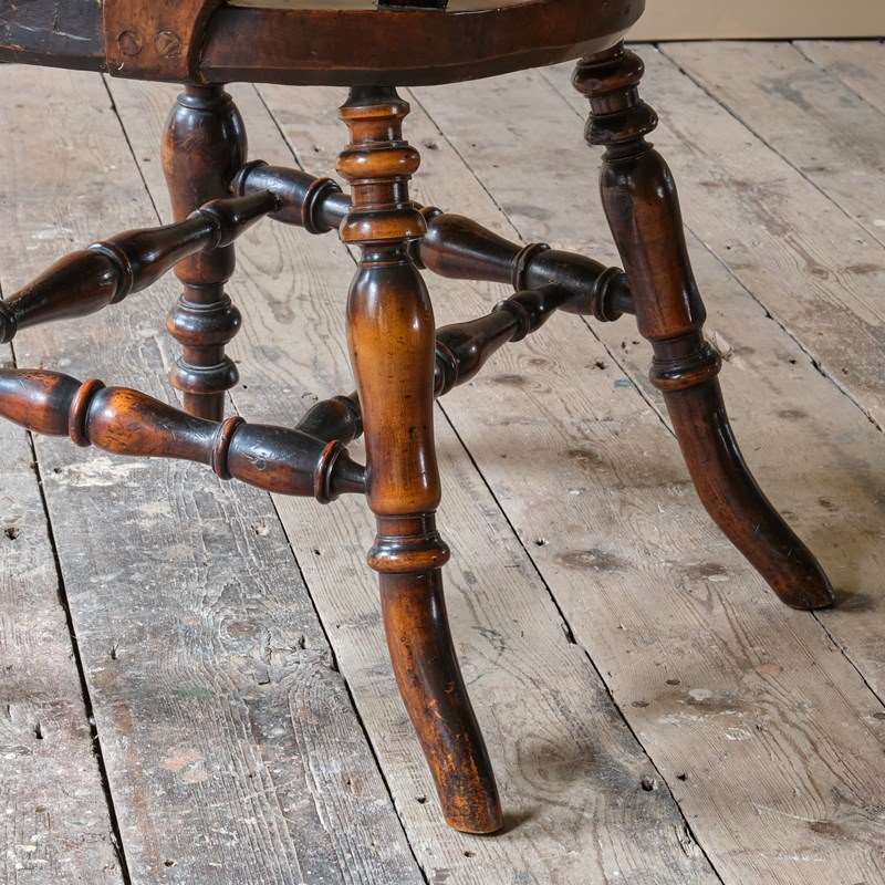 A rather unusual mid 19th century desk chair. Constructed in ash and elm with fruitwood arms. The chair came from a cutlers in Sheffield and appears to be have been given in remembrance of Richard Woolhouse 1778-1852. A table knife Cutler in Sheffield England.