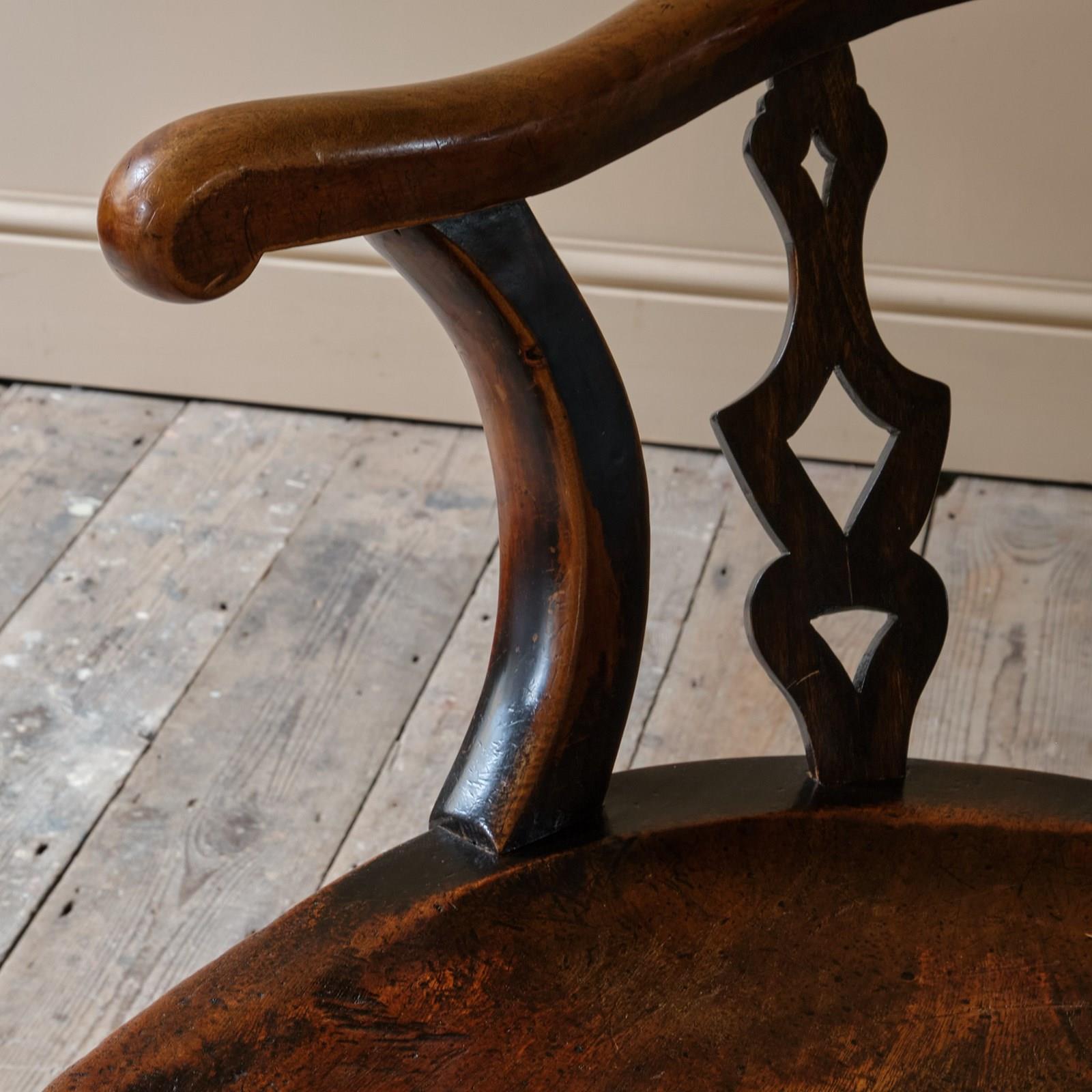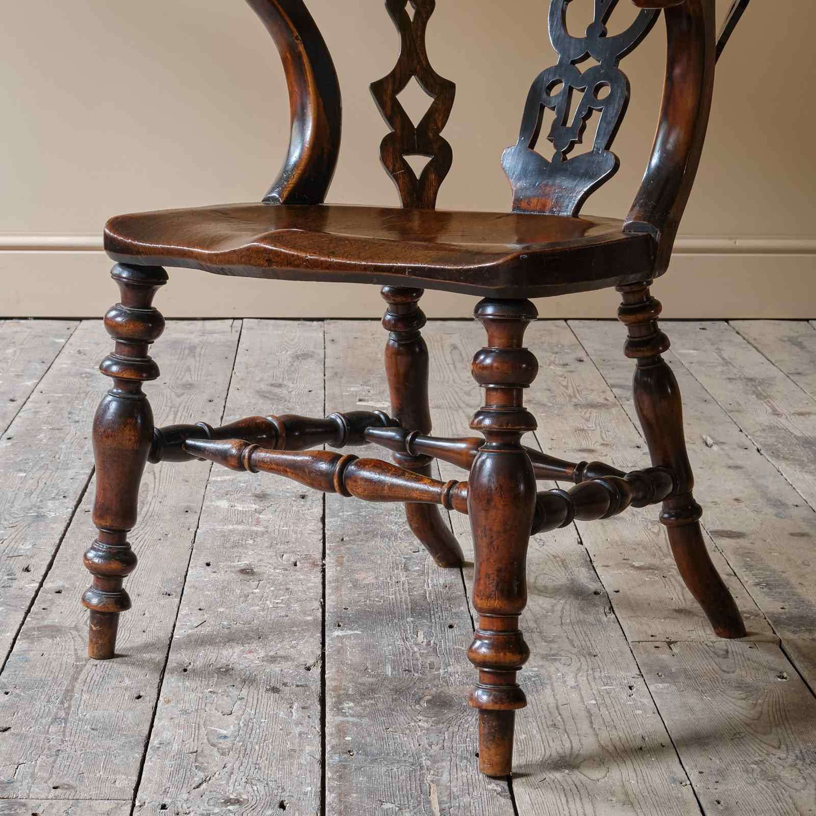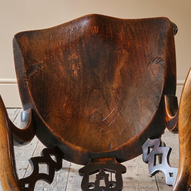 A rather unusual mid 19th century desk chair. Constructed in ash and elm with fruitwood arms. The chair came from a cutlers in Sheffield and appears to be have been given in remembrance of Richard Woolhouse 1778-1852. A table knife Cutler in Sheffield England.