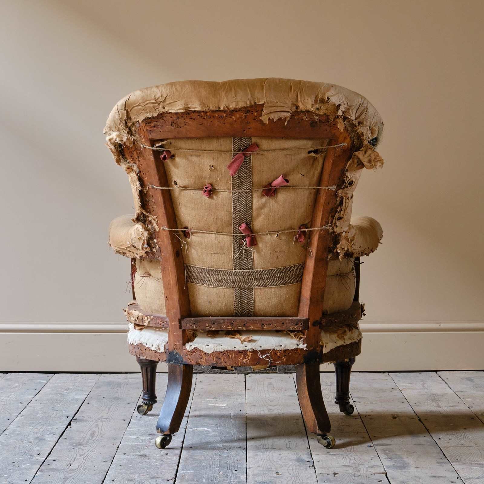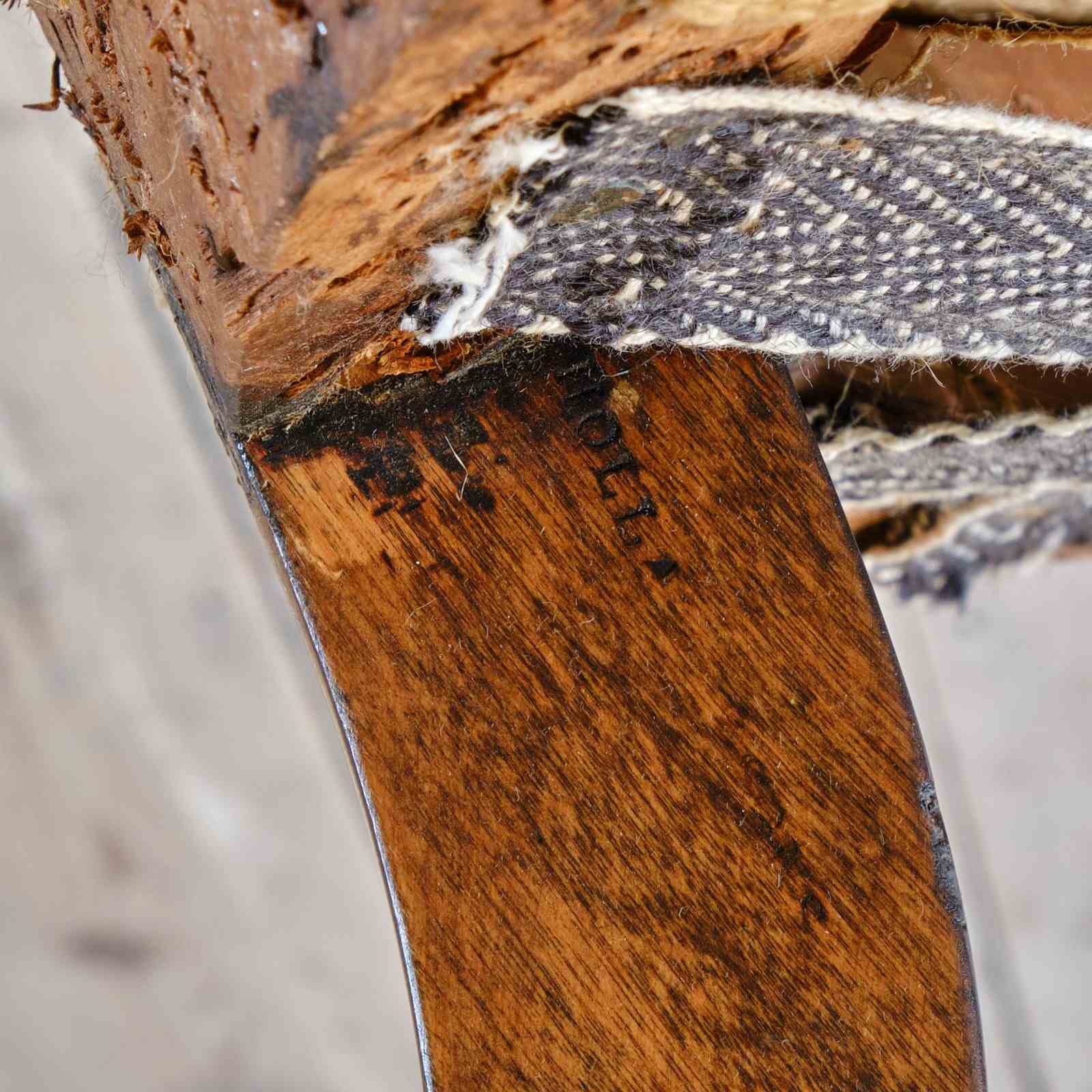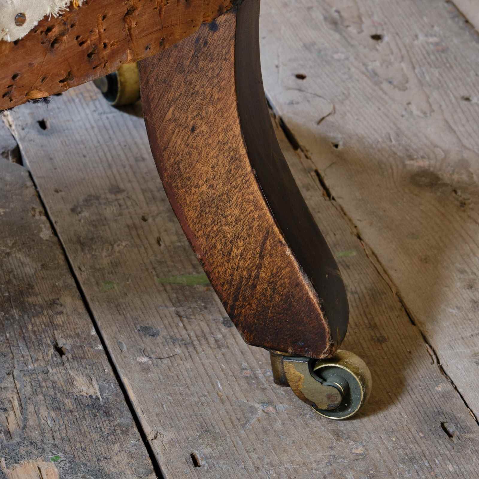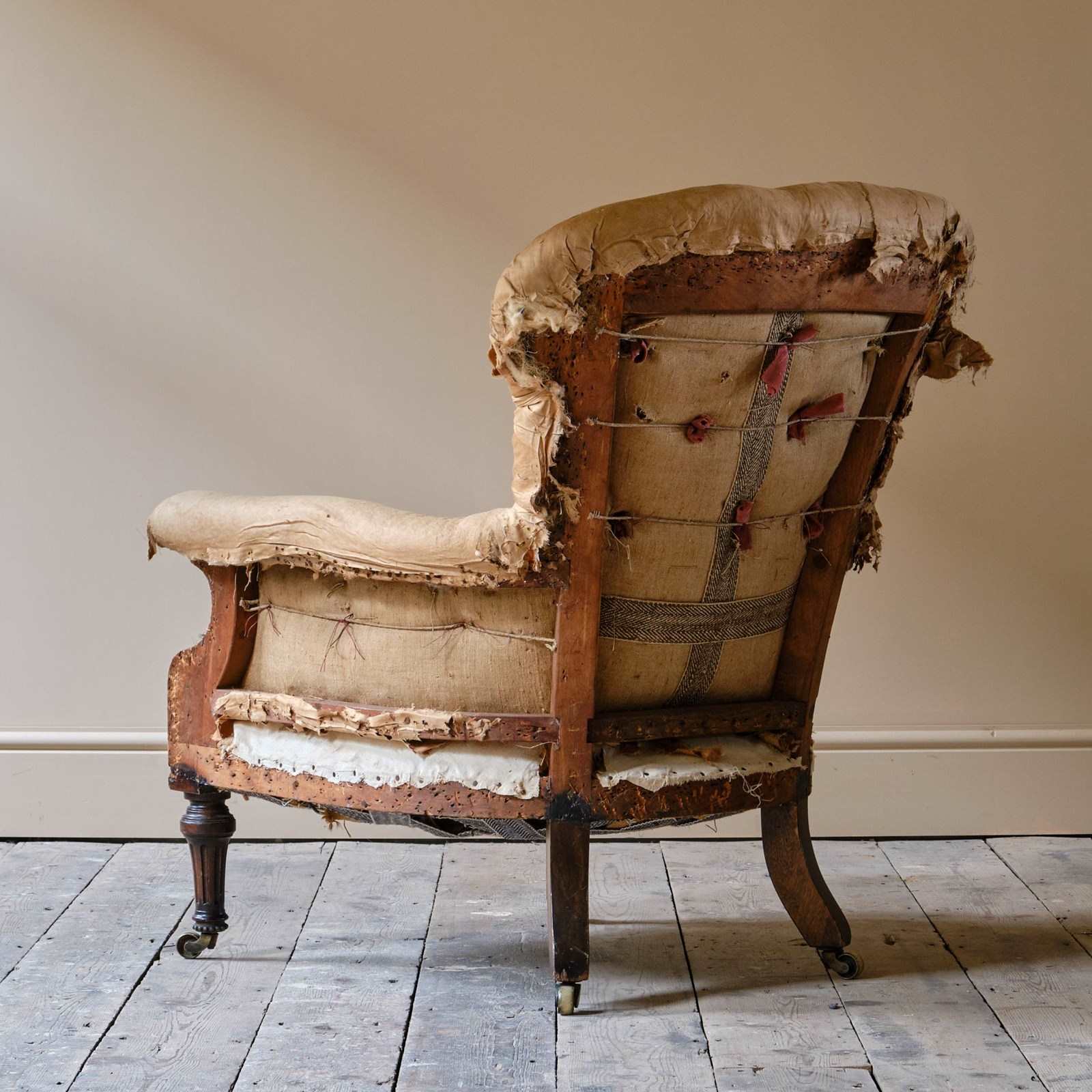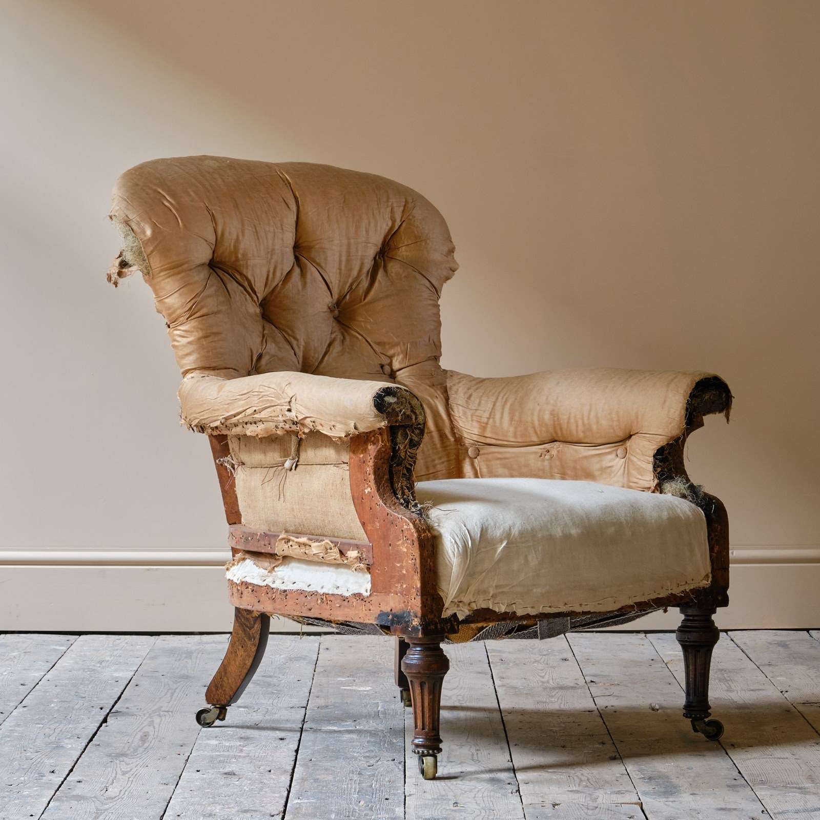 The chair sits firm and retains the original buttoned upholstery to the back and arms. The seat is a more recent replacement.