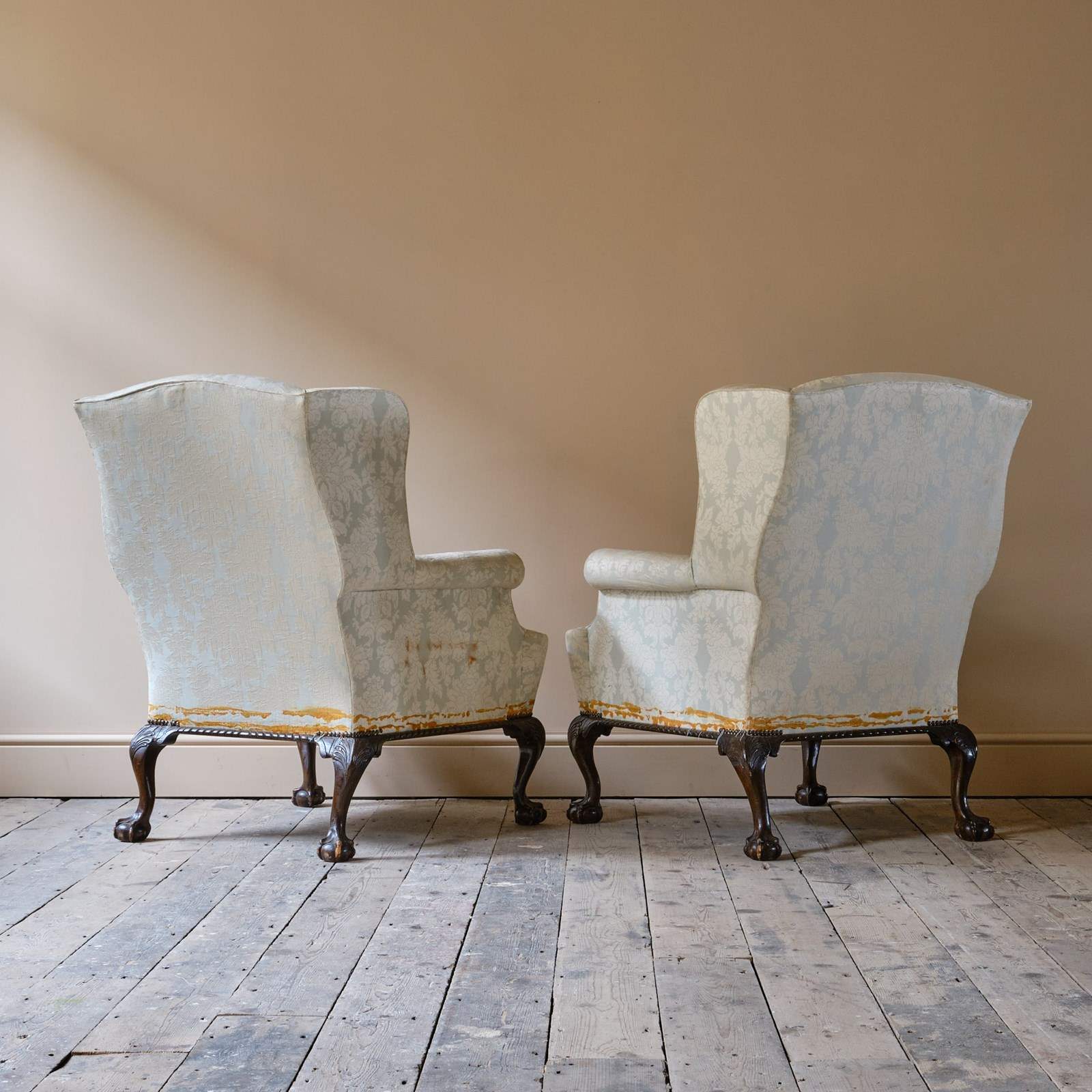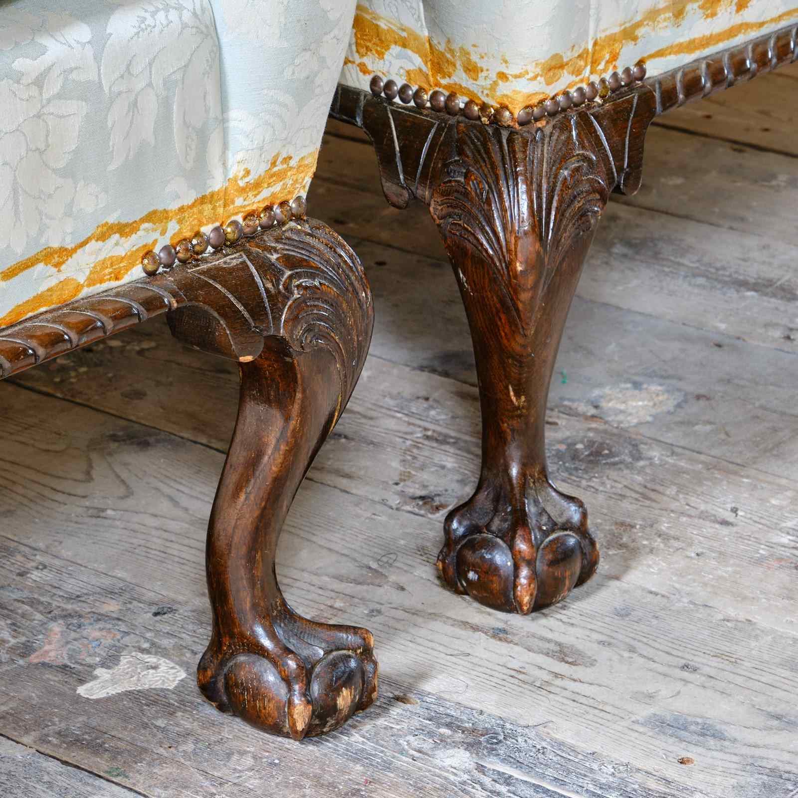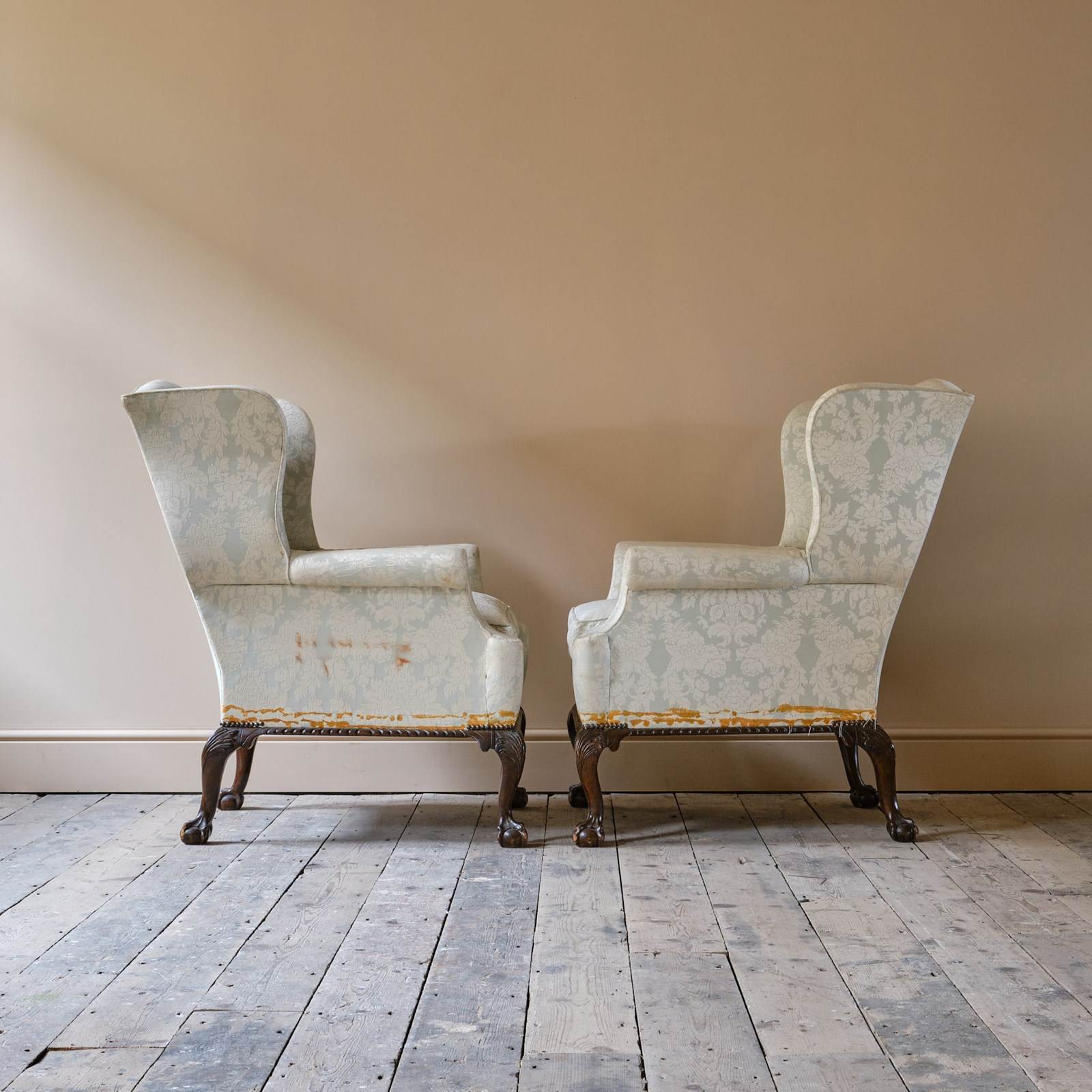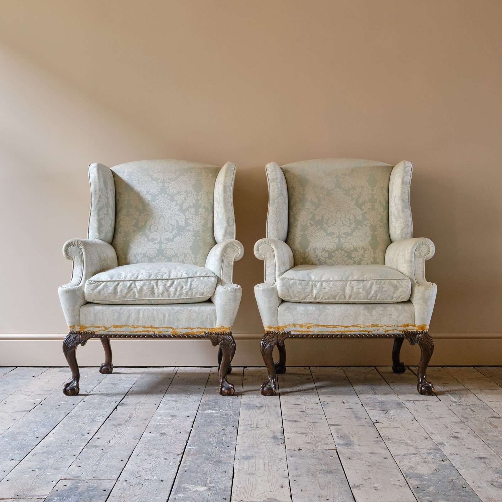 A good pair of mid 20th century wingback armchairs, Raised on 4 carved ball and claw legs.