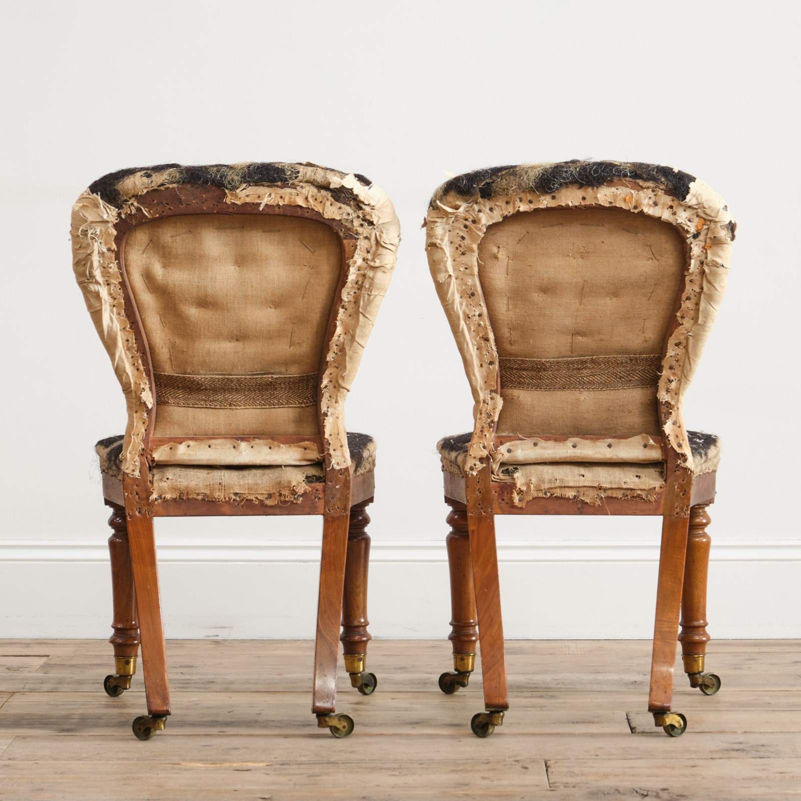 A superb pair of mid 19th century English slipper chairs. Raised on tall walnut turned front legs splayed rear legs and all with the original gilt brass Cope & Collinson brass casters. Both chairs retain the original innards which are firm and intact. In the manner of and possibly by Holland & Sons although unstamped.