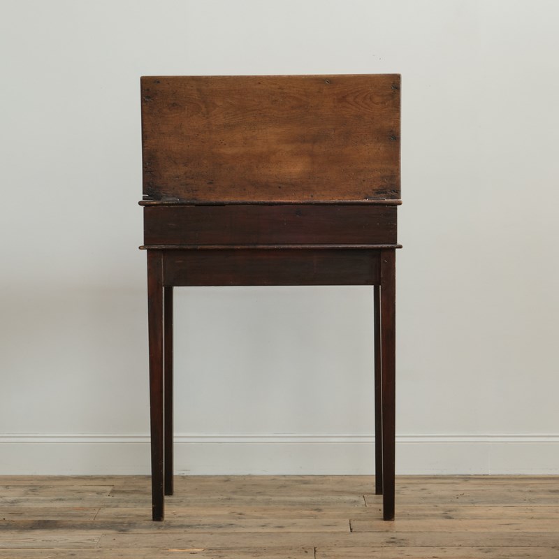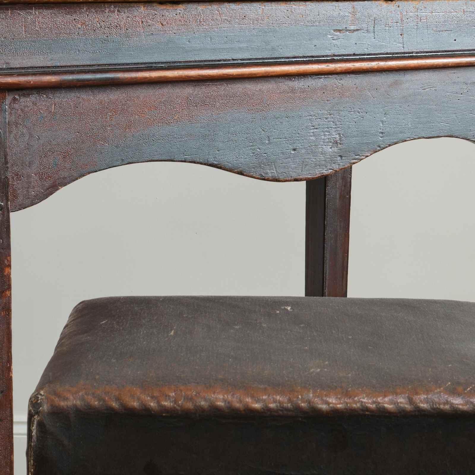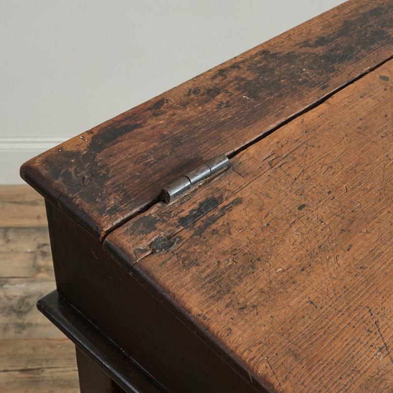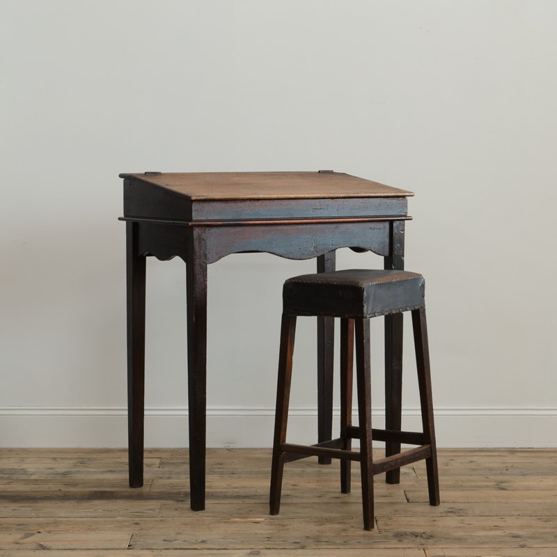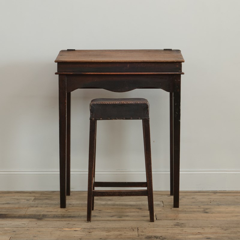 An early 20th century pine Clerks desk and stool in worn untouched dry condition. The stool retaining its original Rexine upholstery.