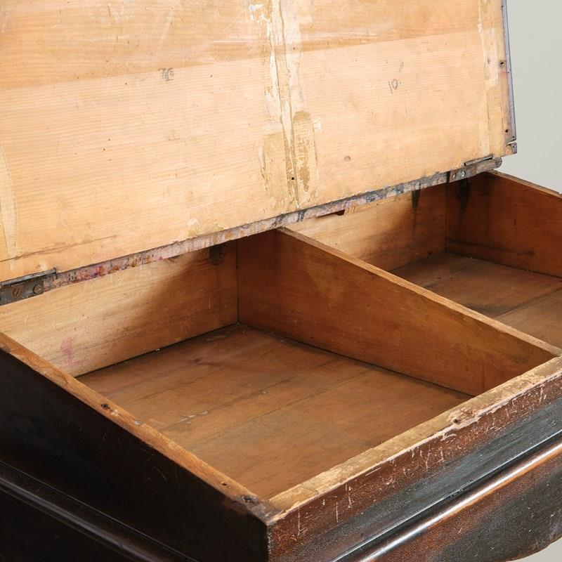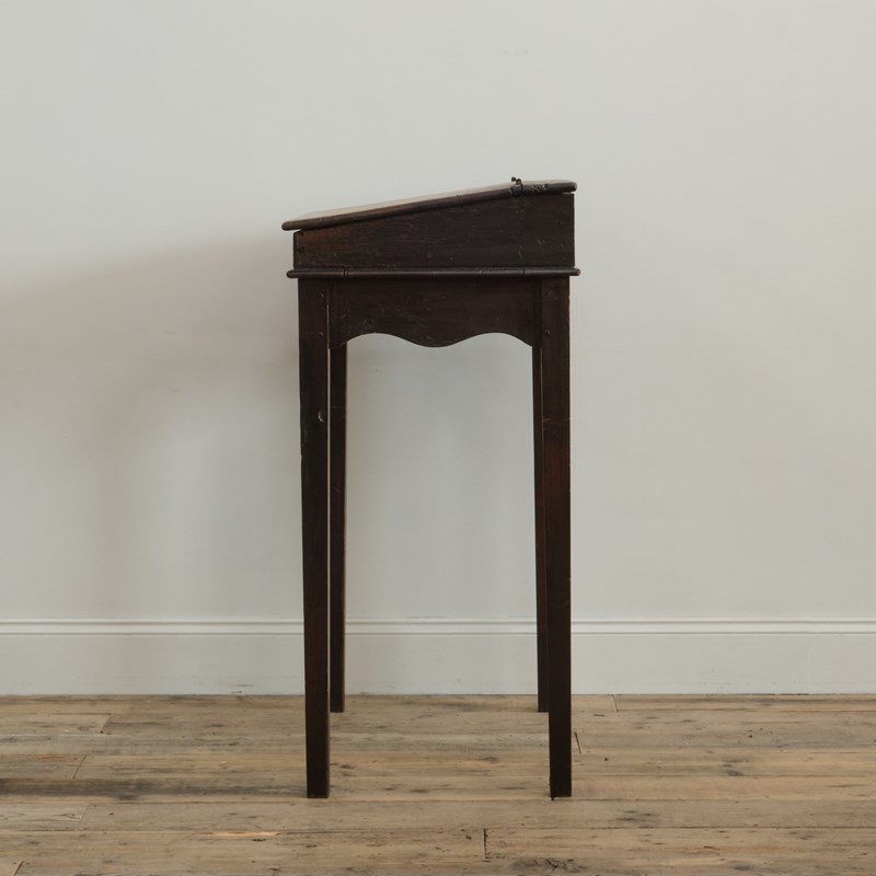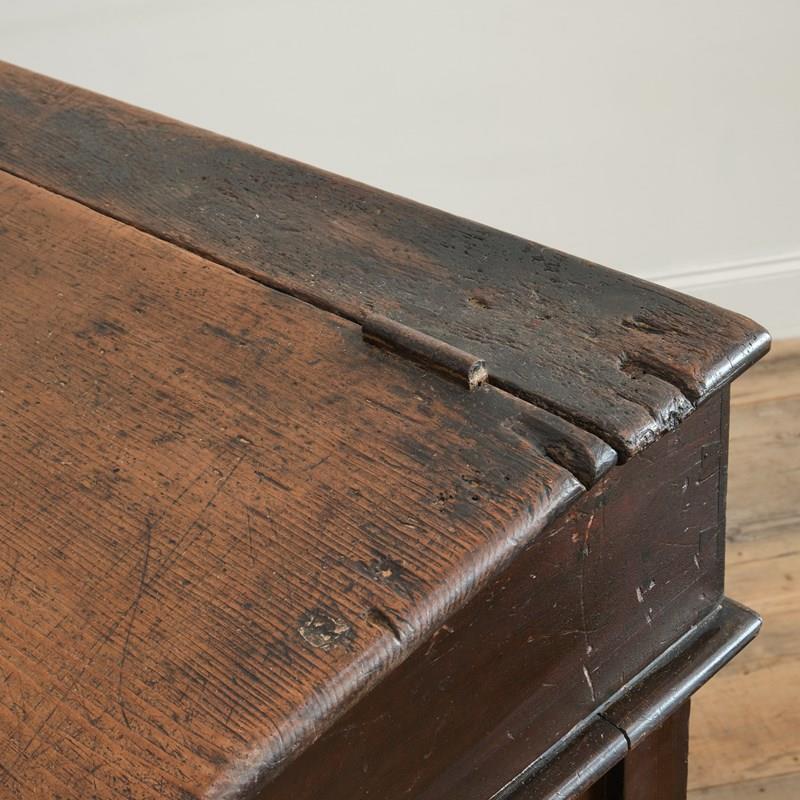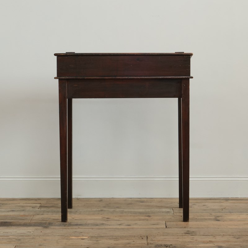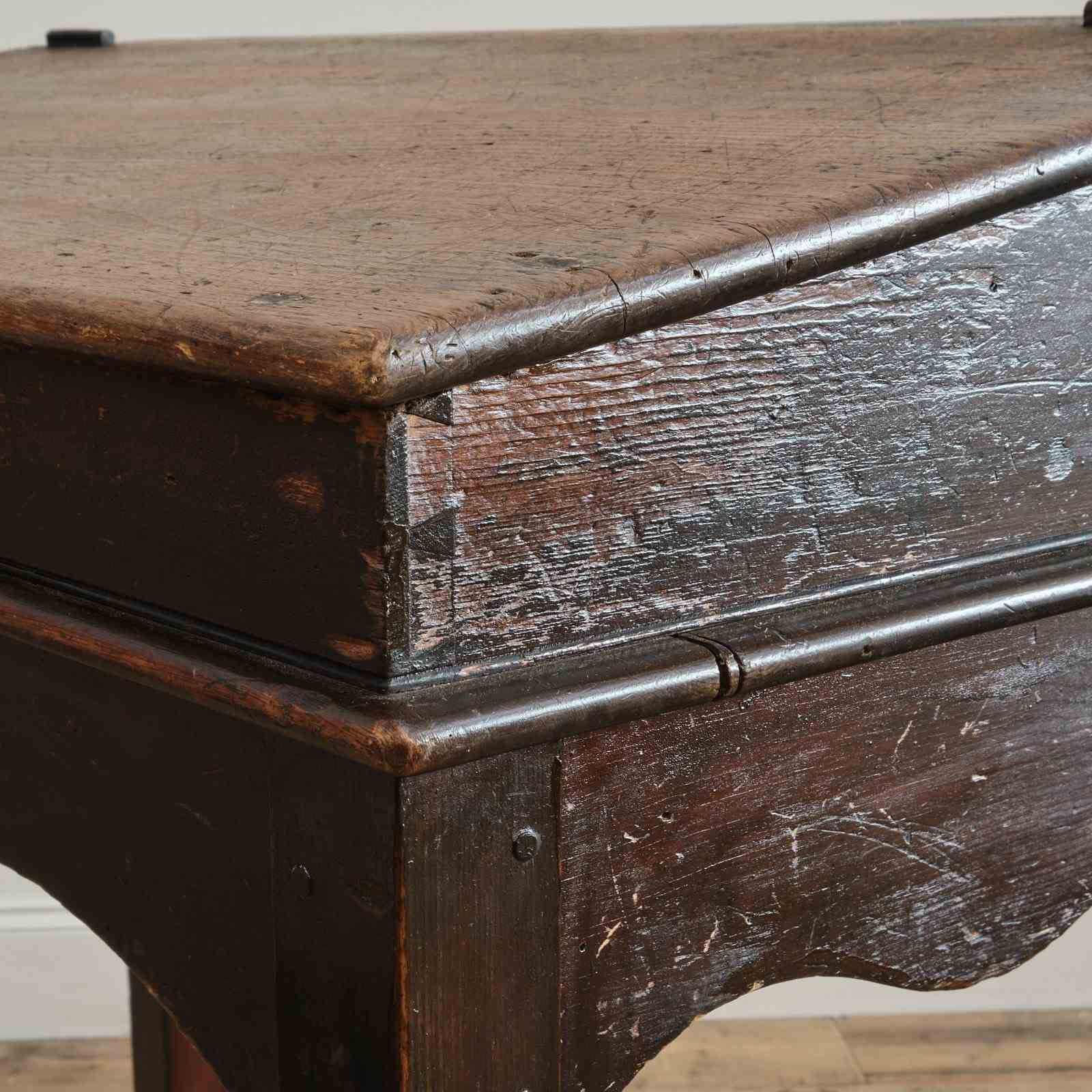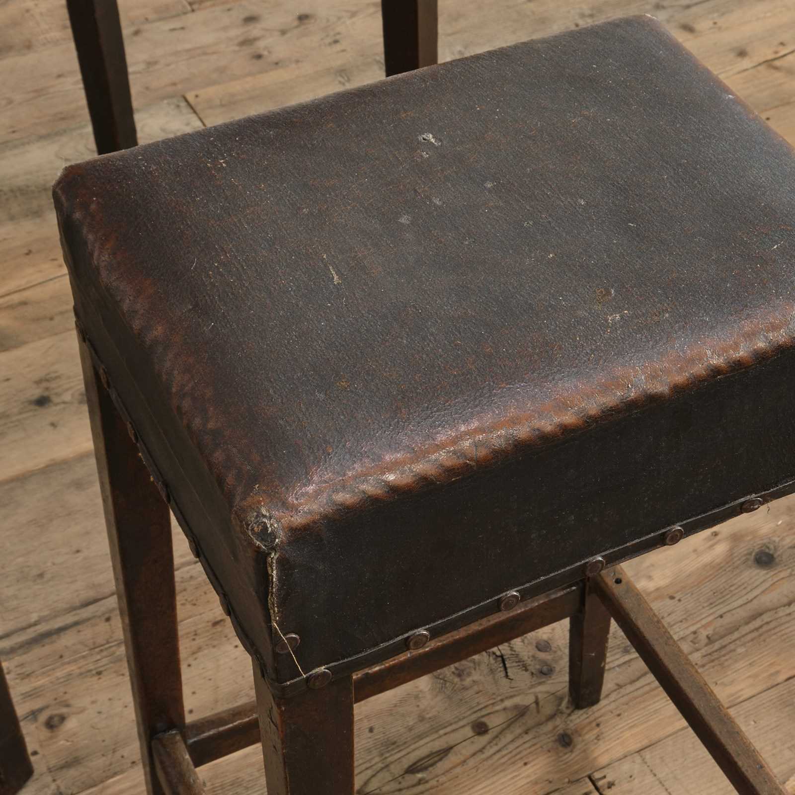 An early 20th century pine Clerks desk and stool in worn untouched dry condition. The stool retaining its original Rexine upholstery.