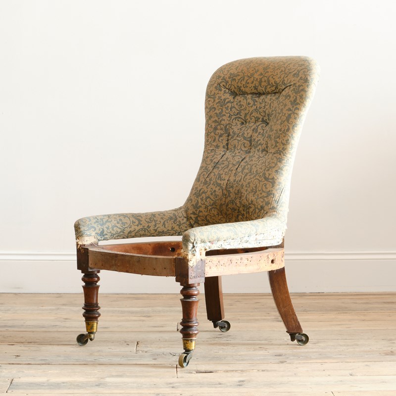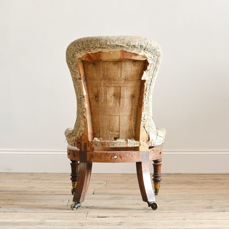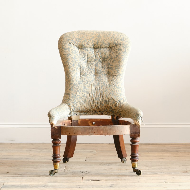 Newly upholstered in a Desired Effect reproduction of the original printed linen.