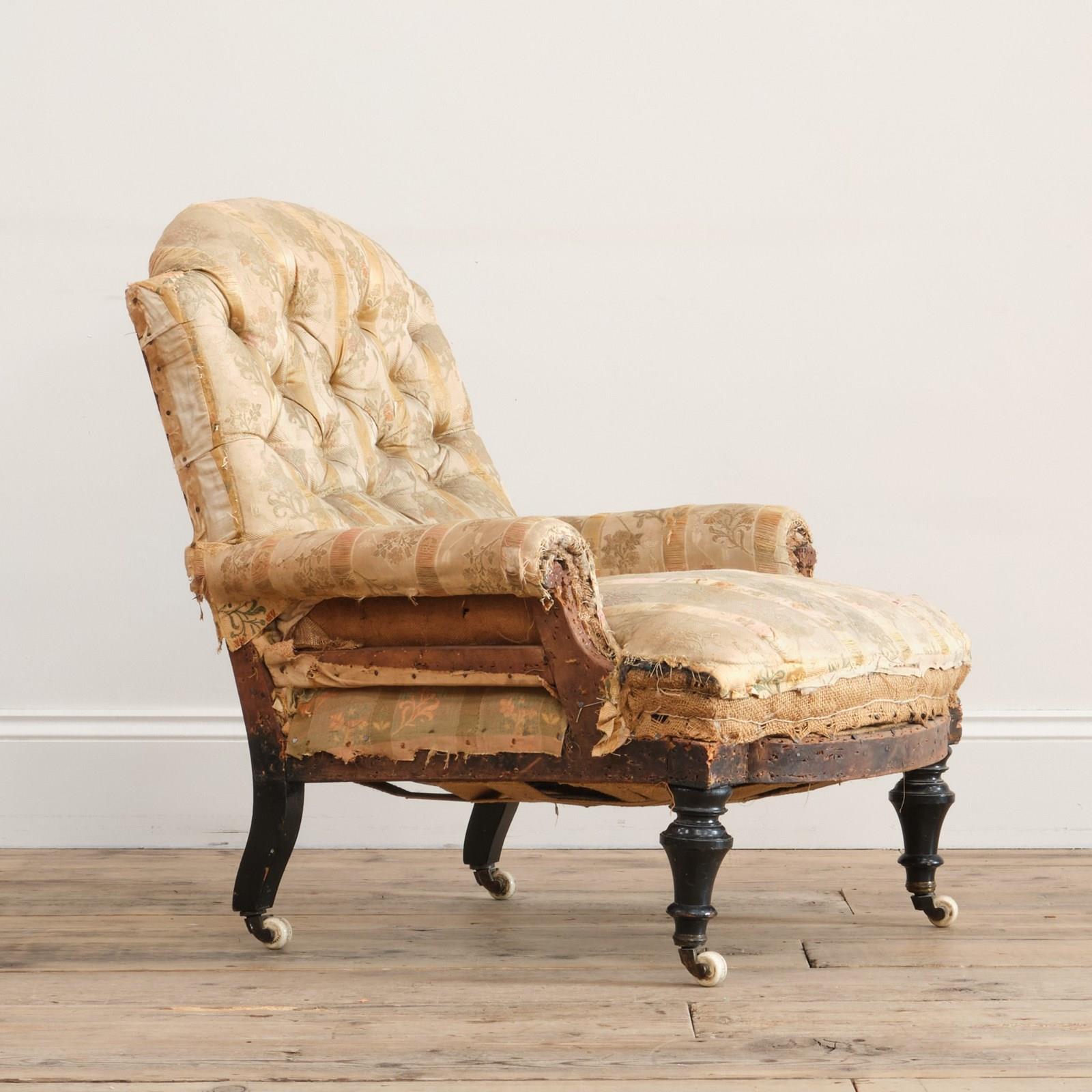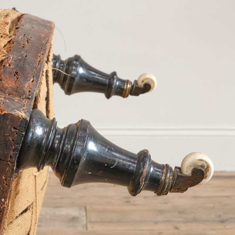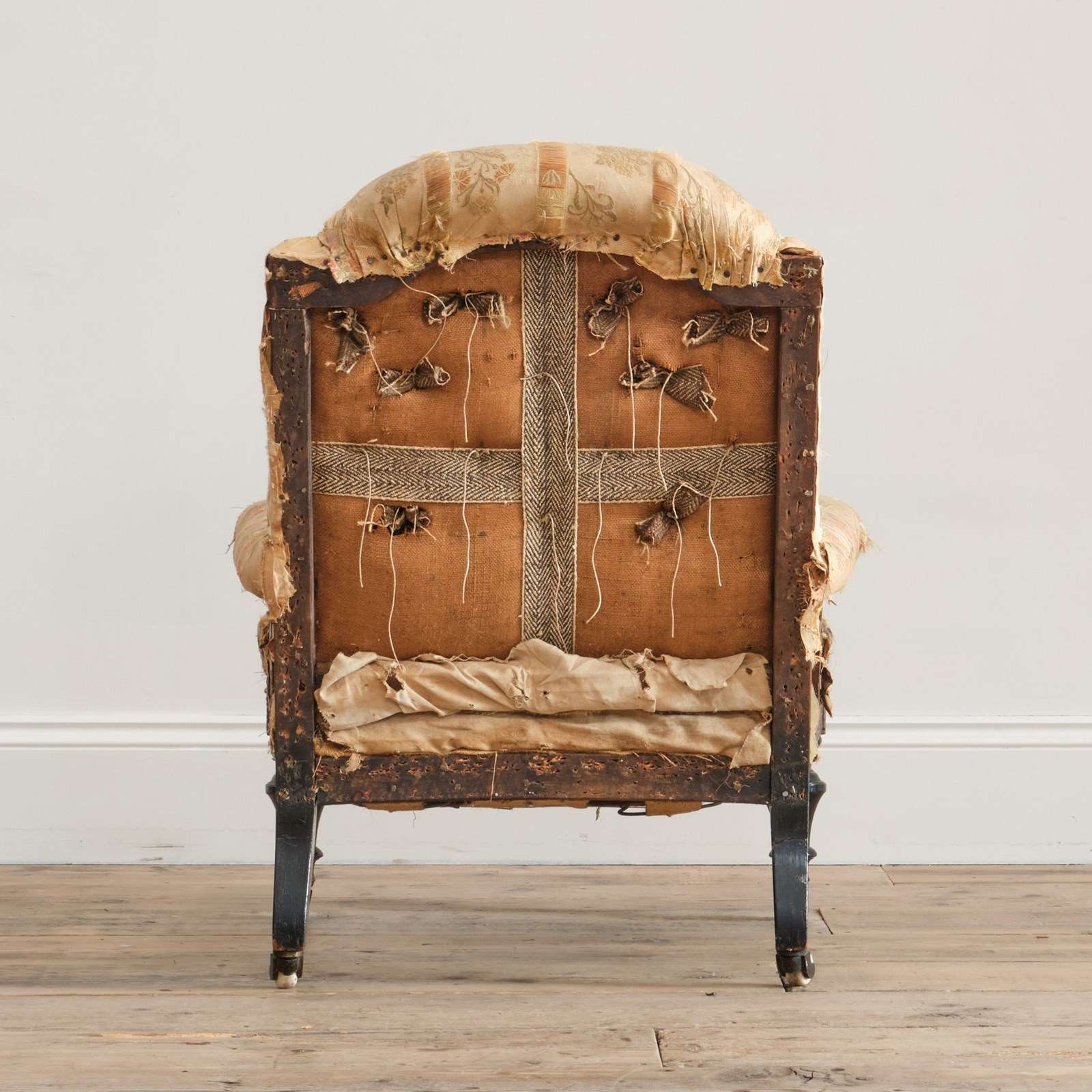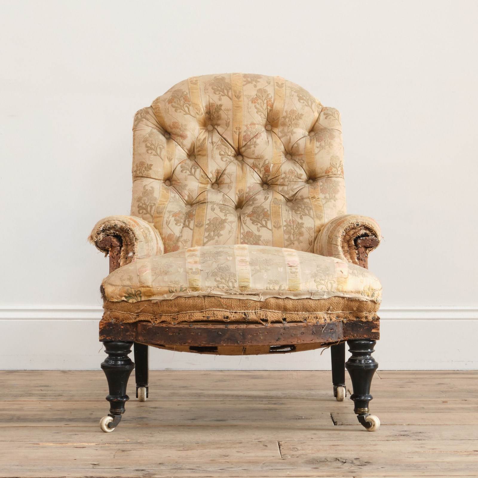 A good quality small 19th century bedroom sized armchair. Raised on turned ebonized front legs with splayed rear legs and all with the original casters. Retaining its original upholstery innards which are firm and intact.