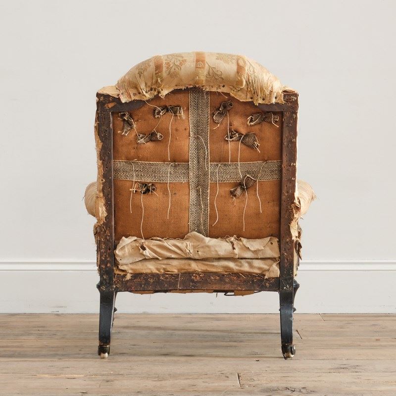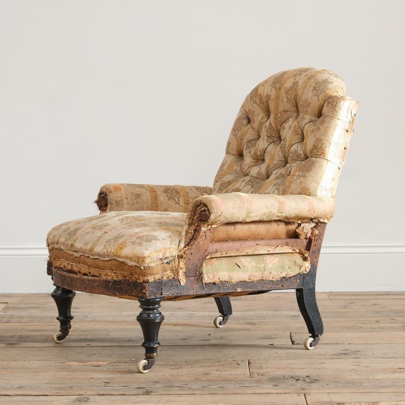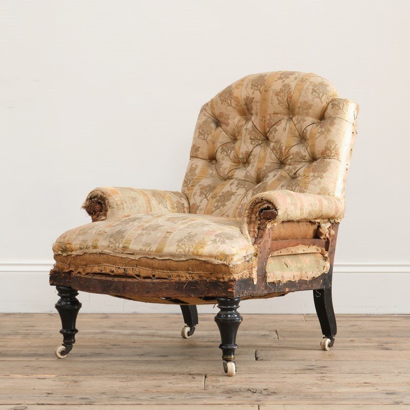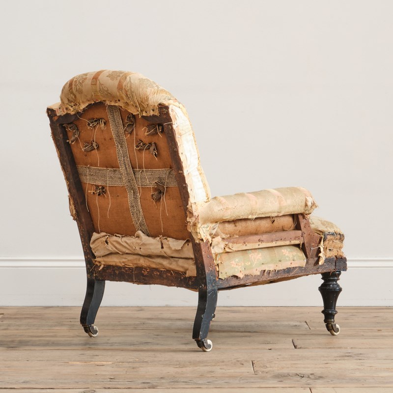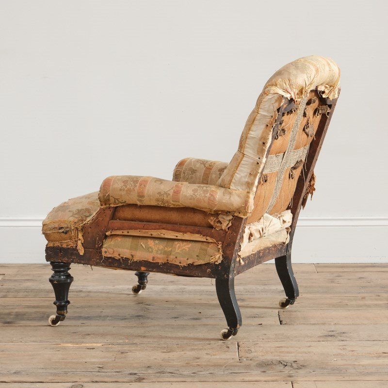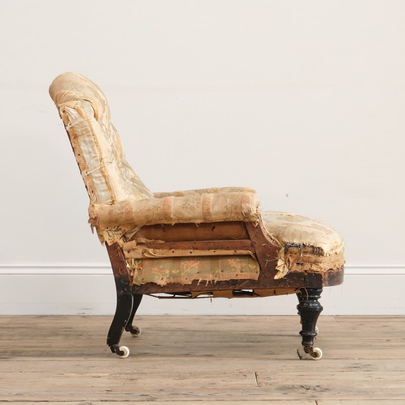 A good quality small 19th century bedroom sized armchair. Raised on turned ebonized front legs with splayed rear legs and all with the original casters. Retaining its original upholstery innards which are firm and intact.
