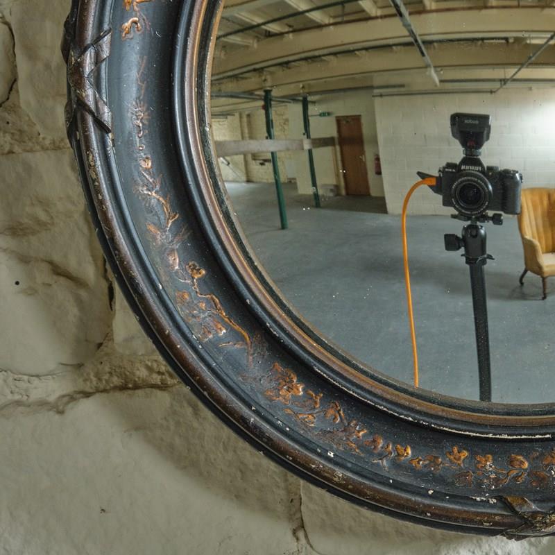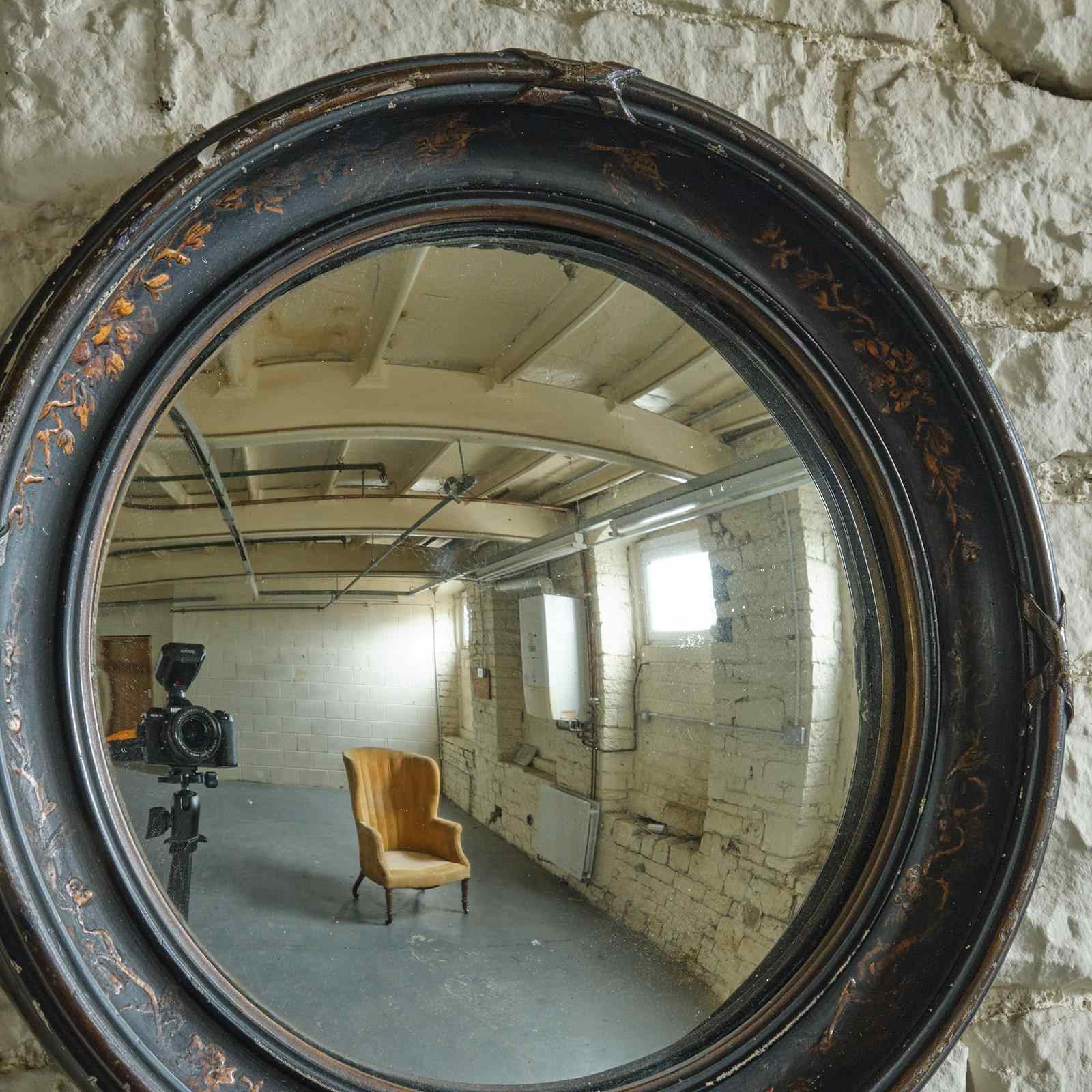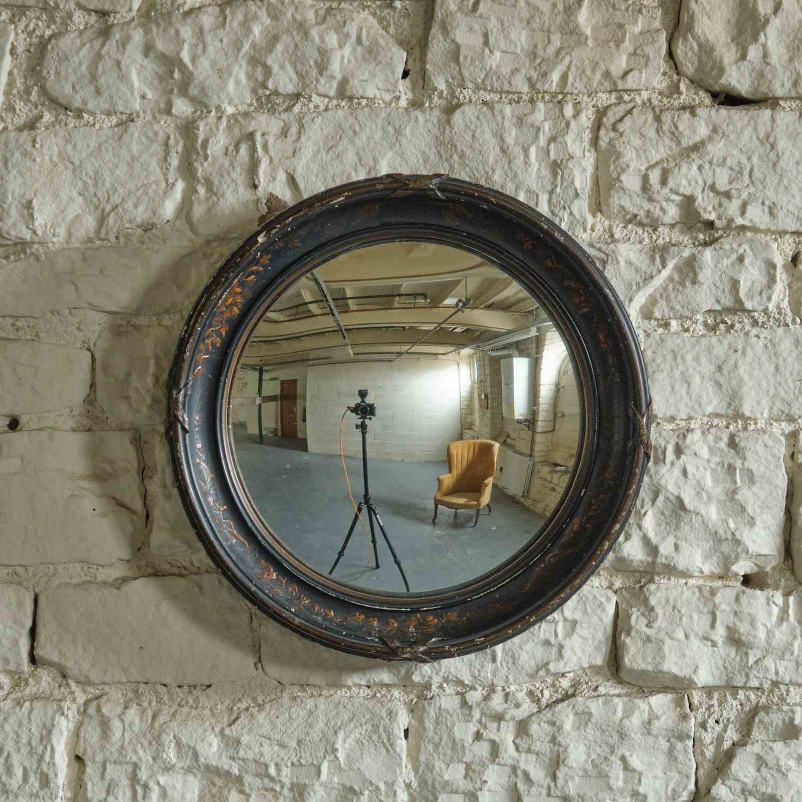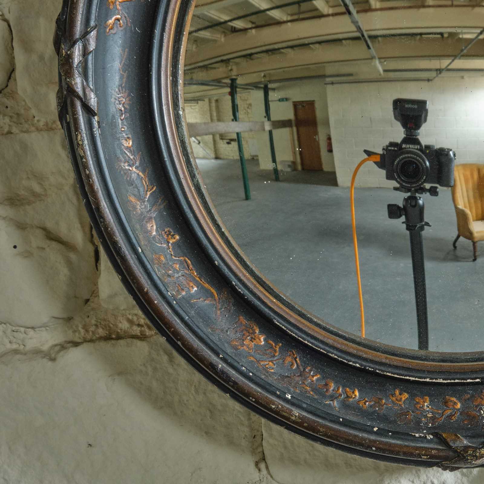 A small Regency Period black lacquered and Japanned convex mirror with gilt decoration. Retaining its original plate and back
