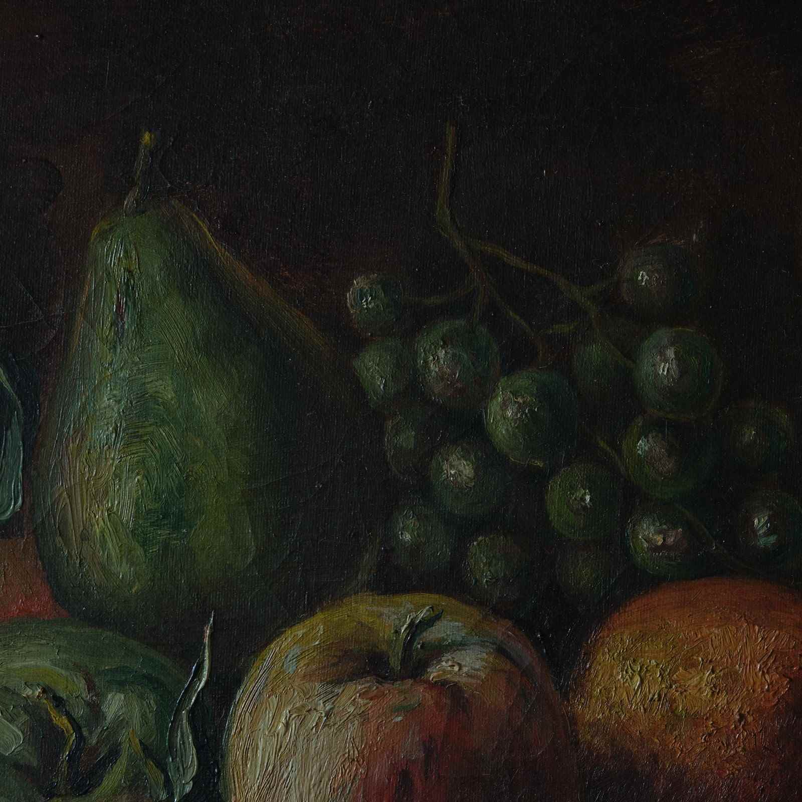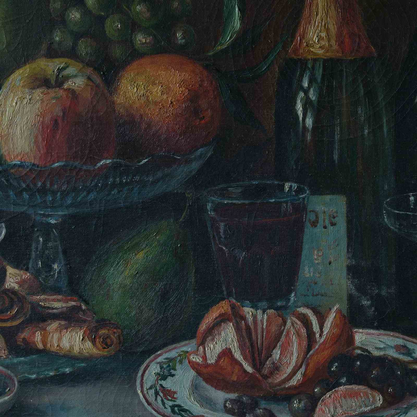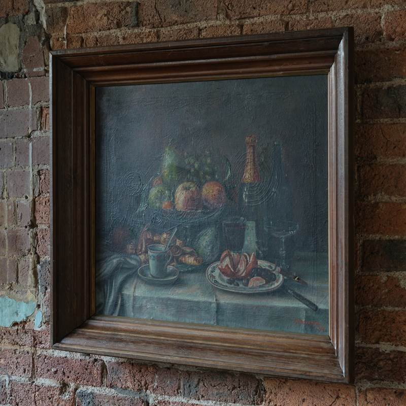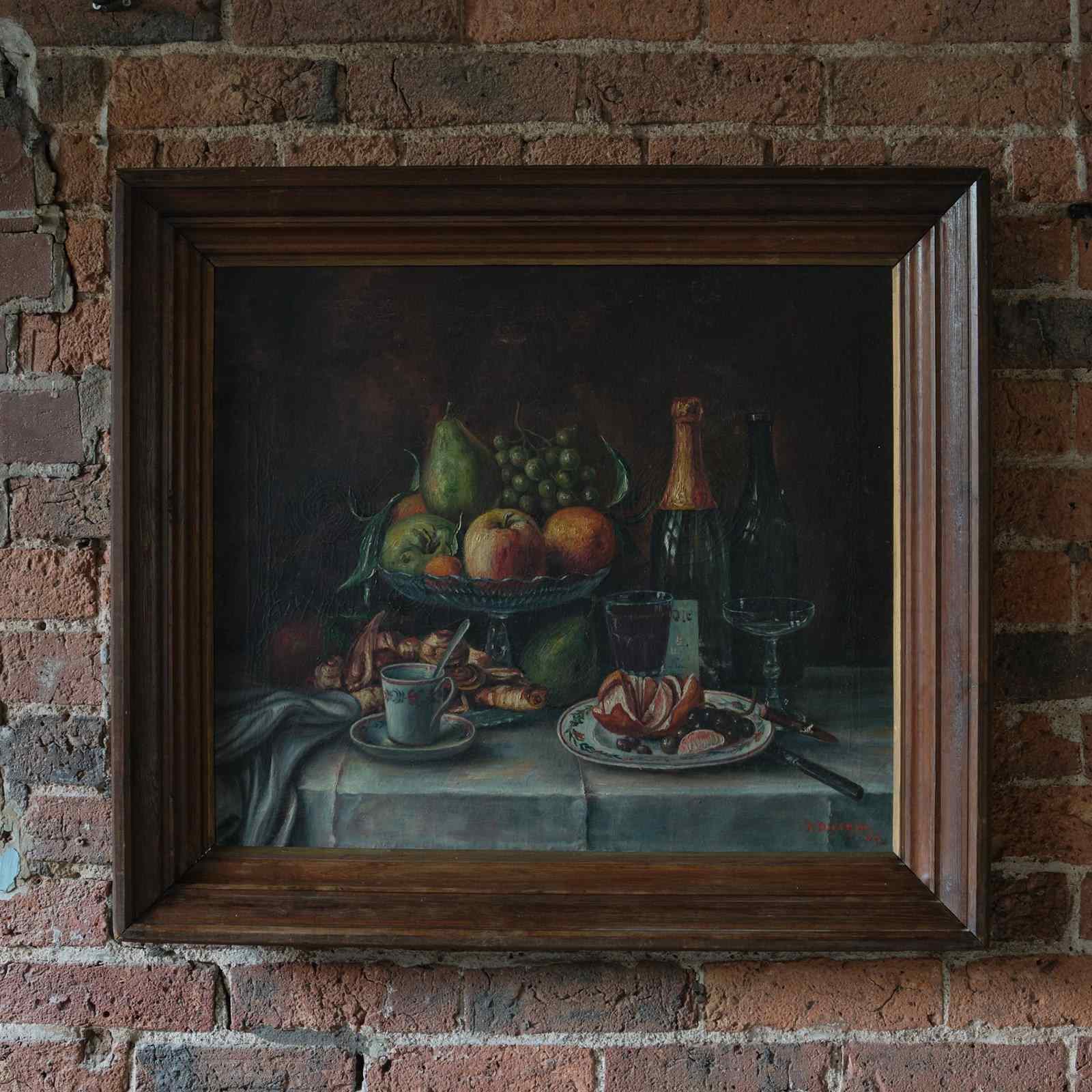 A mid 20th century signed still life oil on canvas in its original pine frame. Painted by by an experienced hand depicting a table of wines and fruit. c1947