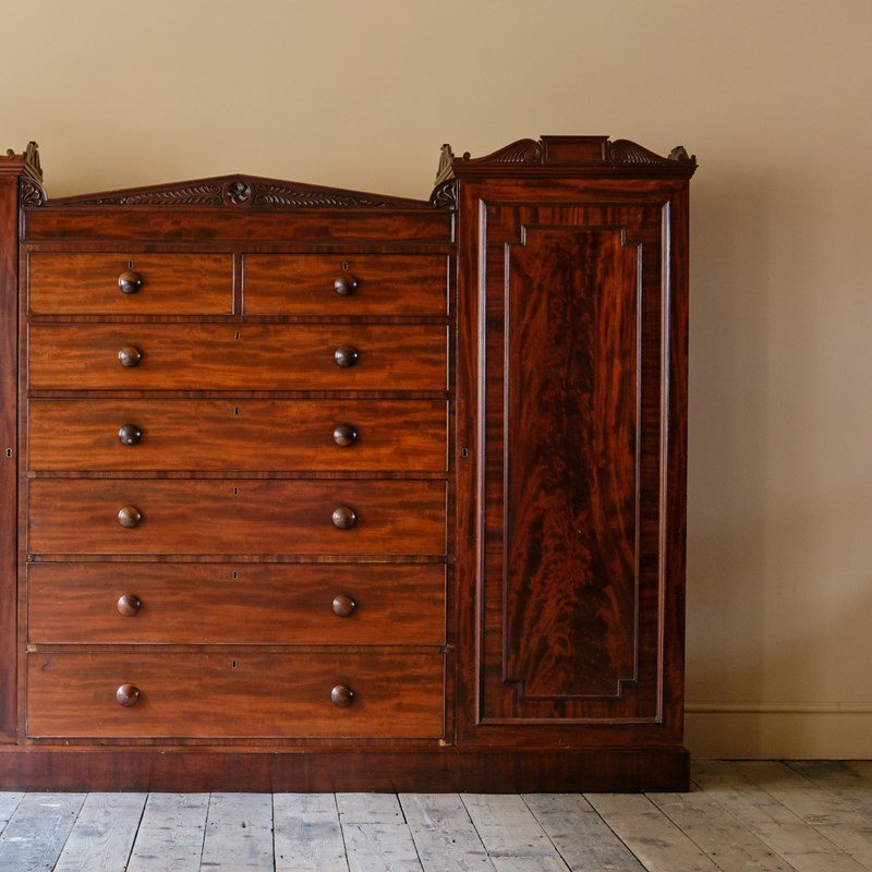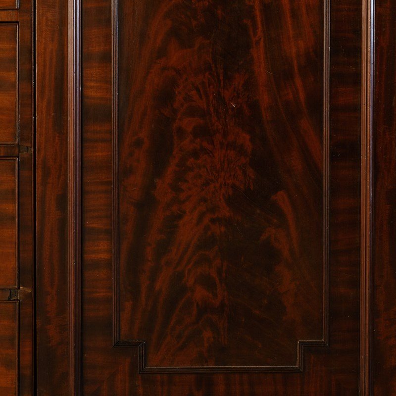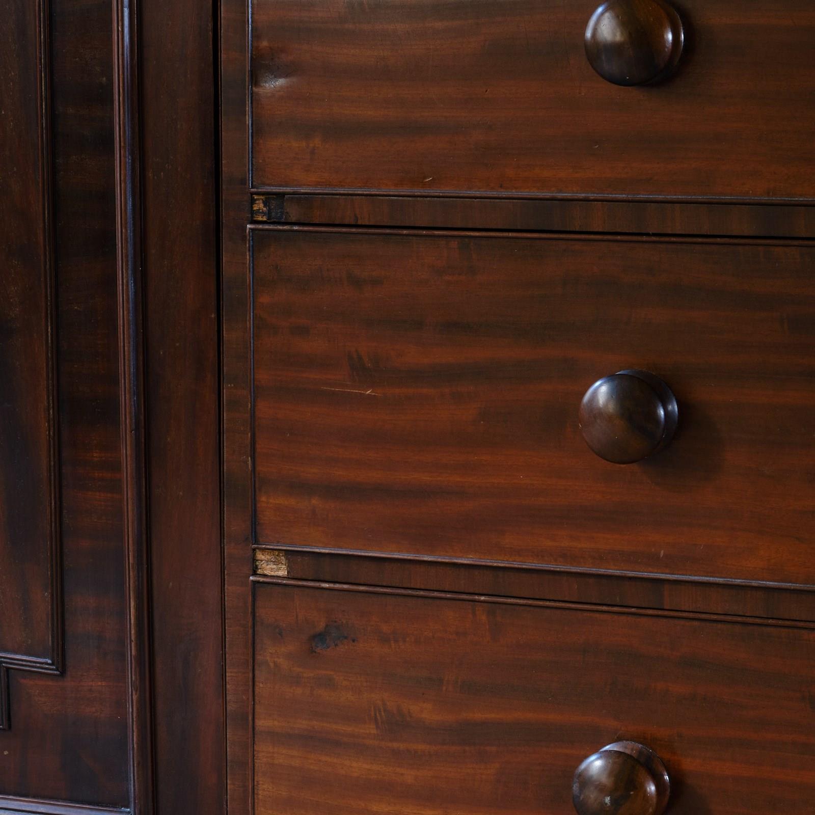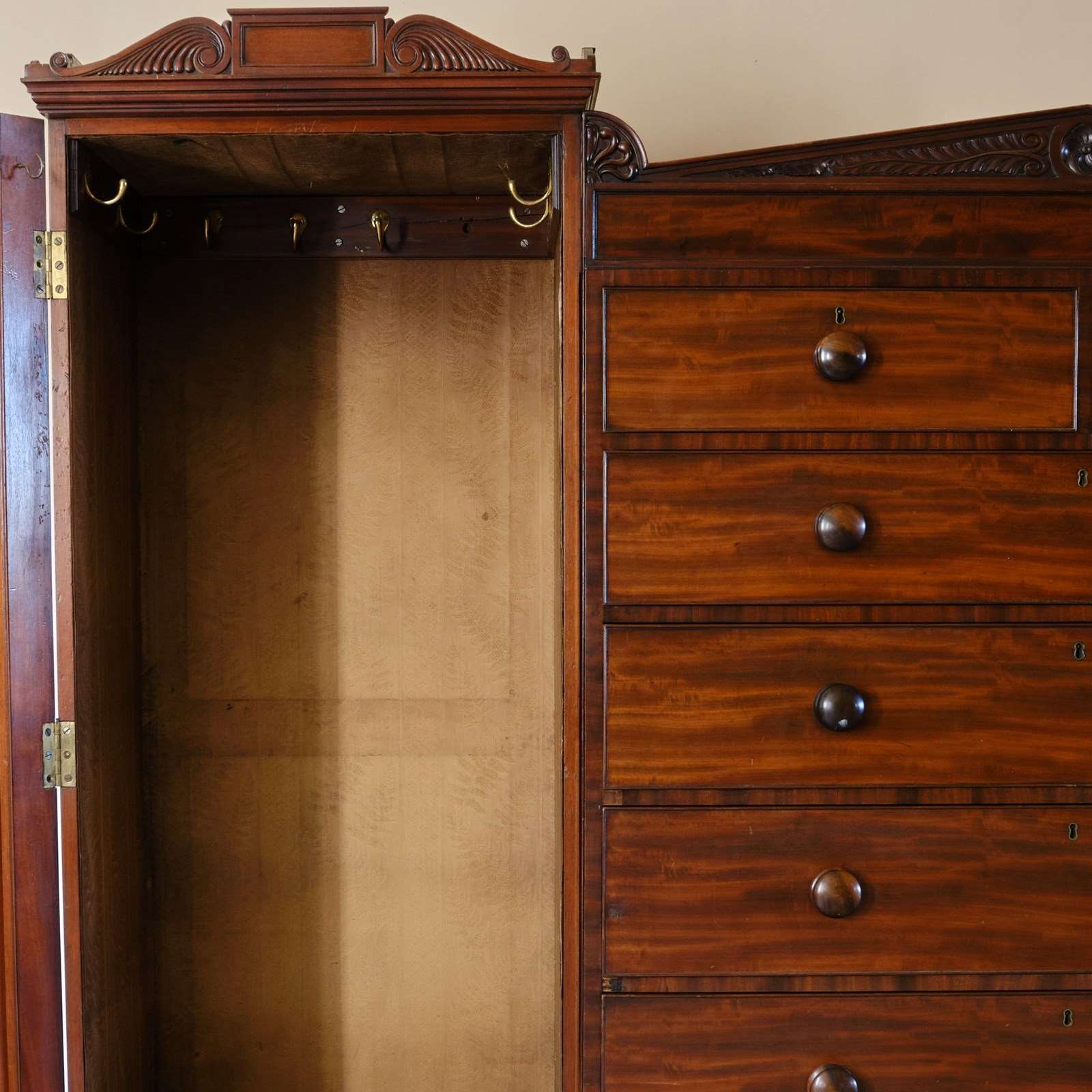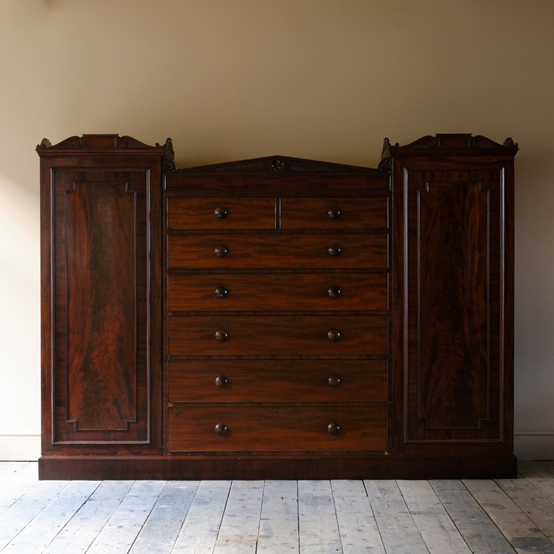 An impressive English William IV Compactum Wardrobe. With a rich colour to the flame mahogany veneer. Comprising of a central set of 7 graduated drawers, all of which retain the original turned pulls. The drawers are flanked by a tall cupboard to either side which both have the original fern fabric lined interiors and brass hooks to hang garments. All of which sit on a plinth base and all adorned with crisply carved pediments.