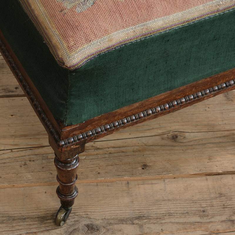 A cute little country house footstool raised on simulated Rosewood legs with the original brass casters. The pine sarcophagus shaped upper with egg and dart trim, green linen boarder and a needlework top with a pink ground below a floral design. c1835