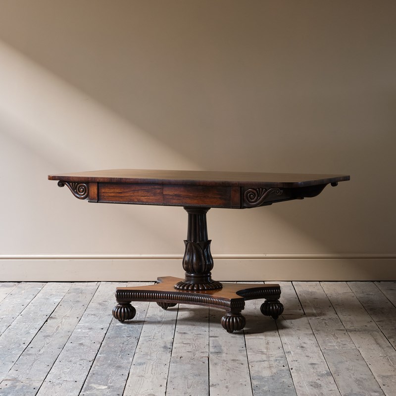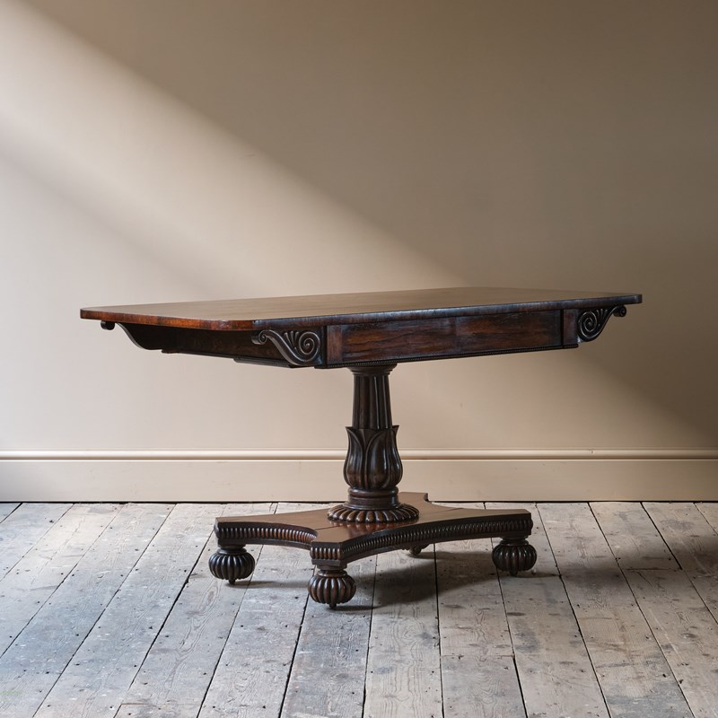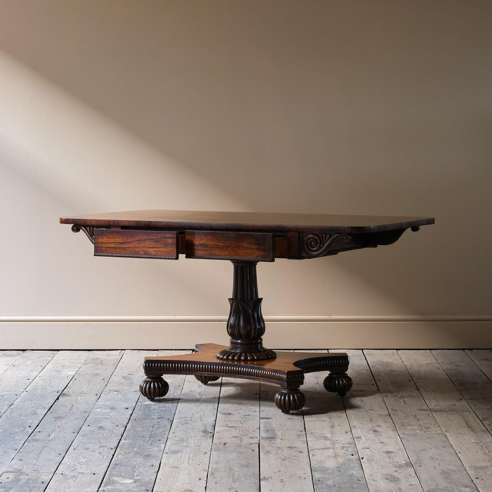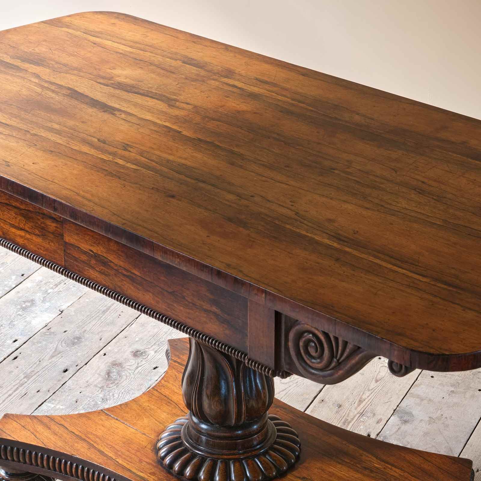 A superb country house William IV sofa table. Constructed in Rosewood. The top with wonderful colour and grain above a scrolled frieze and 2 shallow full depth drawers. Raised on a finely carved and turned pedestal base above a quatrefoil base on gadrooned bun feet with recessed casters.