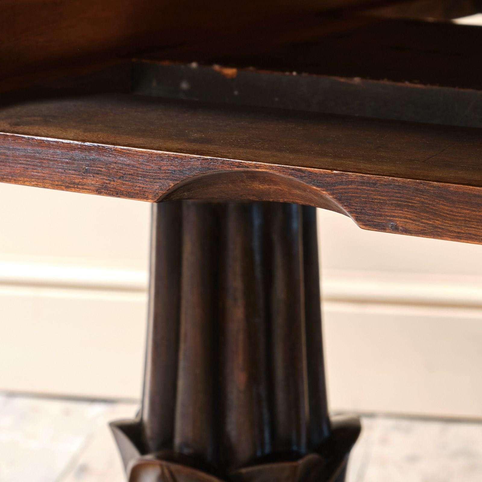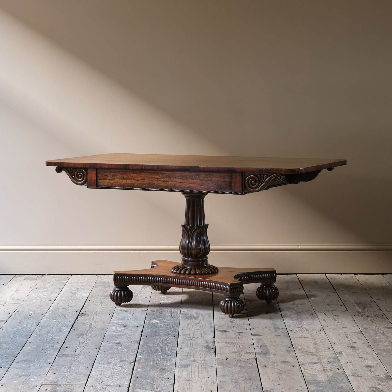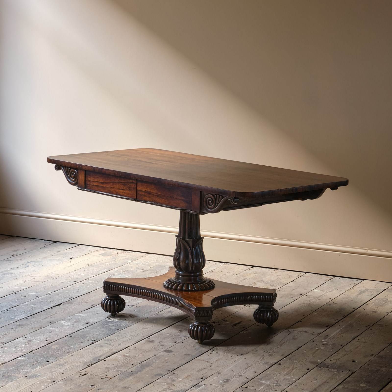 A superb country house William IV sofa table. Constructed in Rosewood. The top with wonderful colour and grain above a scrolled frieze and 2 shallow full depth drawers. Raised on a finely carved and turned pedestal base above a quatrefoil base on gadrooned bun feet with recessed casters.