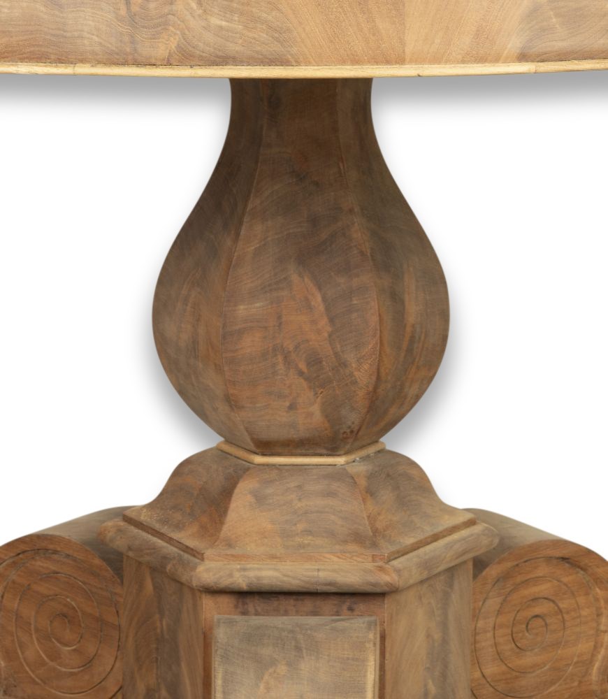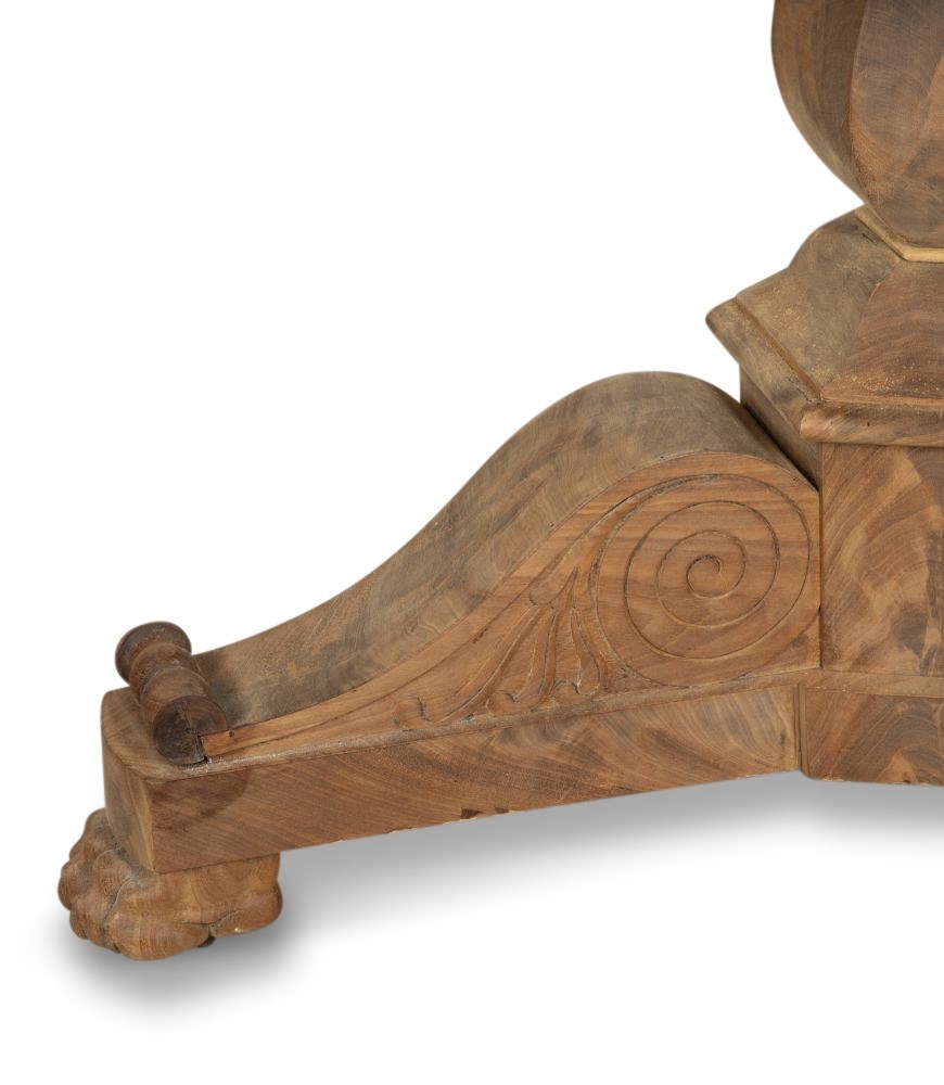 This table has been bleached to give it a unique look, showing off the flamed mahogany graining. Together with the quality marble top, it makes a superb centrepiece. Castors under stunningly carved feet supported by tulip hexagonal supports.