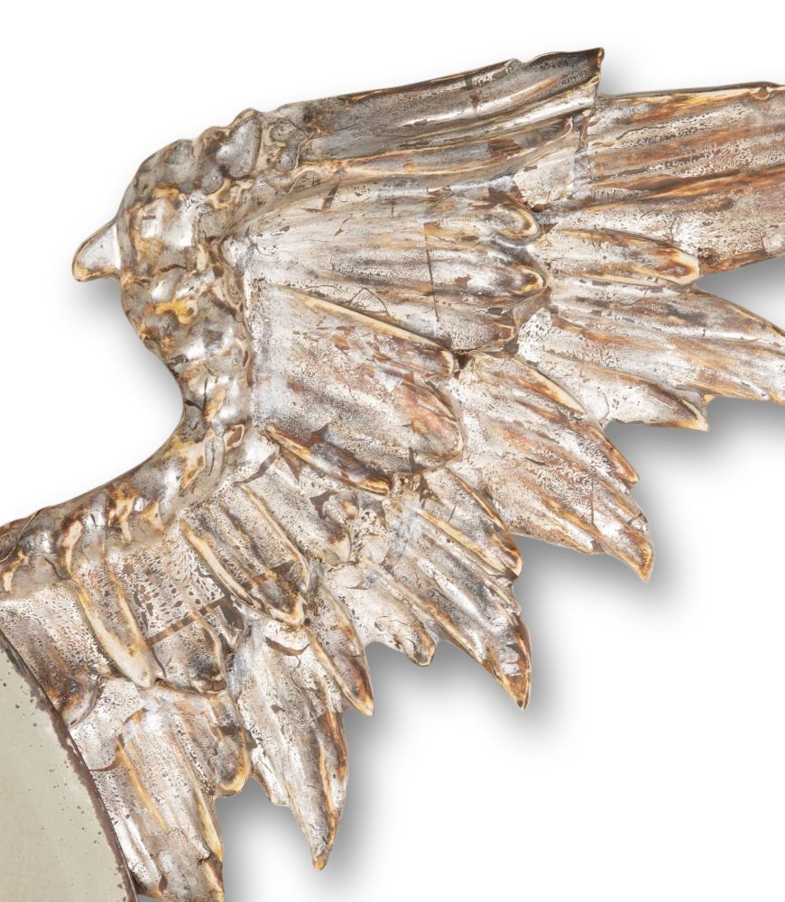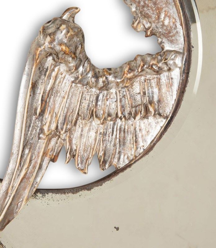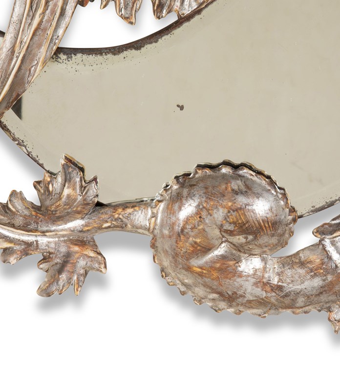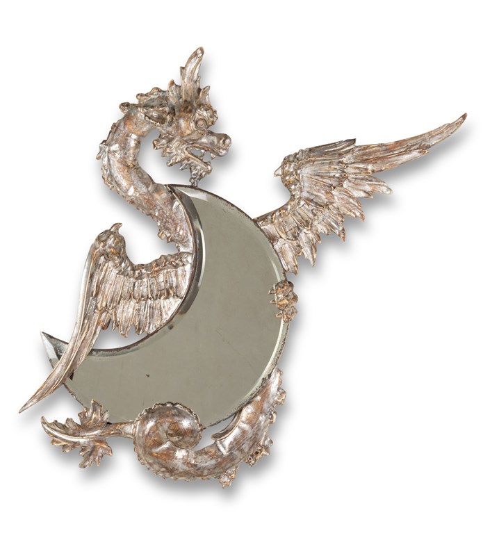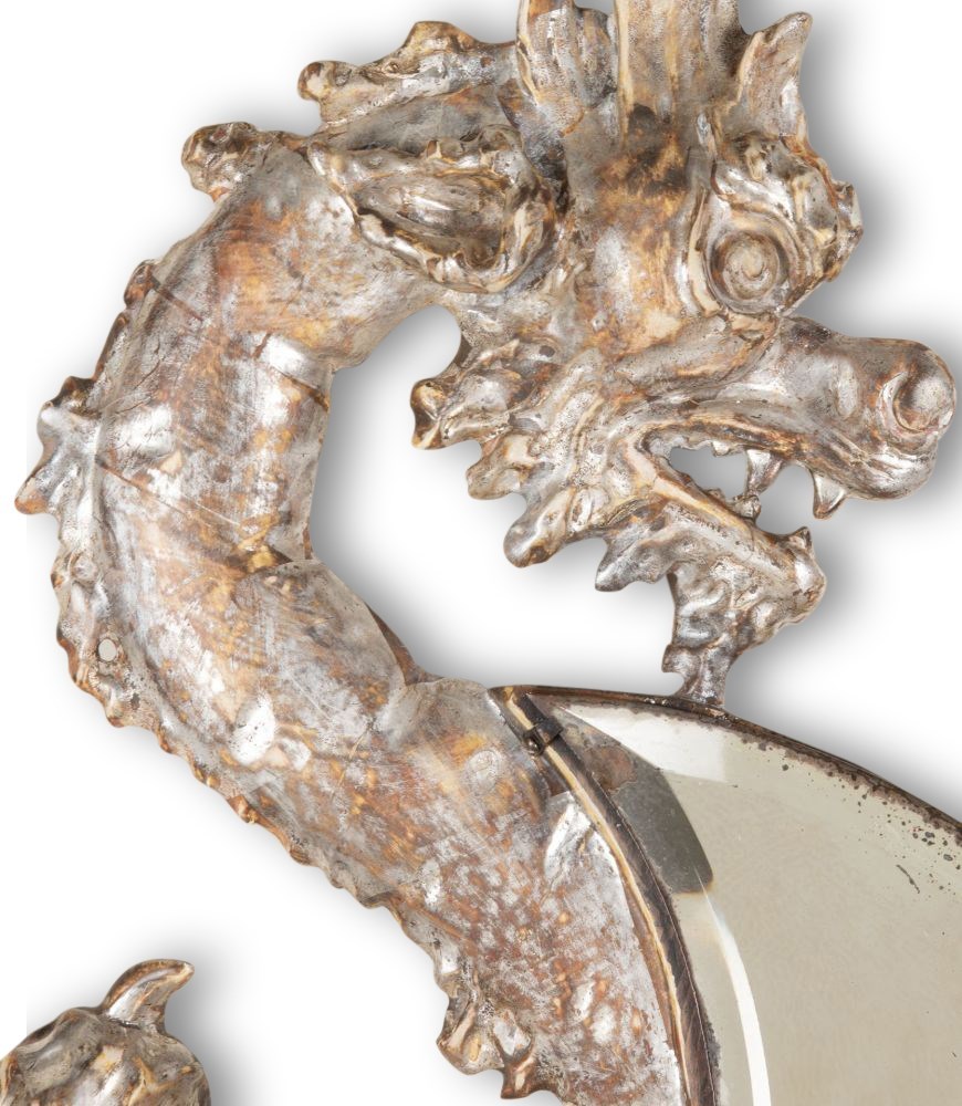 A wonderful 19th Century French highly detailed carved dragon. In silver gilding wrapped around a crescent moon shaped mirror plate with beveled edge.