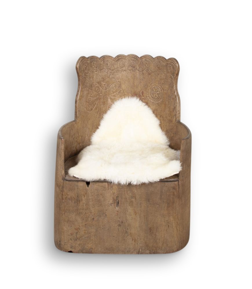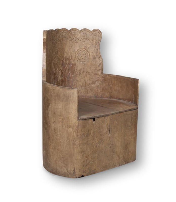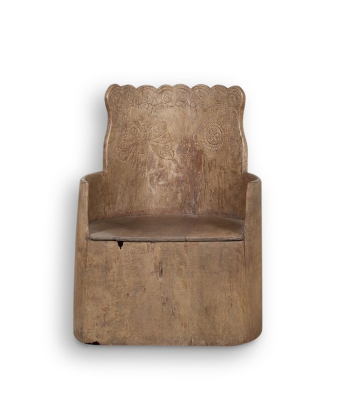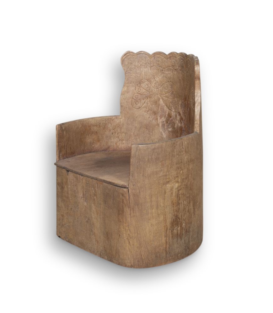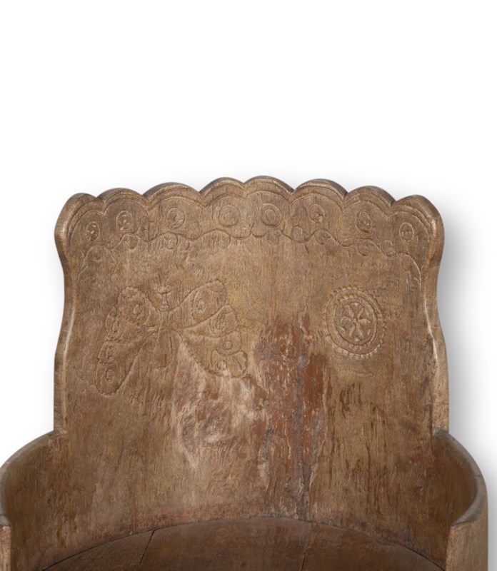 A solid armchair made from a one piece hollowed out tree trunk with subtle folk art carvings skilfully carved into the backrest. A rare and authentic piece of traditional Scandinavian craftsmanship and design now with a time worn patina.