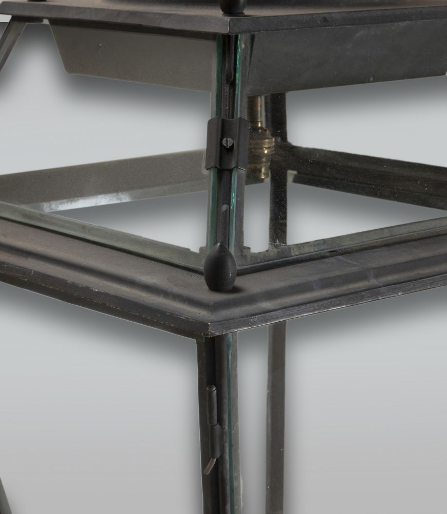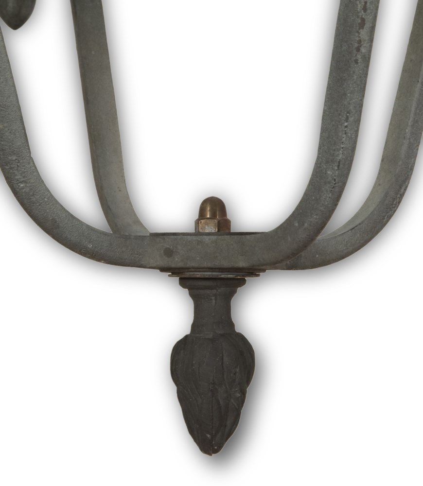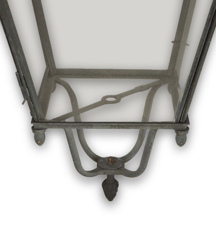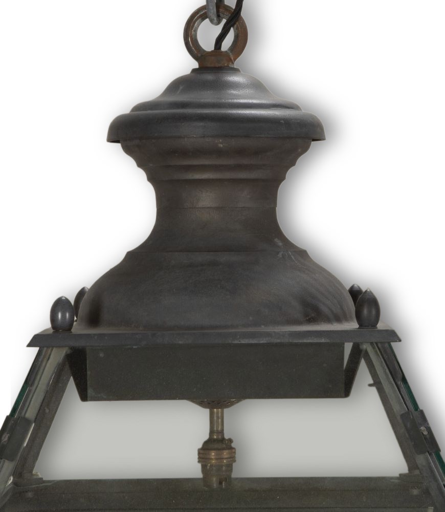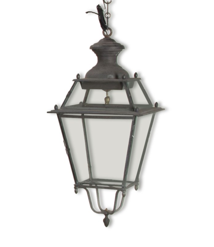 This is a fabulous fully glazed verdigris copper lantern, featuring original dated and stamped glass. With a tapered top and chain that compliments the lantern beautifully. The main body of the lantern tapers away from the top to the bottom to reach the finial.