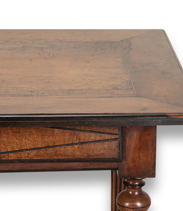 The gorgeous warm walnut top showing patina and wear from the centuries. It is supported by stylish carved legs and a cross stretcher. There is also a long drawer making this into a very useful piece of true antique furniture.