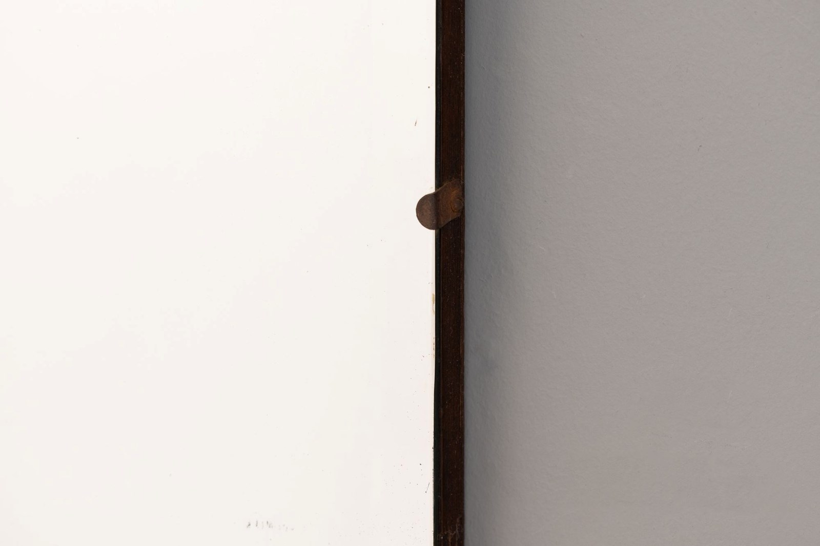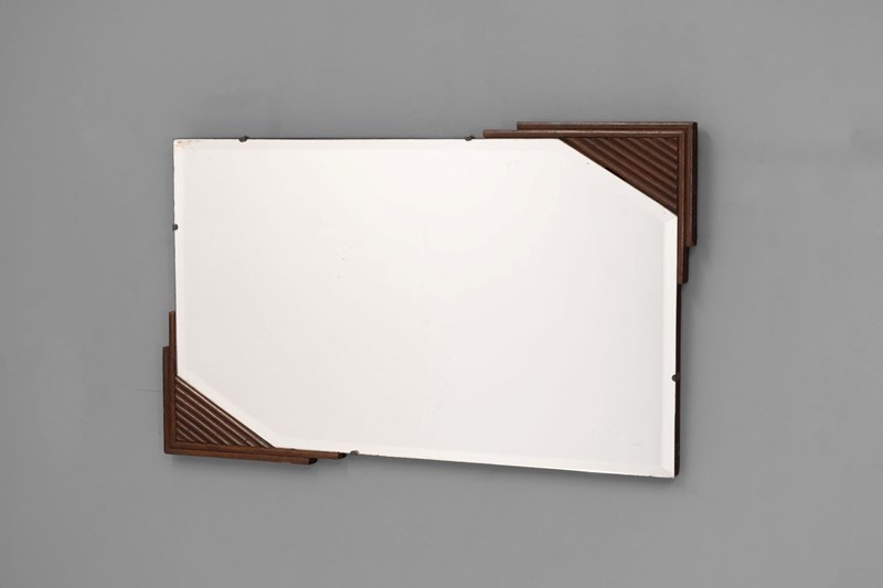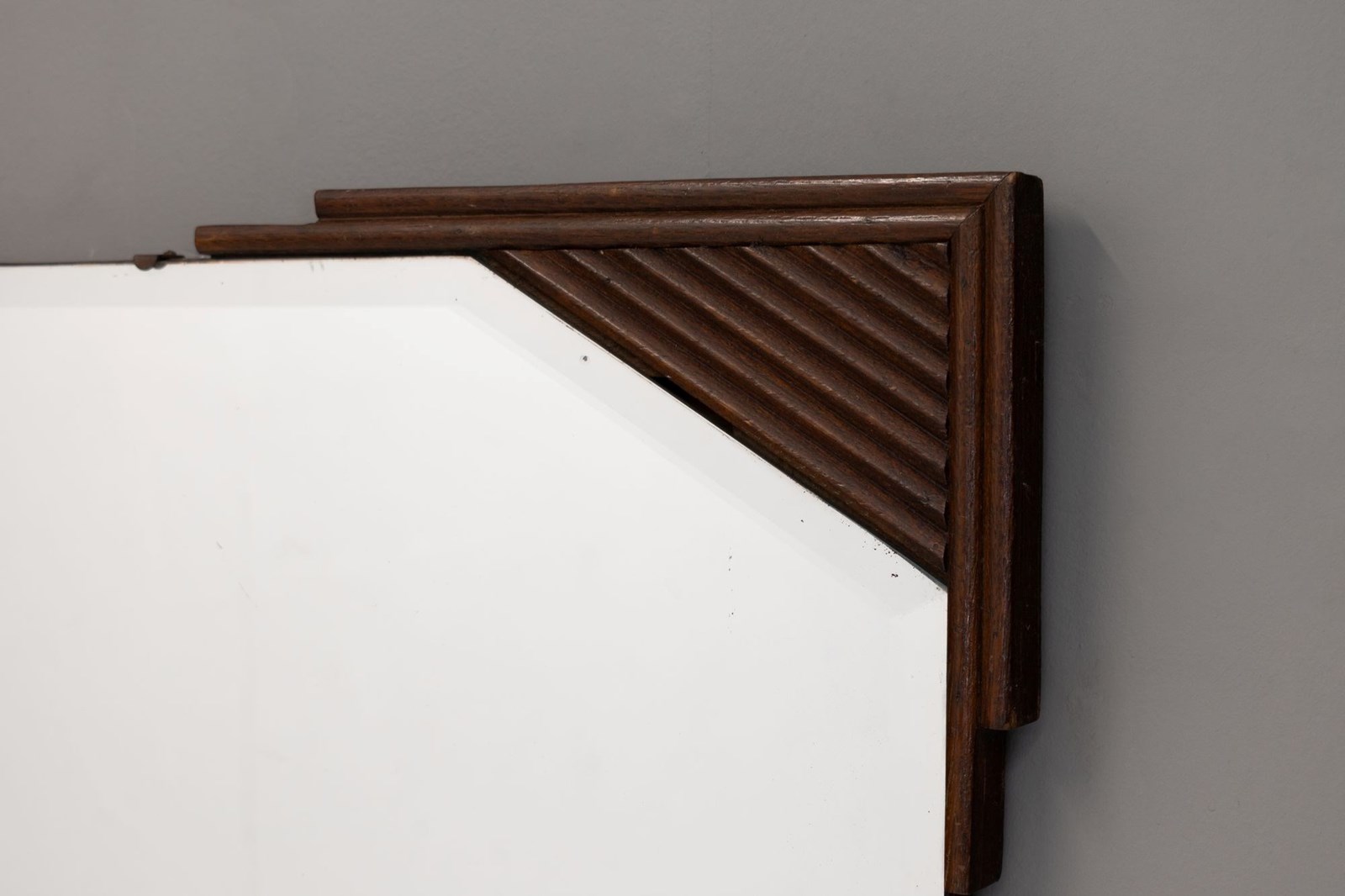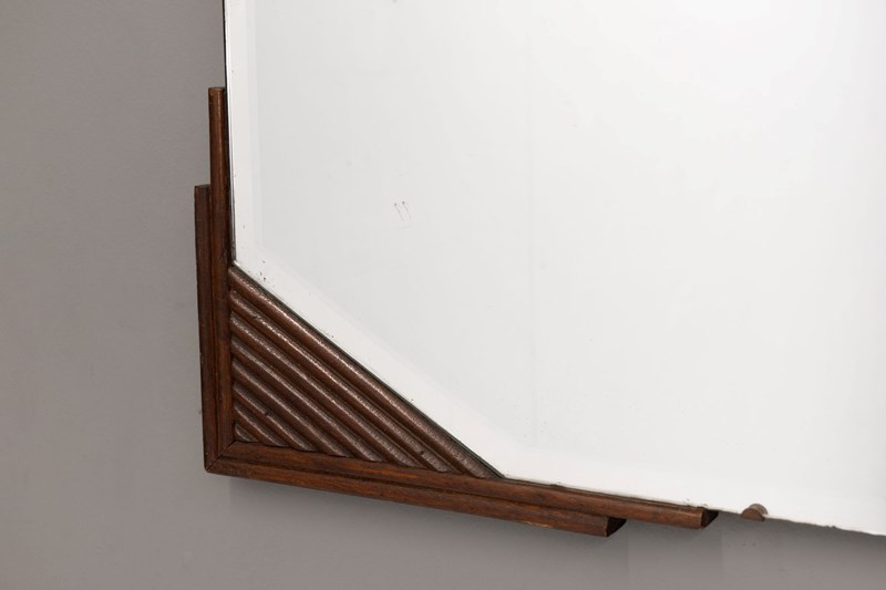 Art deco frameless wall mirror with oak banding on two corners. U.K circa 1930.