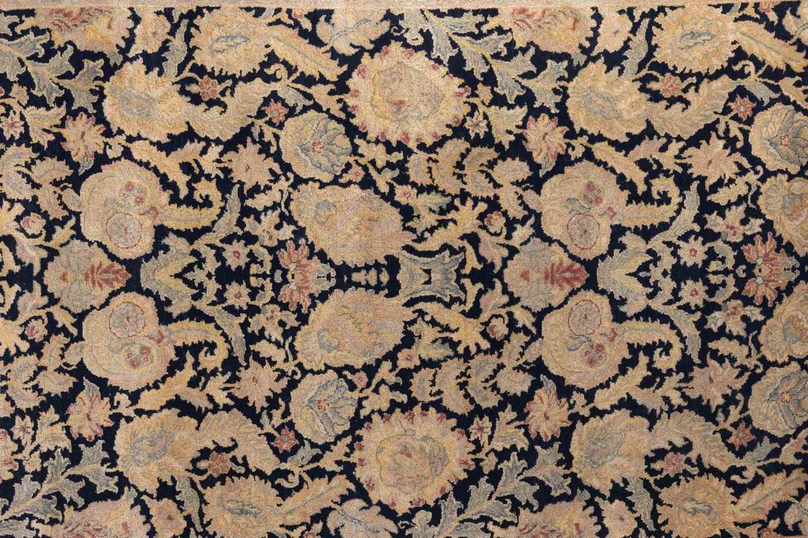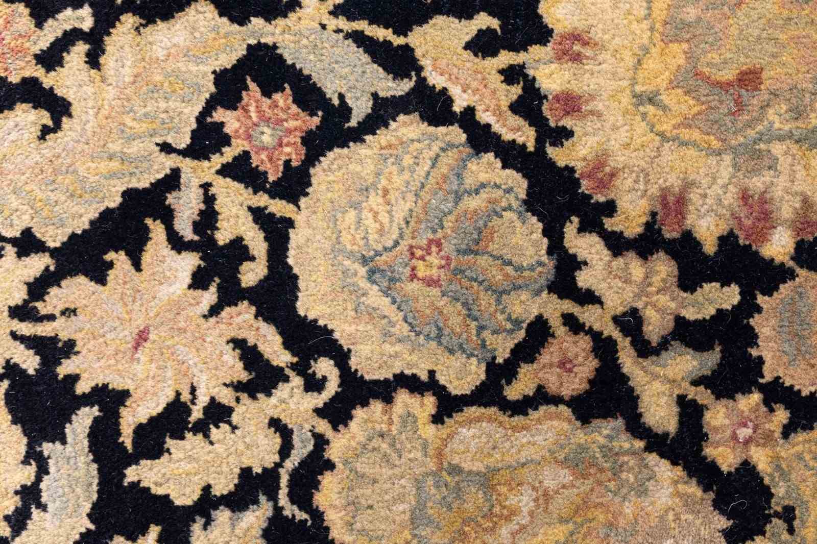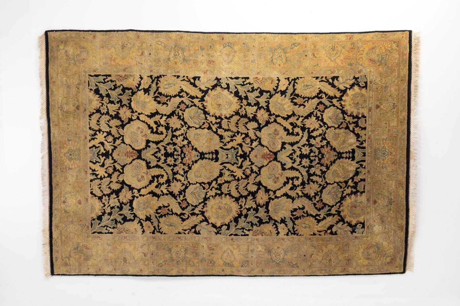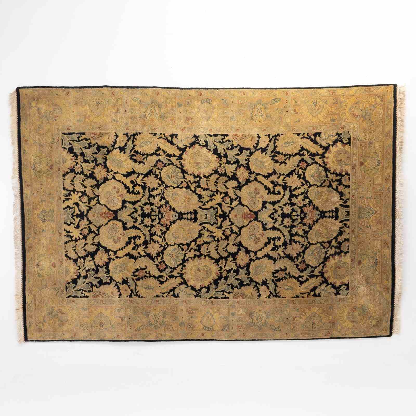 Vintage rug with a floral motif in black and gold wool and silk. Turkey circa 1950.