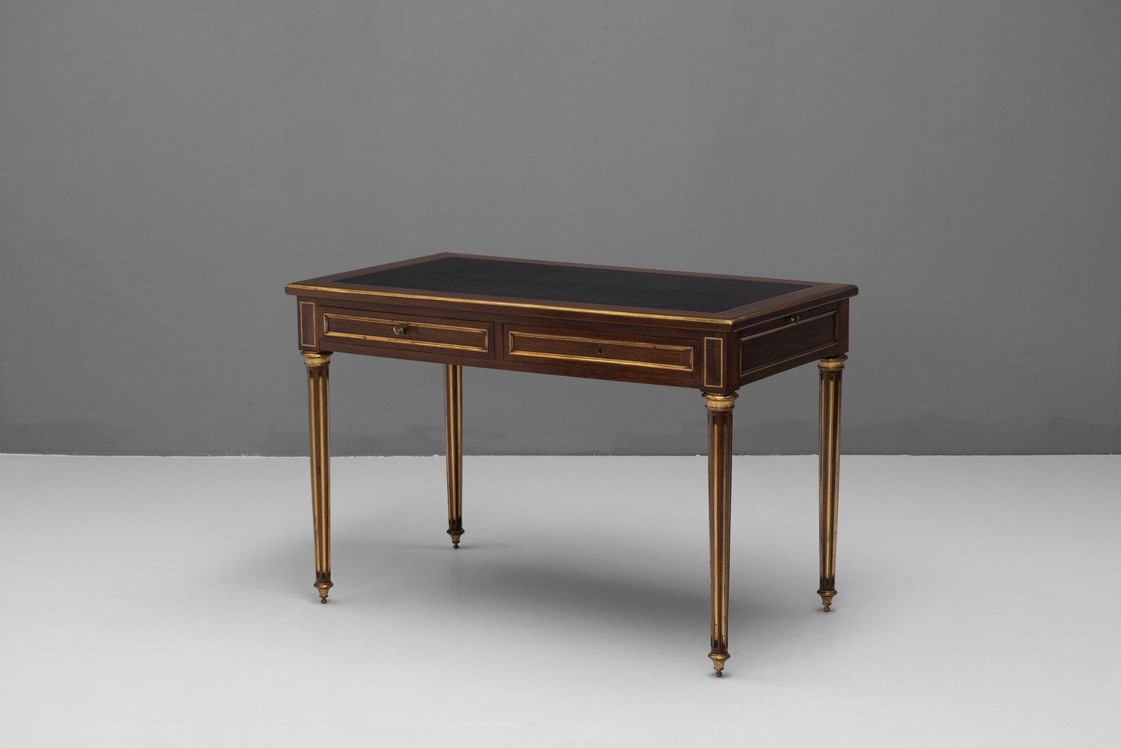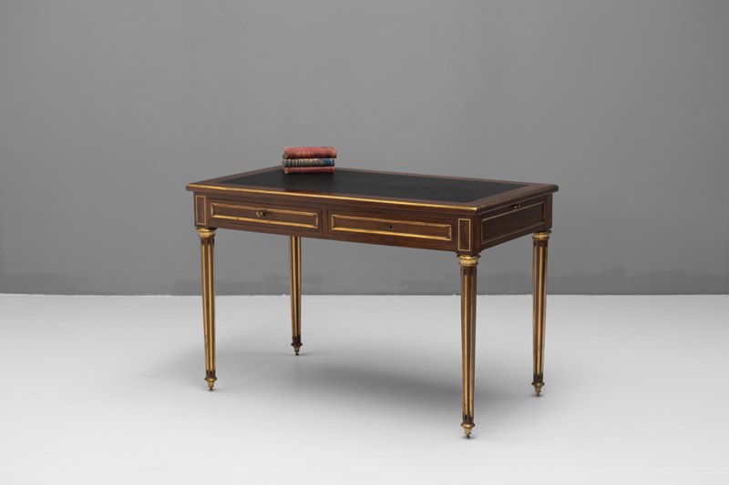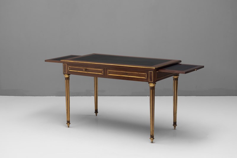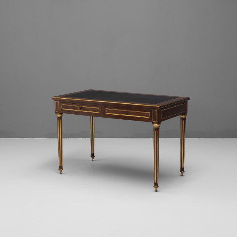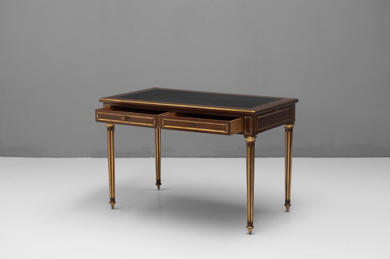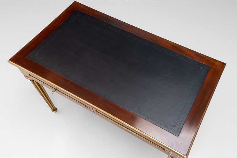 French mahogany brass bound bureau plat with pull out slides. Circa 1890.
