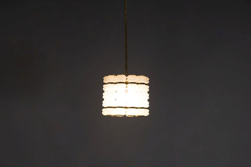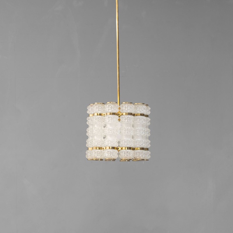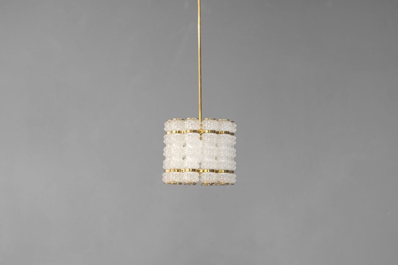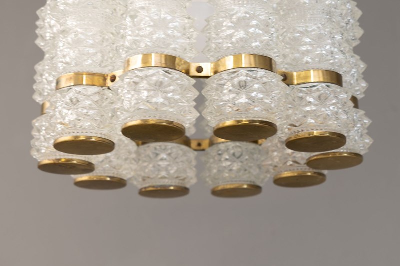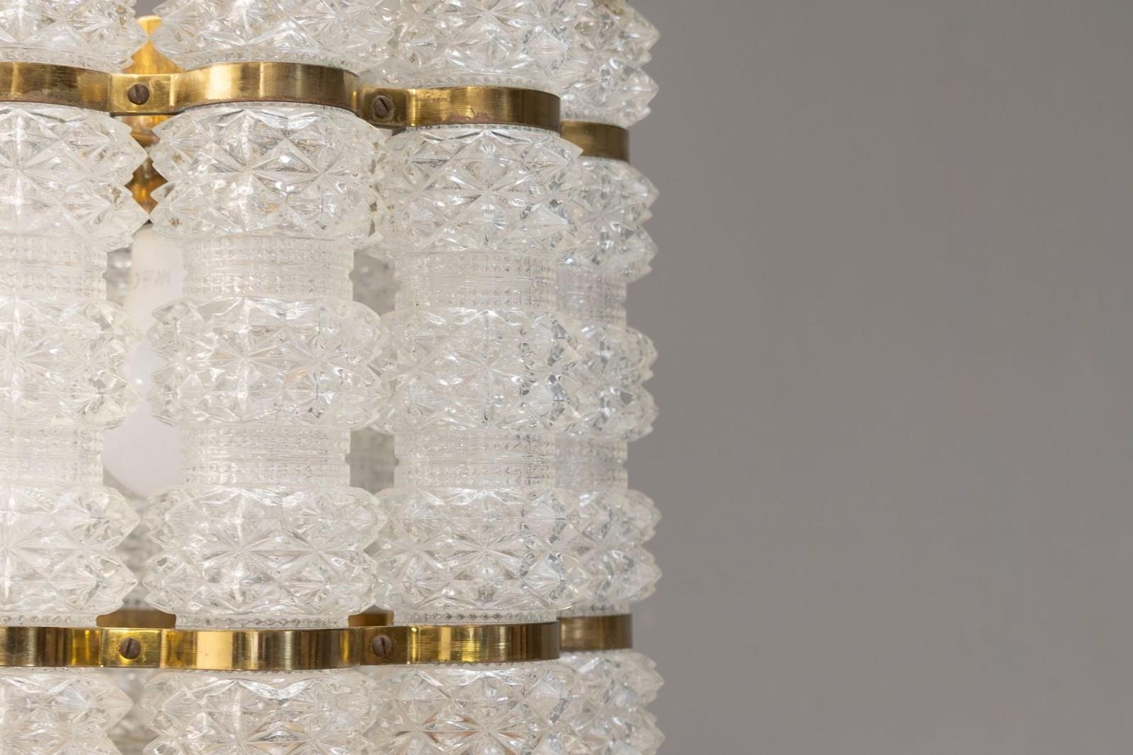 Crystal & Brass Pendant by Tyringe Konsthantverk. Glass produced by Orrefors. Rewired. Sweden circa 1960.