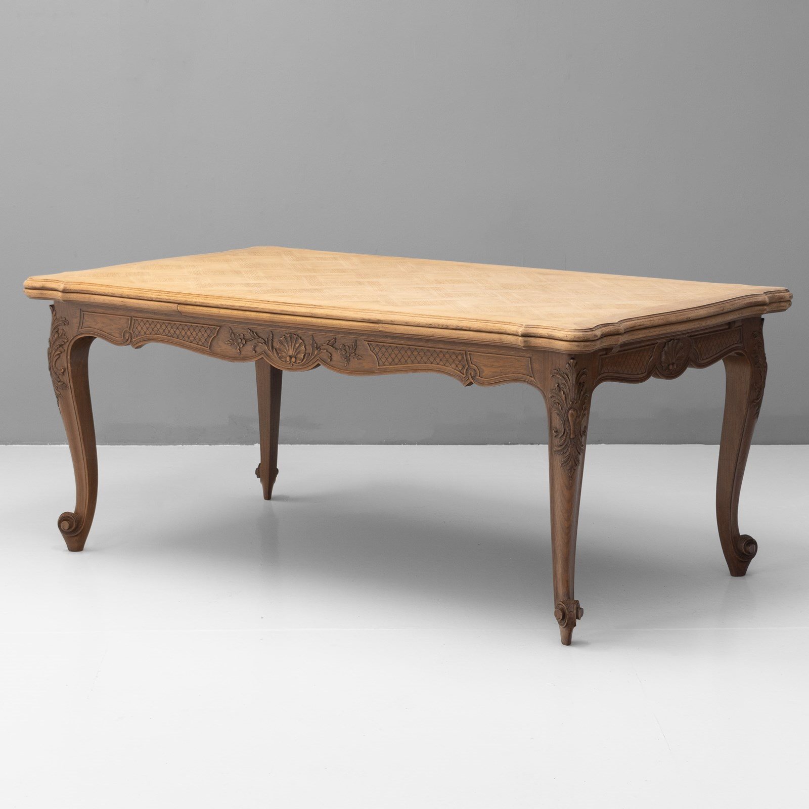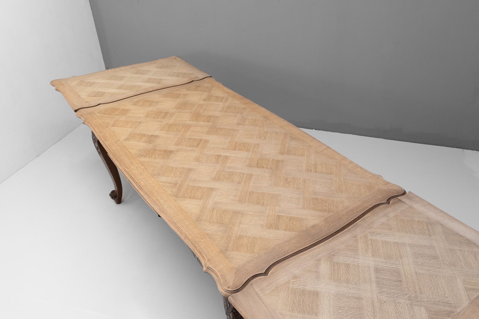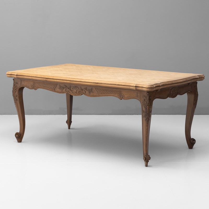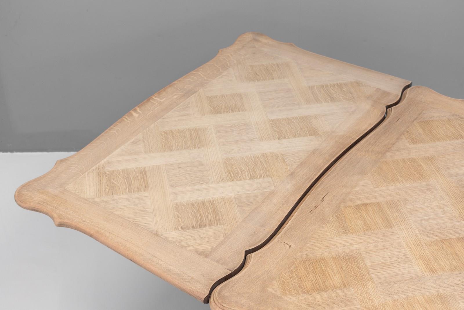 French oak draw leaf table with two pull-out extension leaves with parquet panelled top. Circa 1930.