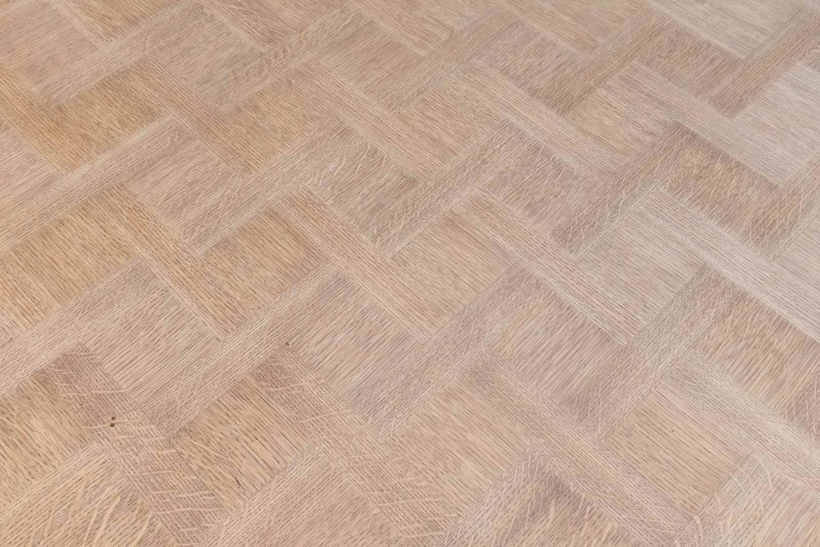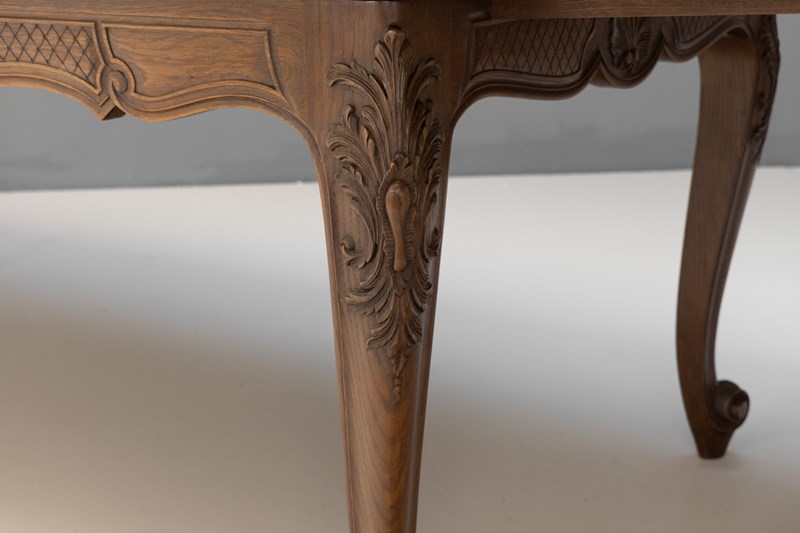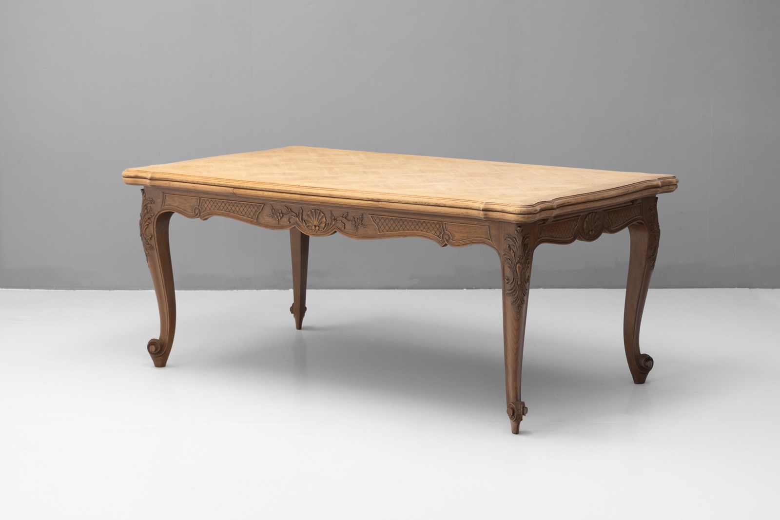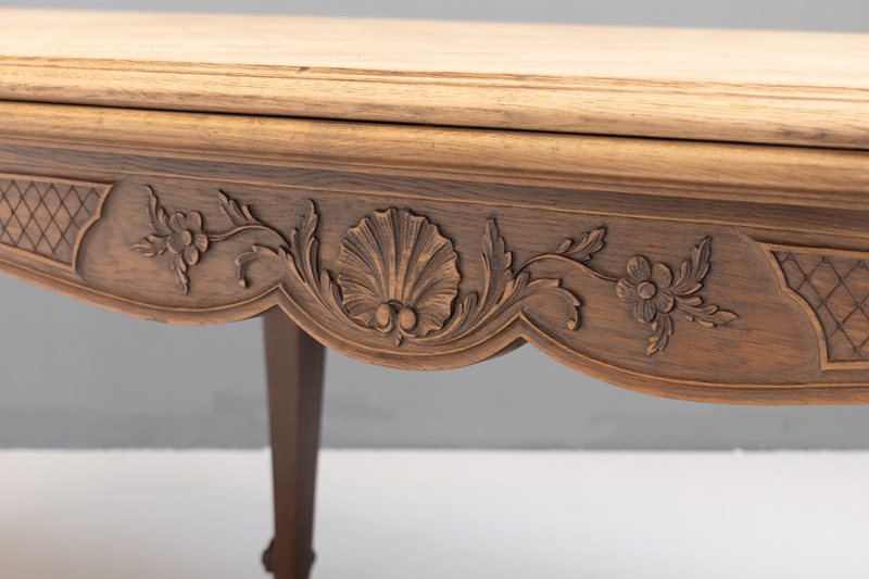 French oak draw leaf table with two pull-out extension leaves with parquet panelled top. Circa 1930.