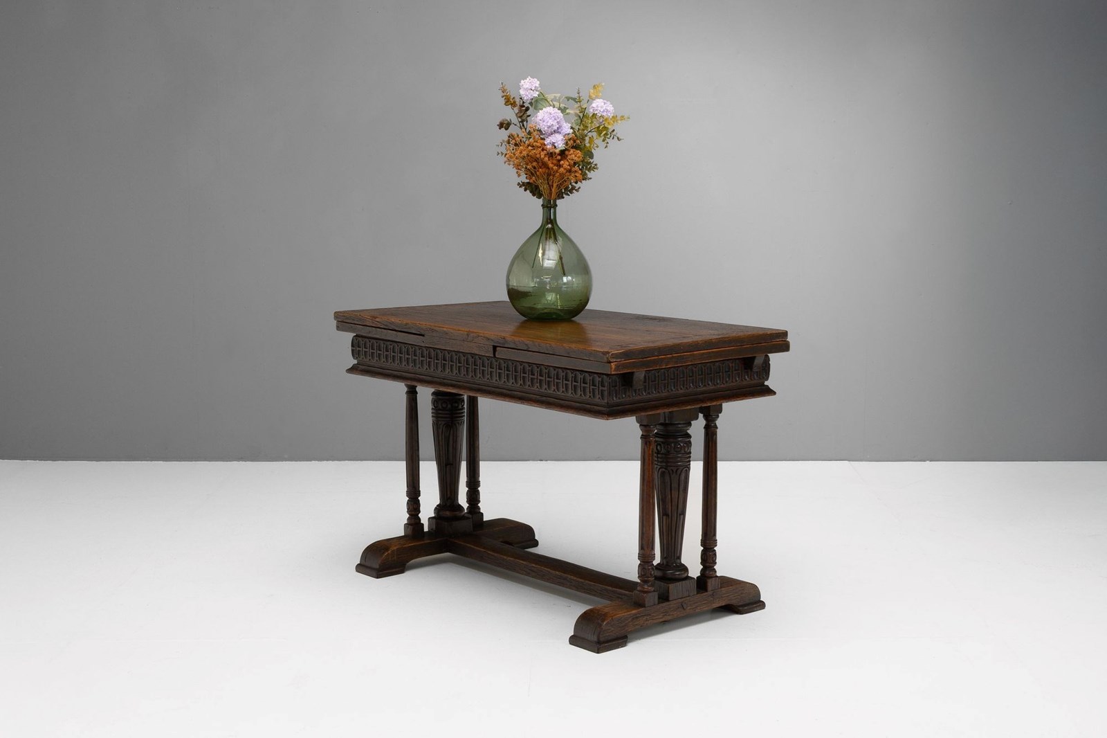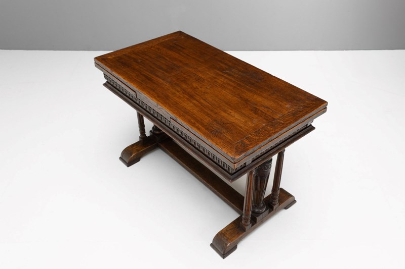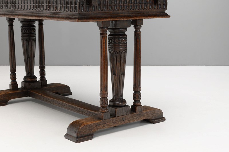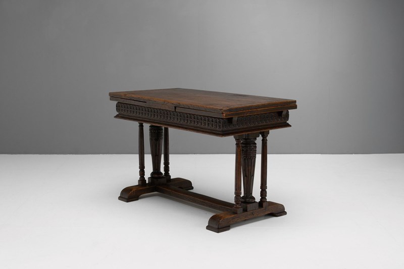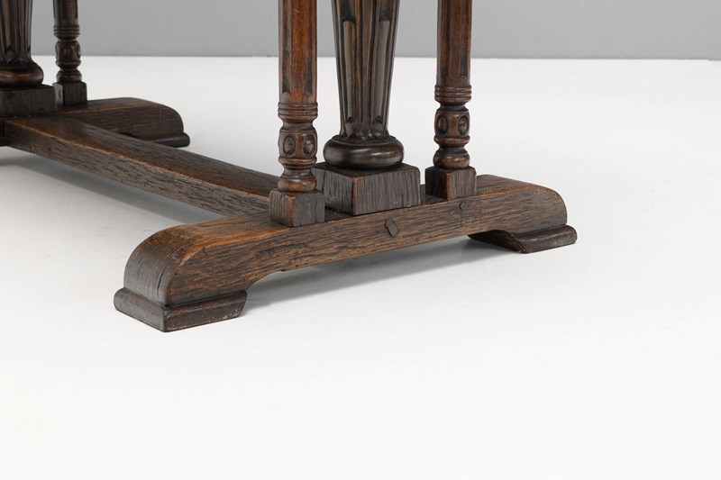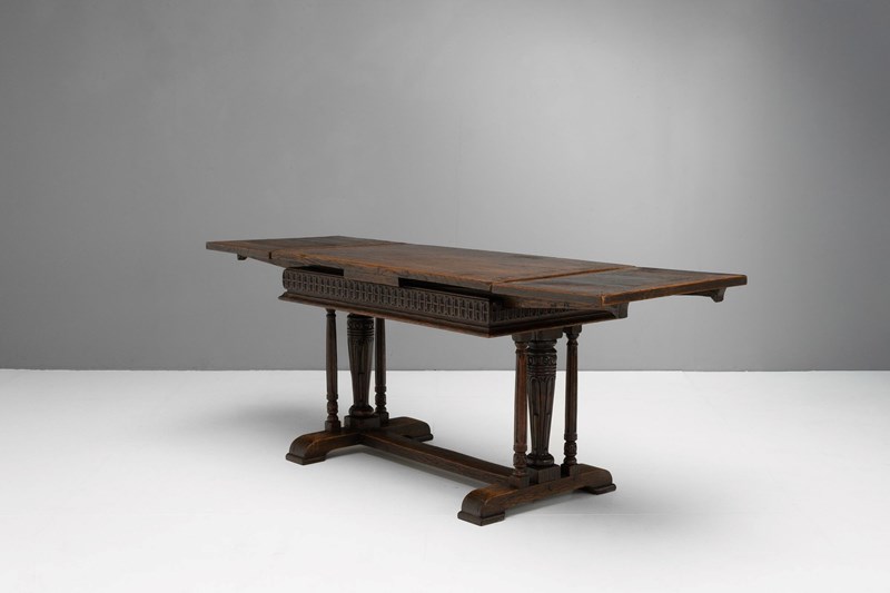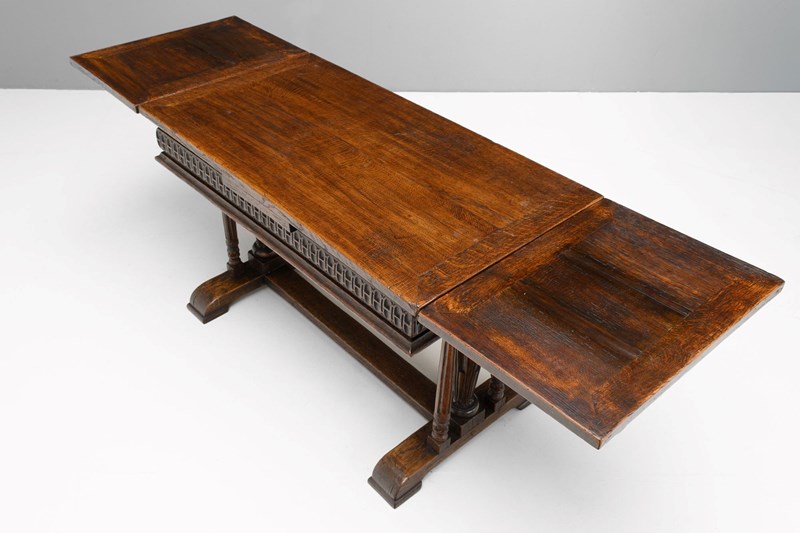 Oak draw leaf table on trestle base with pull out leaves. U.K circa 1900.