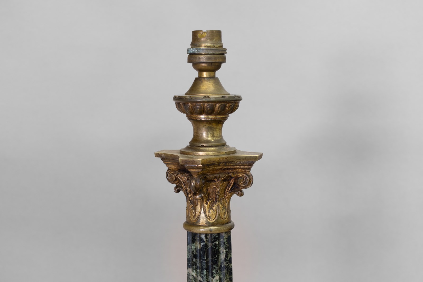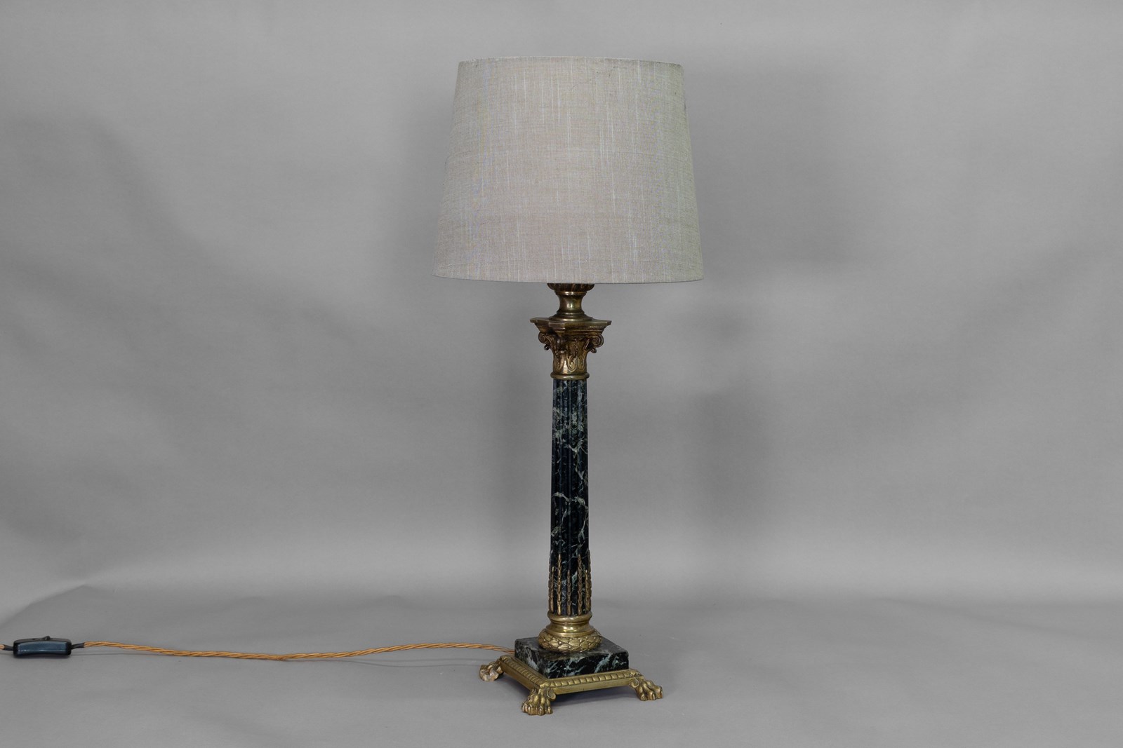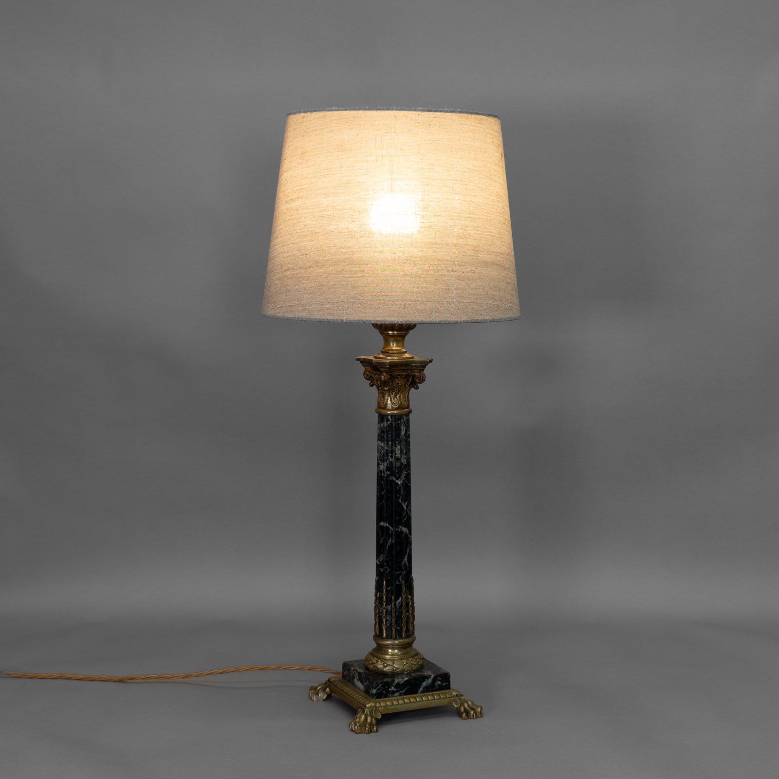 Brass desk lamp with green reeded marble column and Corinthian capital. Circa 1930