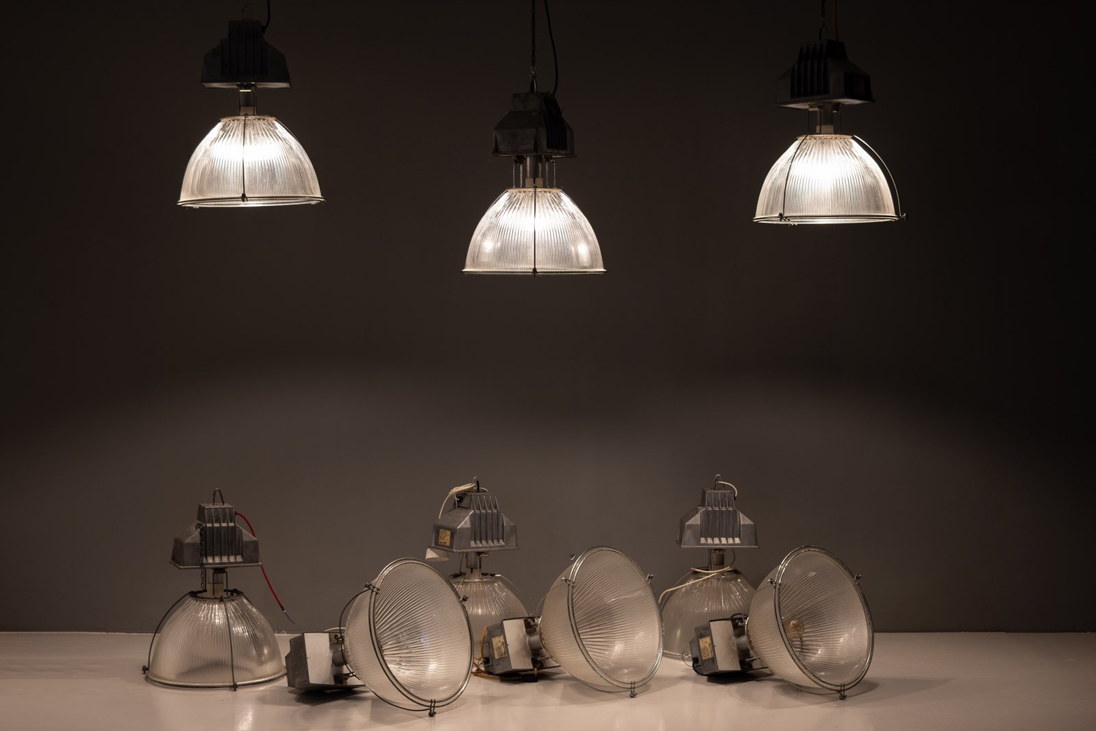 Run of 11 large industrial holophane glass pendant lamps. Good working condition. U.K circa 1980. Priced individually.
