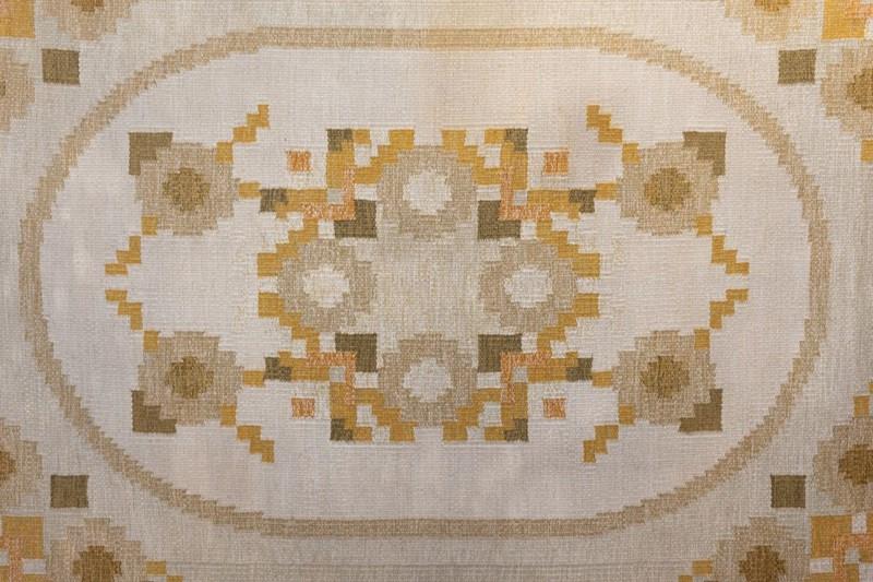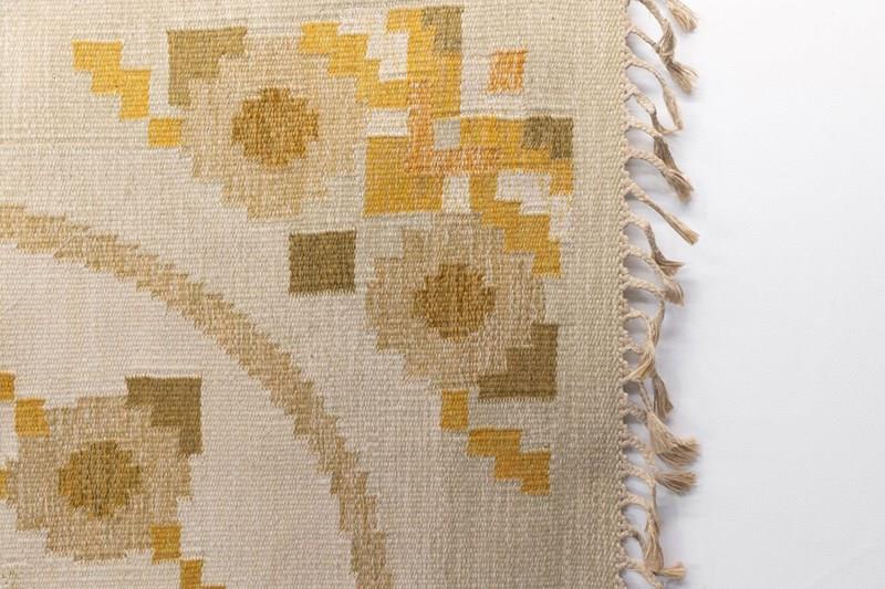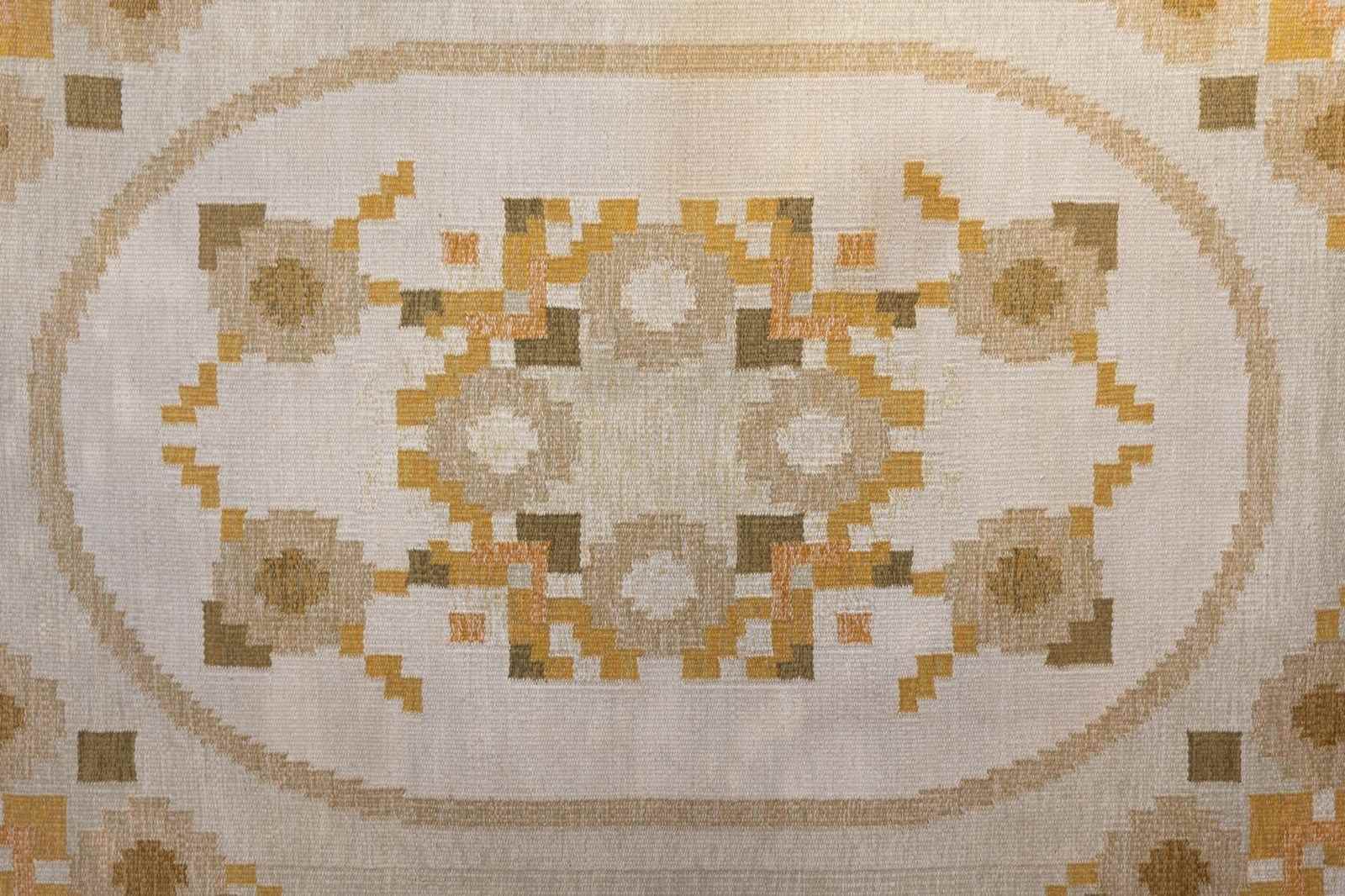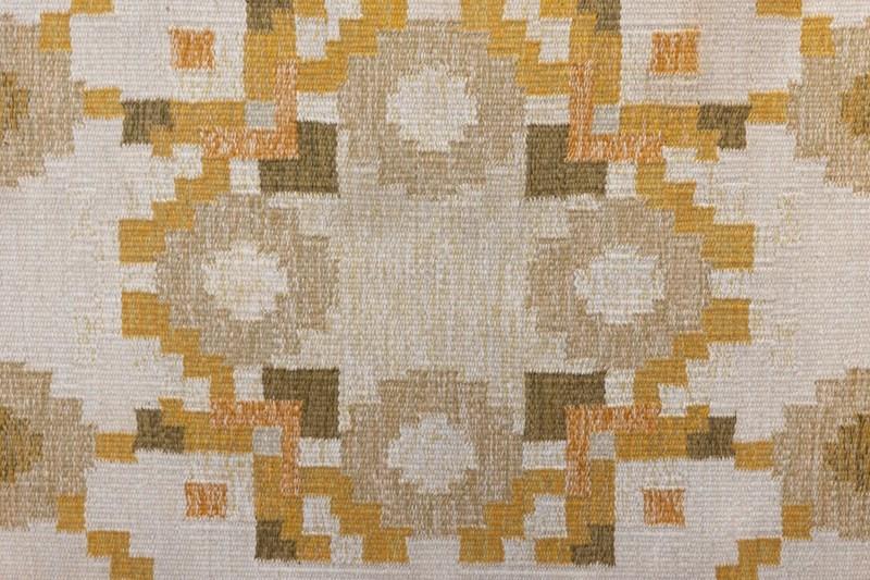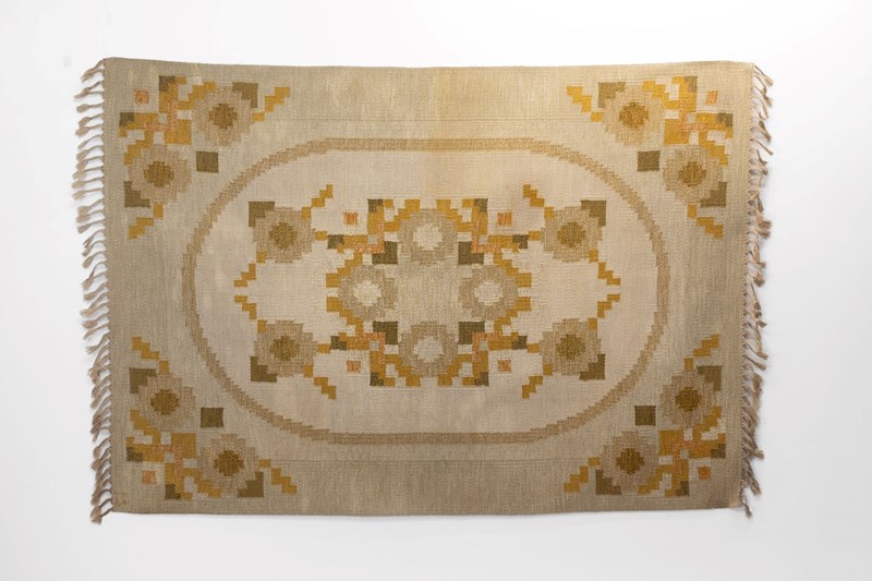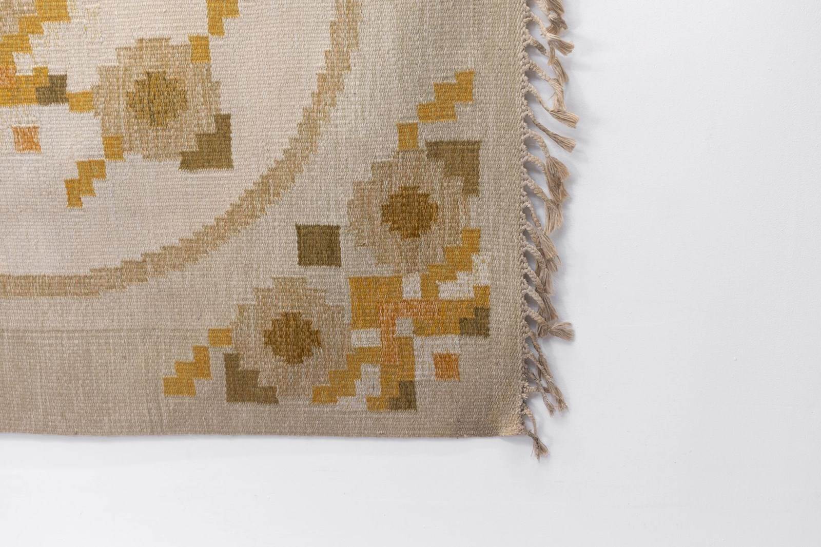 Large vintage Swedish kilim by Ingegerd Silow in earthy tones and geometric design. Signed. Circa 1960. Some colour run as shown in images. All our carpets undergo a professional cleaning process. However, due to their age and previous life, some may exhibit minor signs of wear consistent with their history. Please examine the provided photos carefully or contact us for further information.