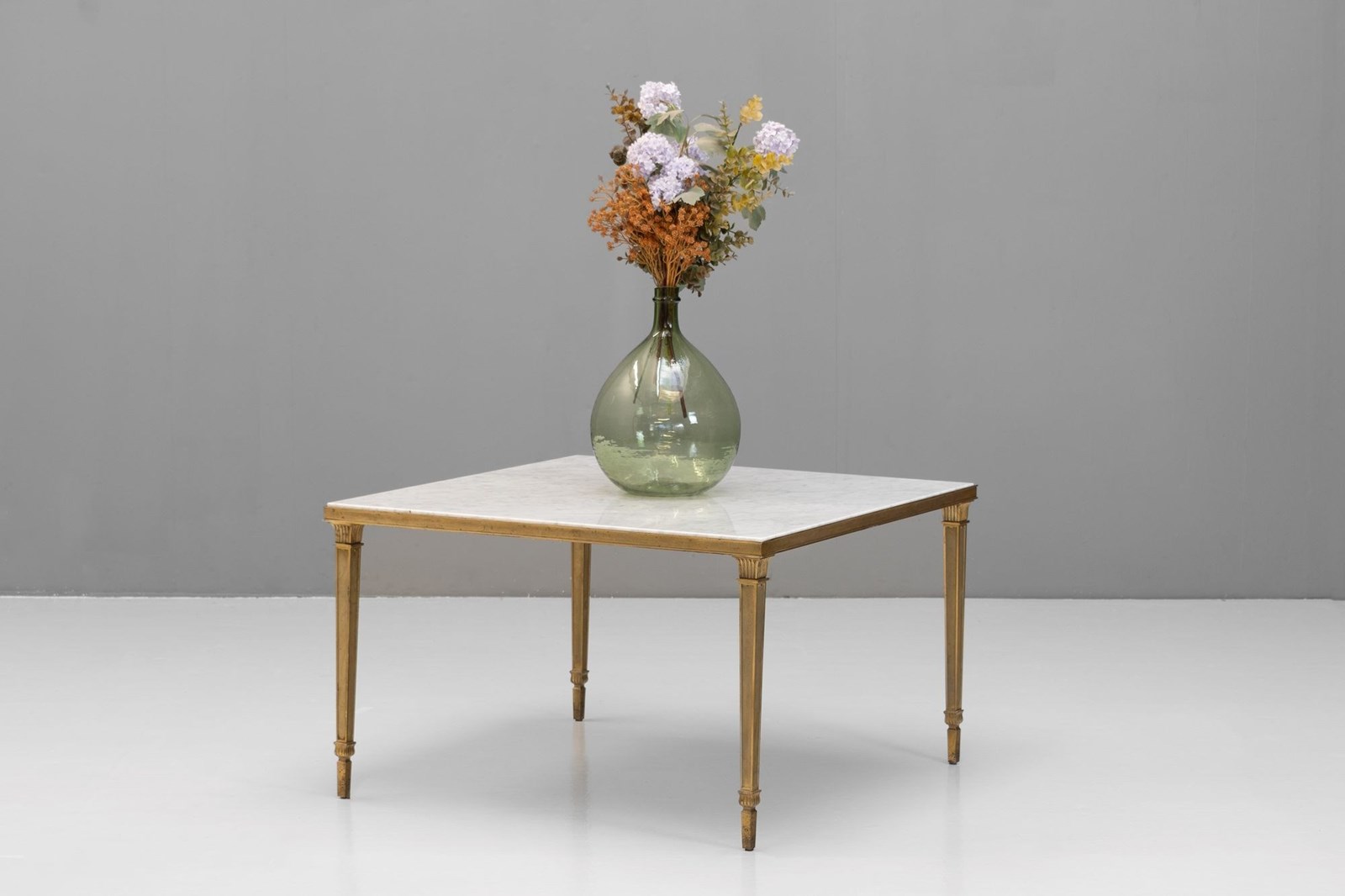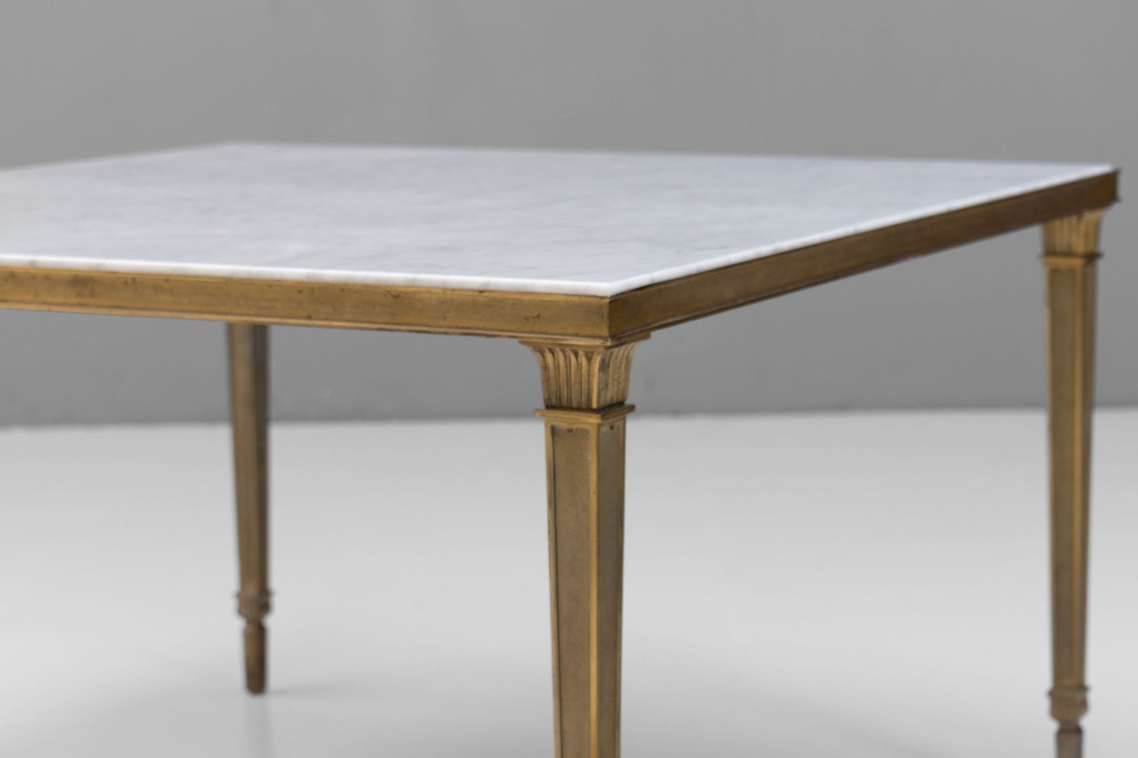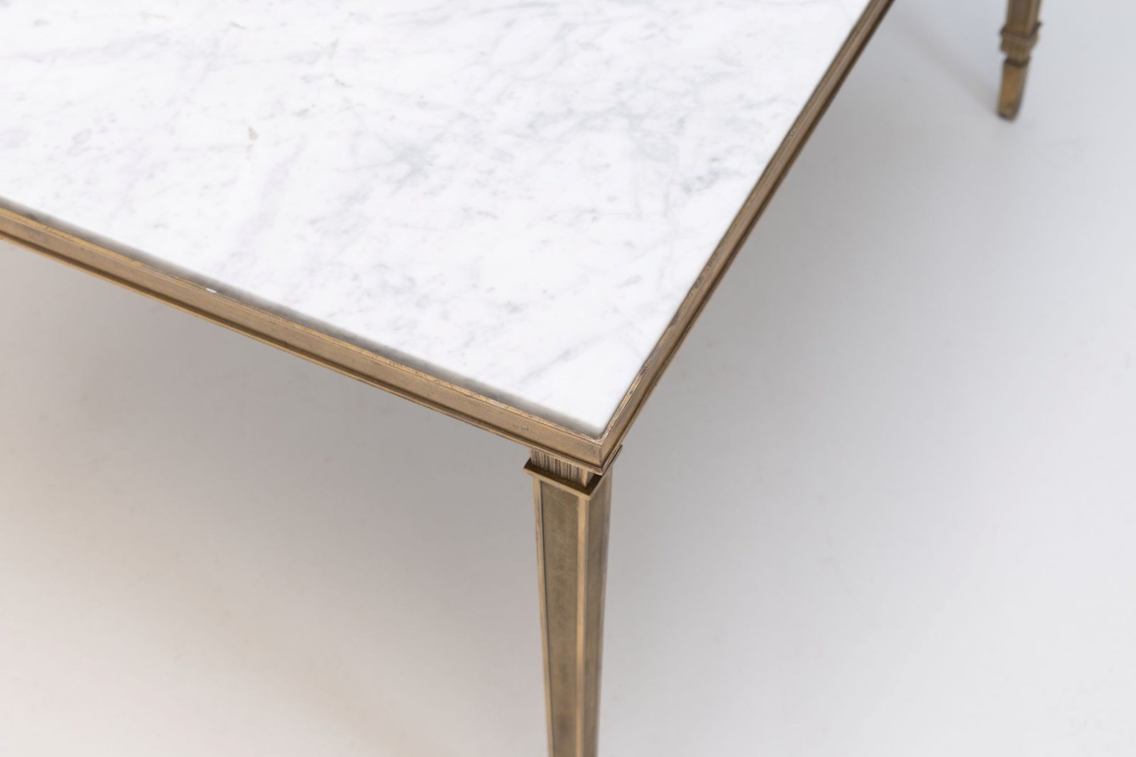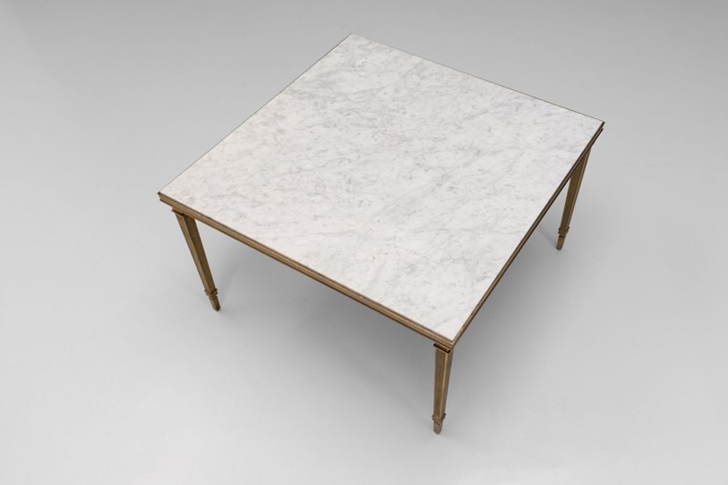 Brass framed marble top coffee table on tapered square legs. Circa 1930.