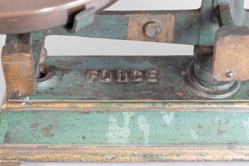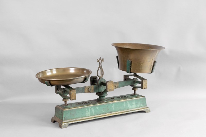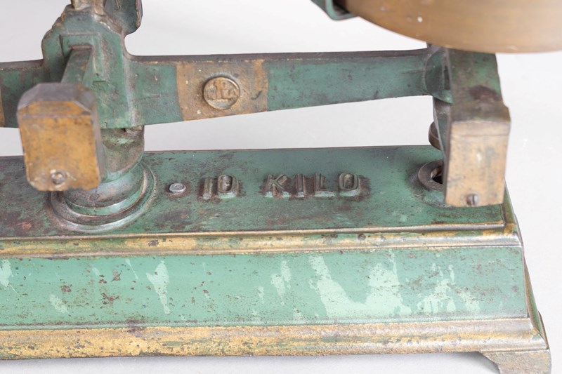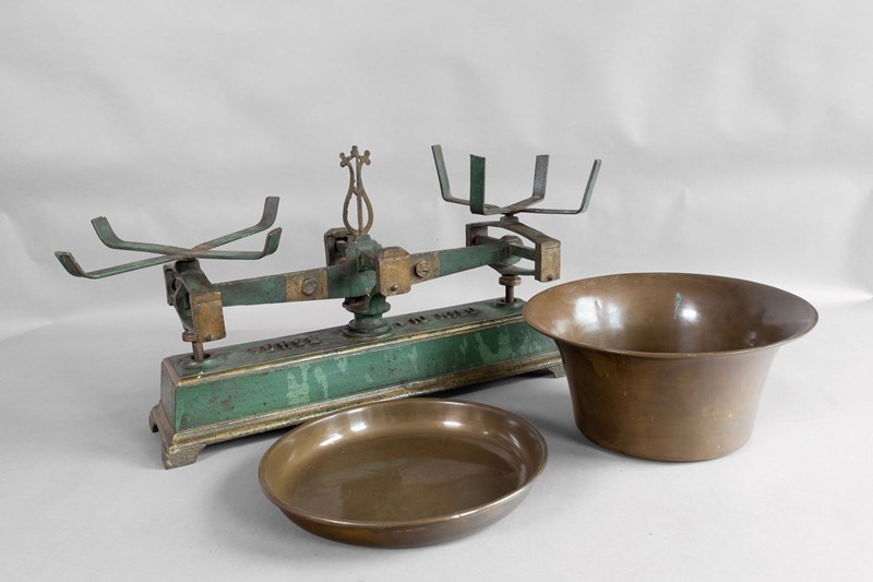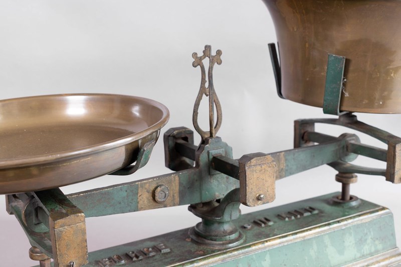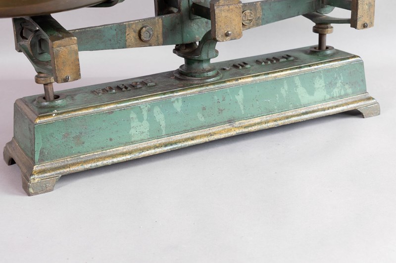 Set of large weighing scales with original painted decoration finish and brass panniers. Circa 1900.