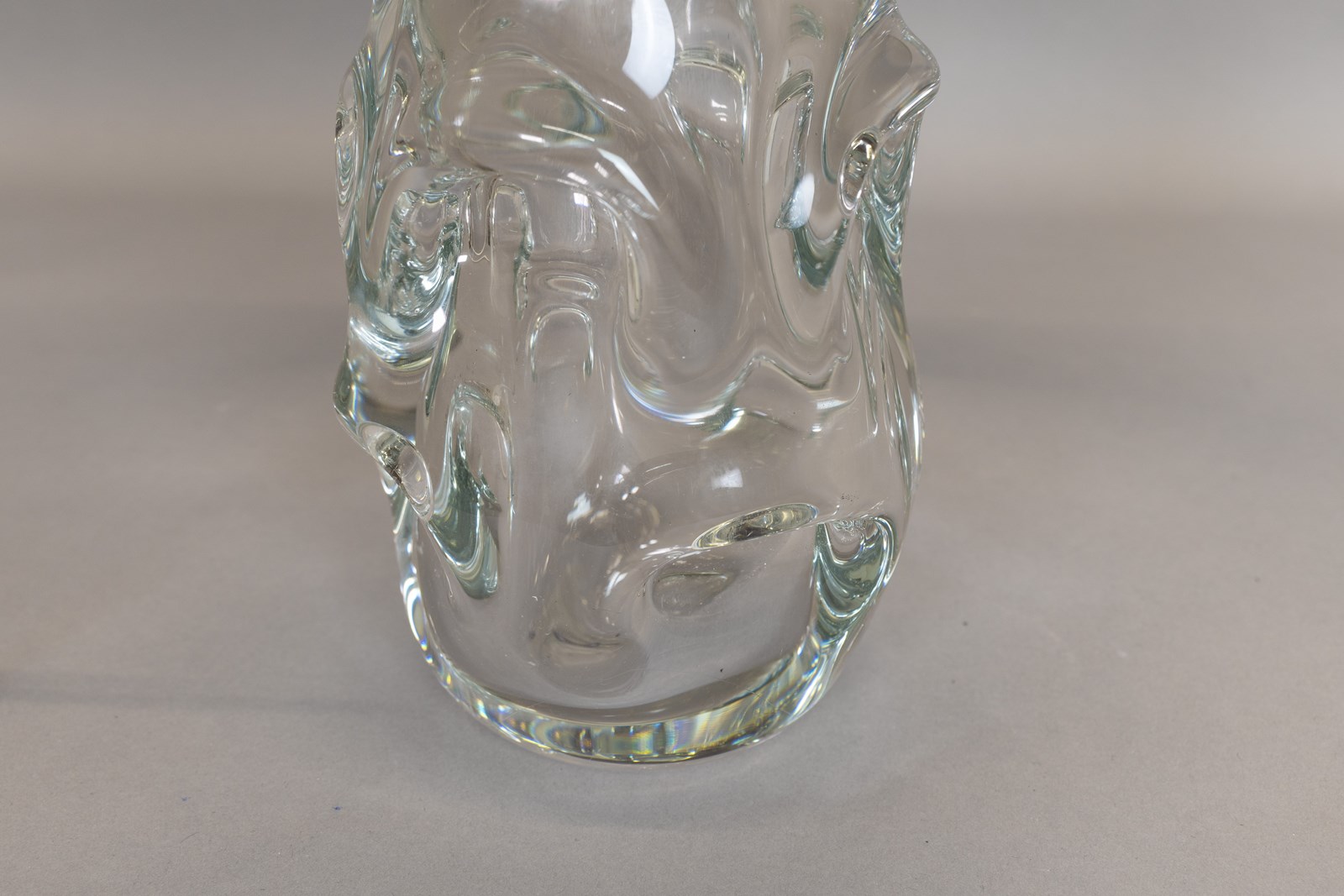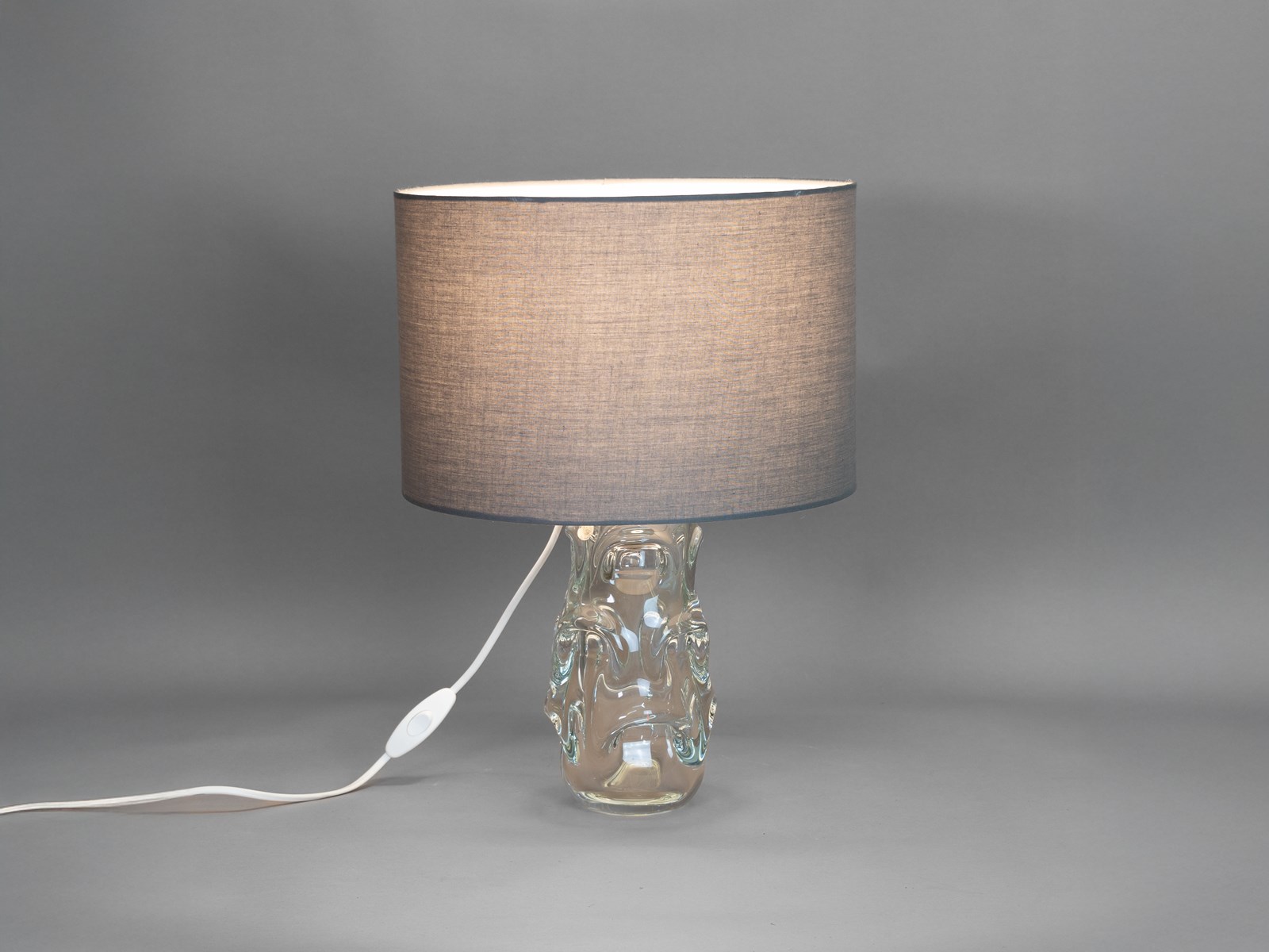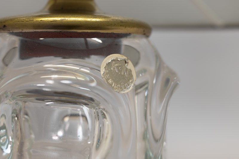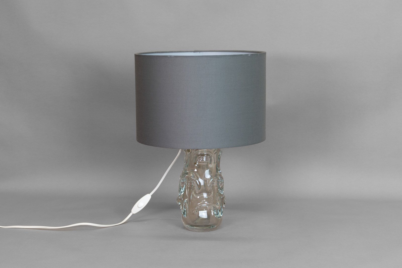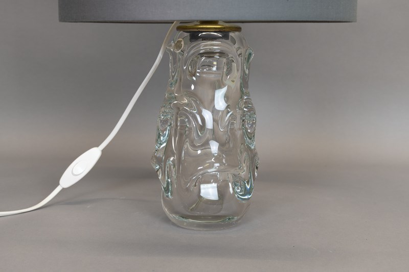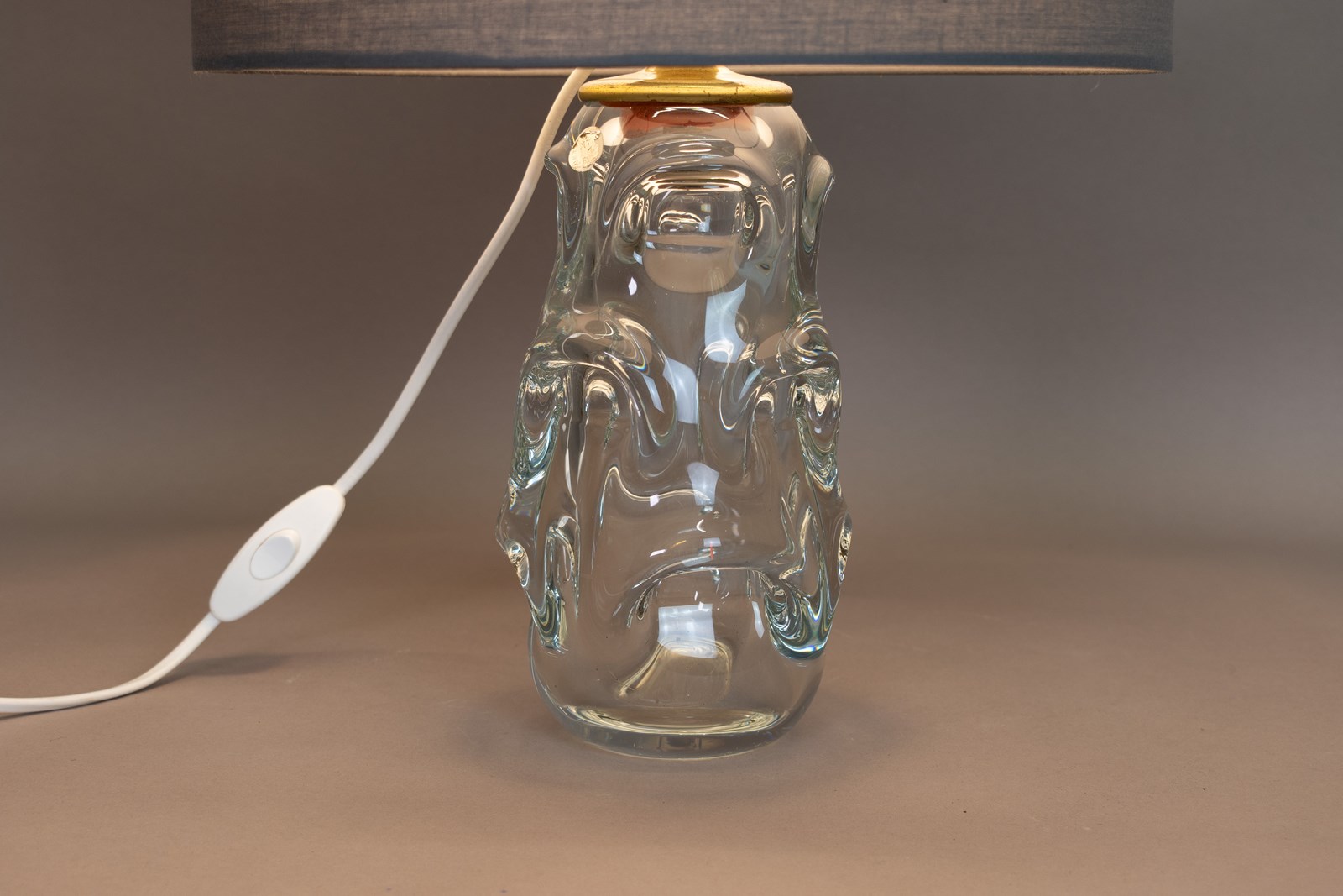 Swedish mid-century clear shaped glass table lamp with brass cap. Re-wired and tested. Shade not included. Sweden circa 1970.