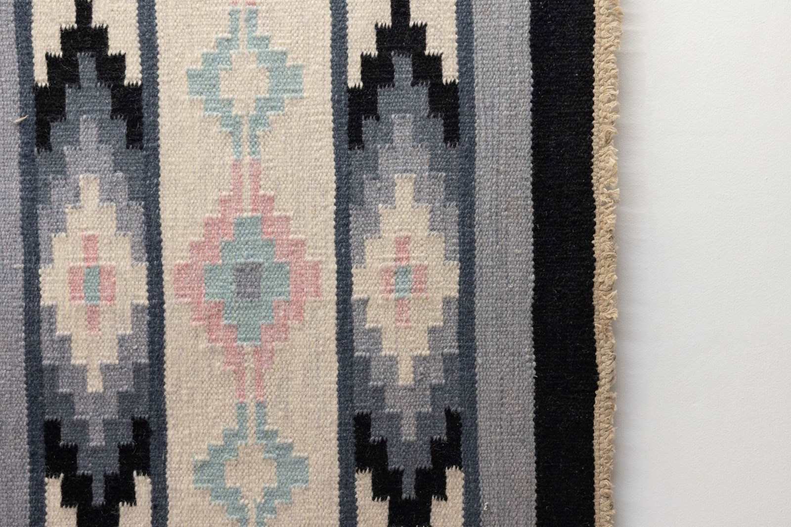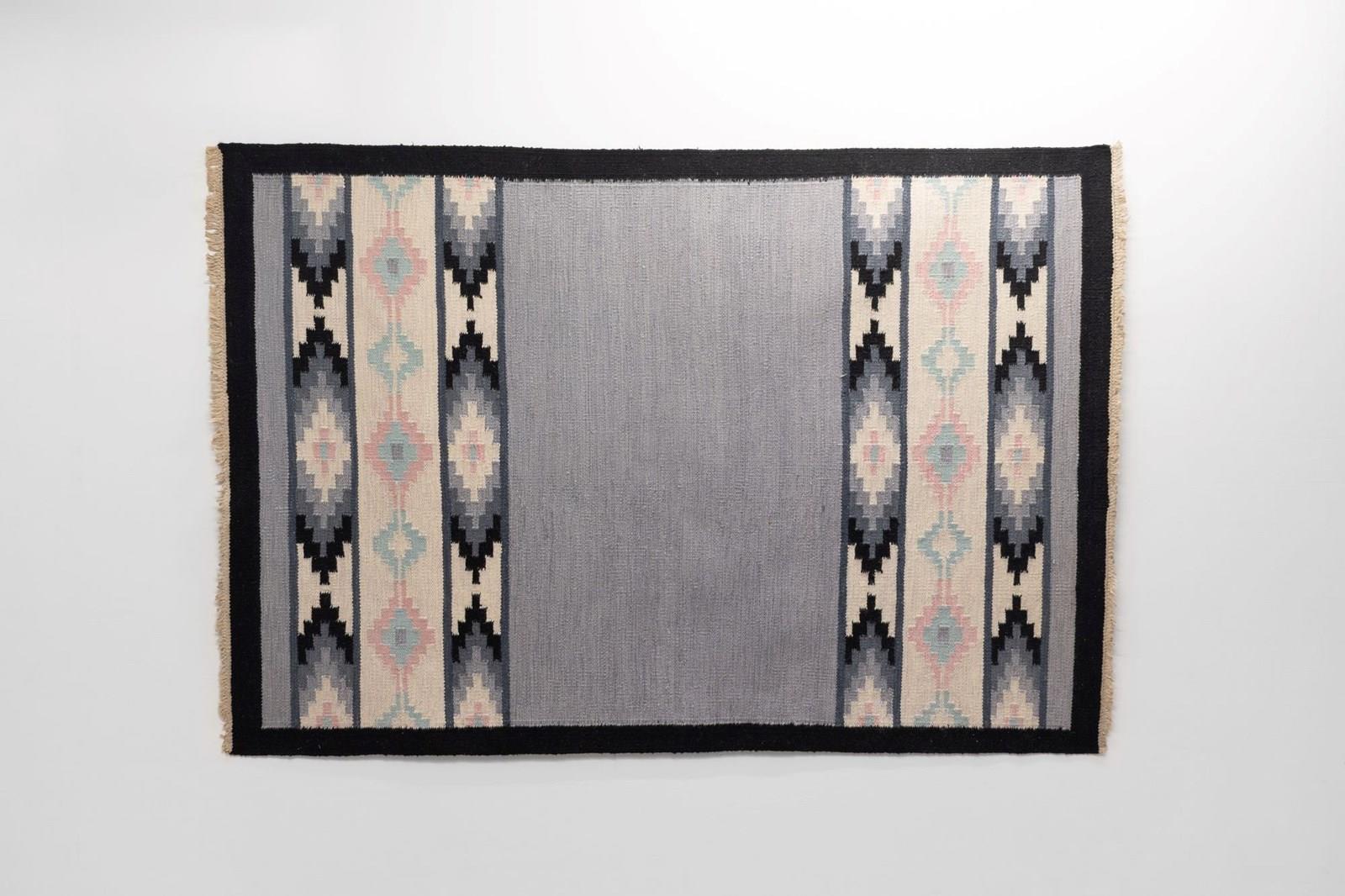 Mid-Century Swedish Kilim in Tones of Grey with a plain central motif and geometric patterned fringes. Sweden circa 1960. All our carpets undergo a professional cleaning process. However, due to their age and previous life, some may exhibit minor signs of wear consistent with their history. Please examine the provided photos carefully or contact us for further information.