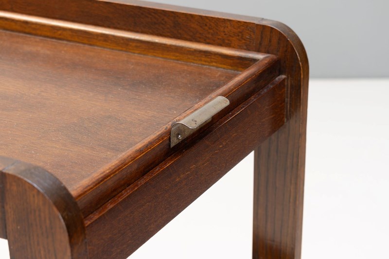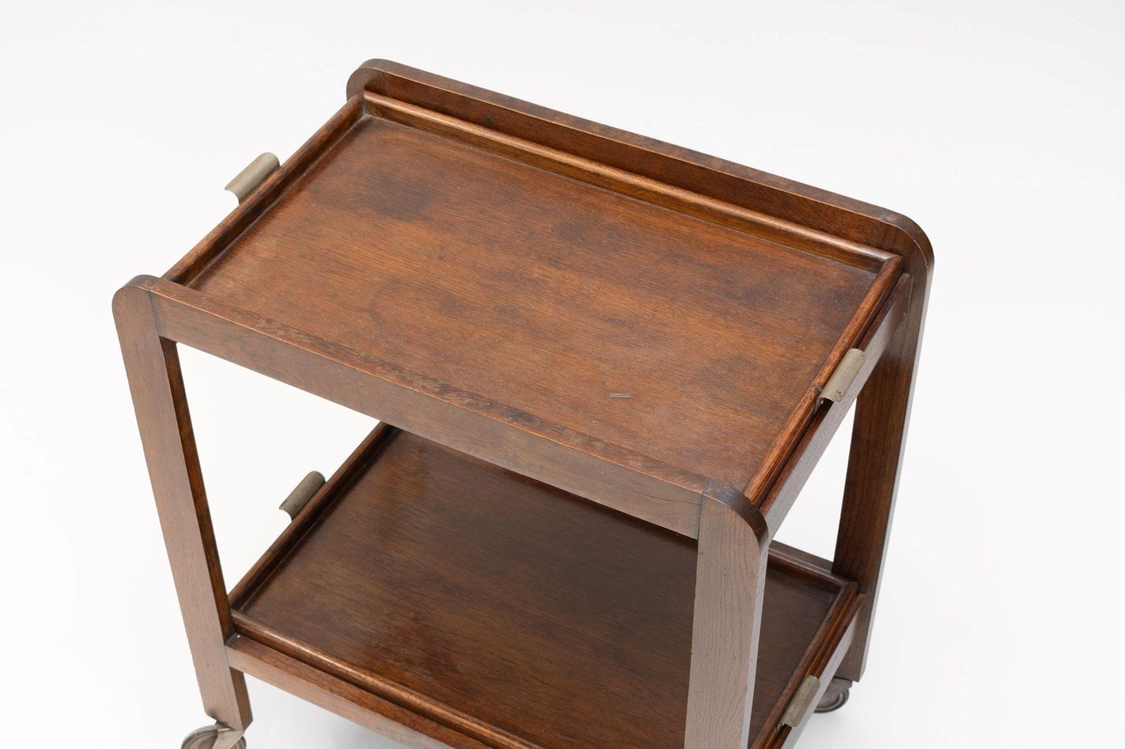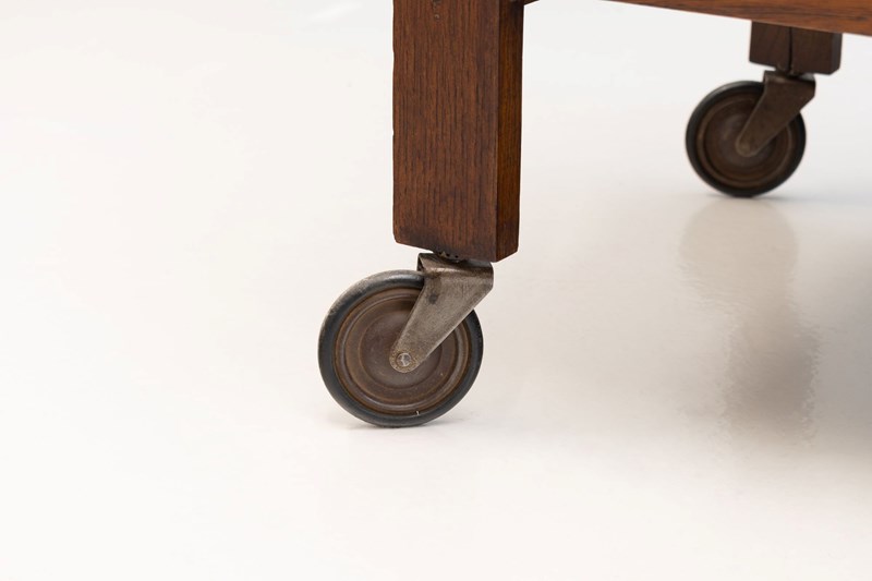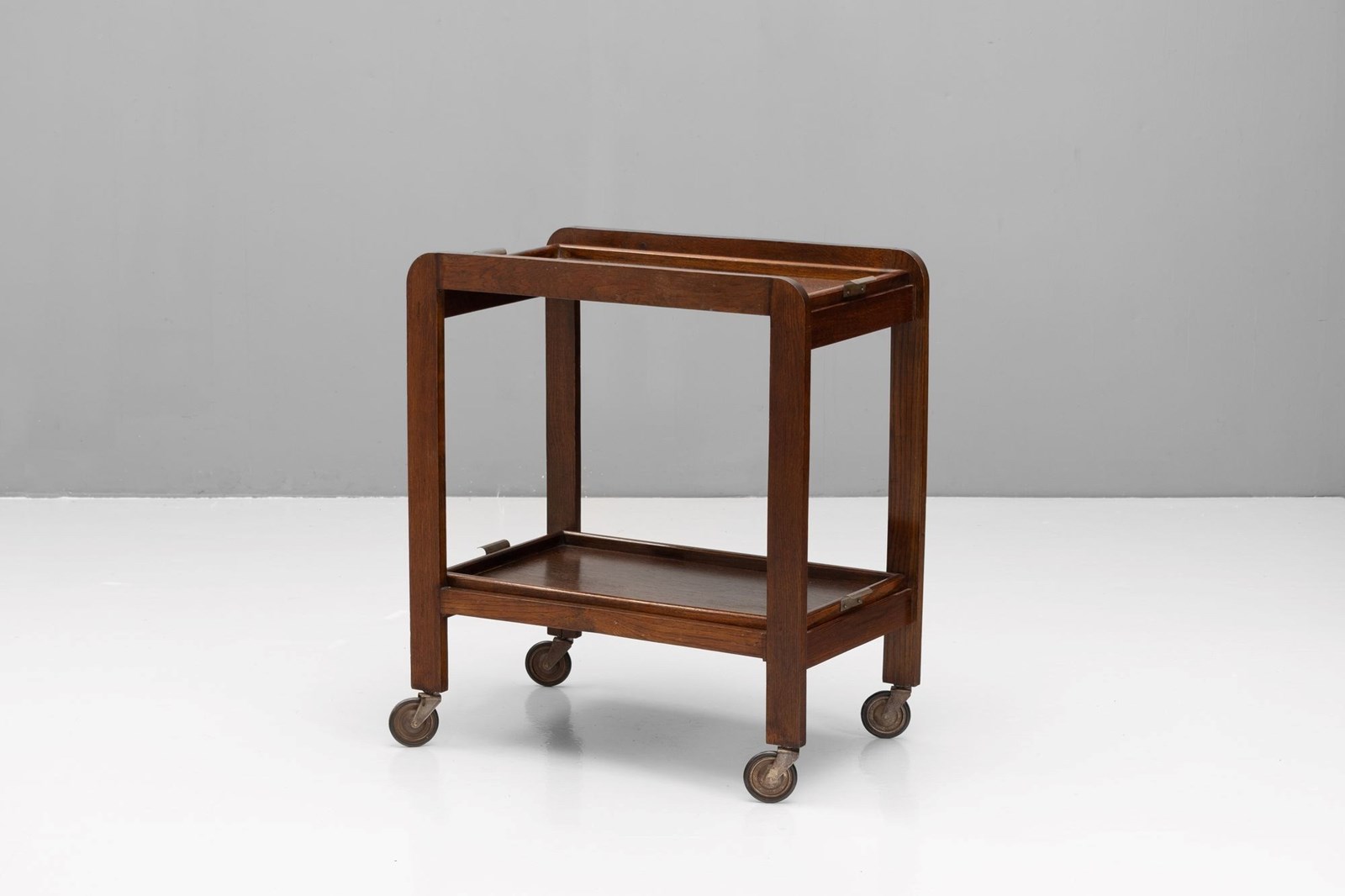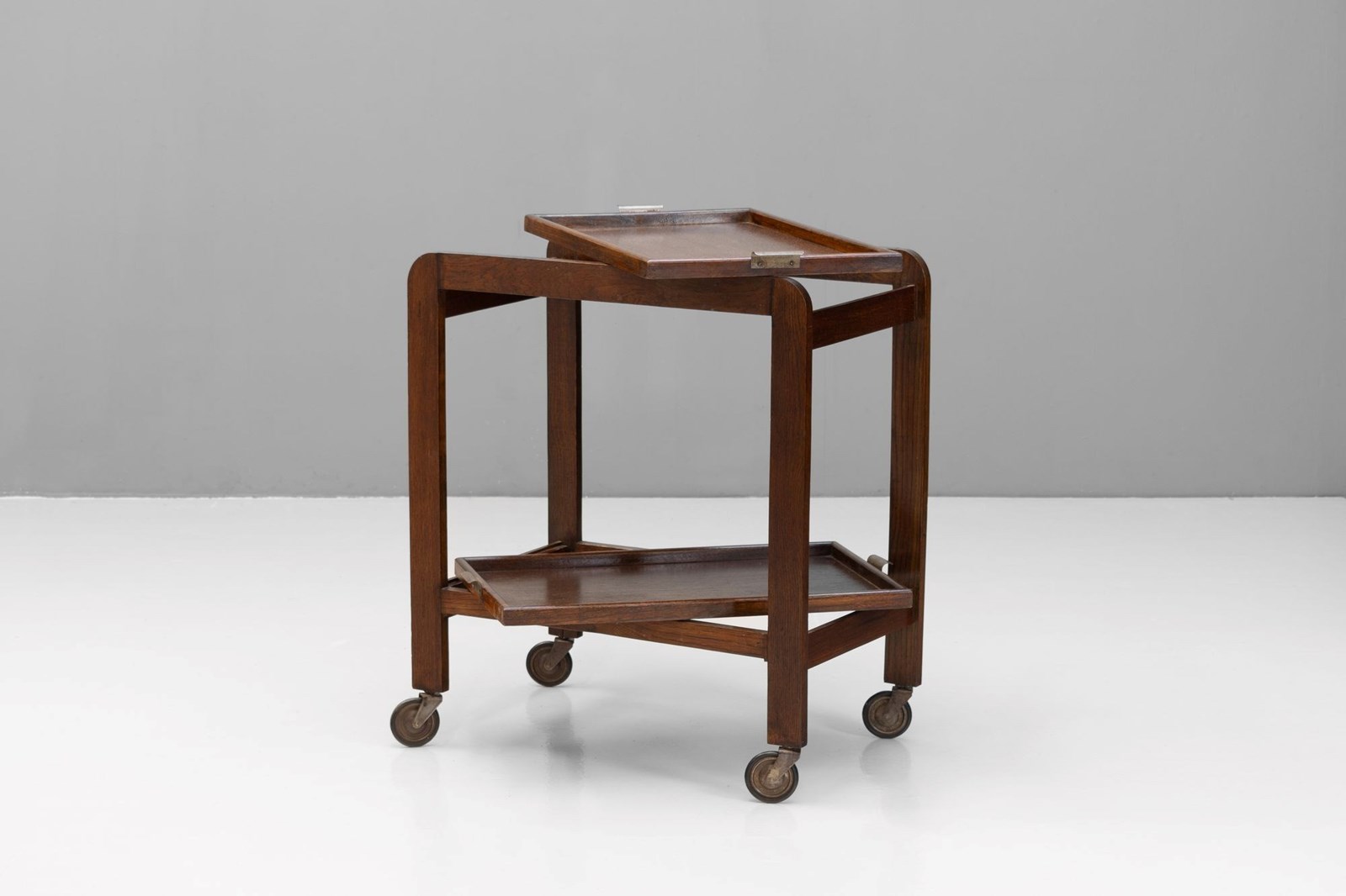 Solid oak drinks trolley in an Art Deco style. Removable serving trays. U.K circa 1950.