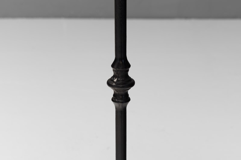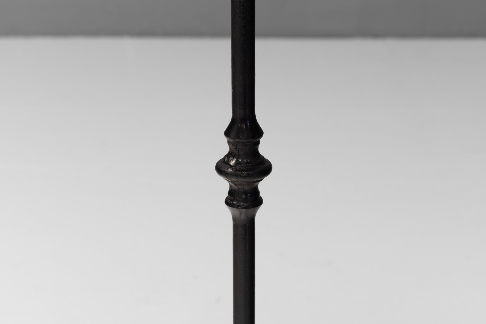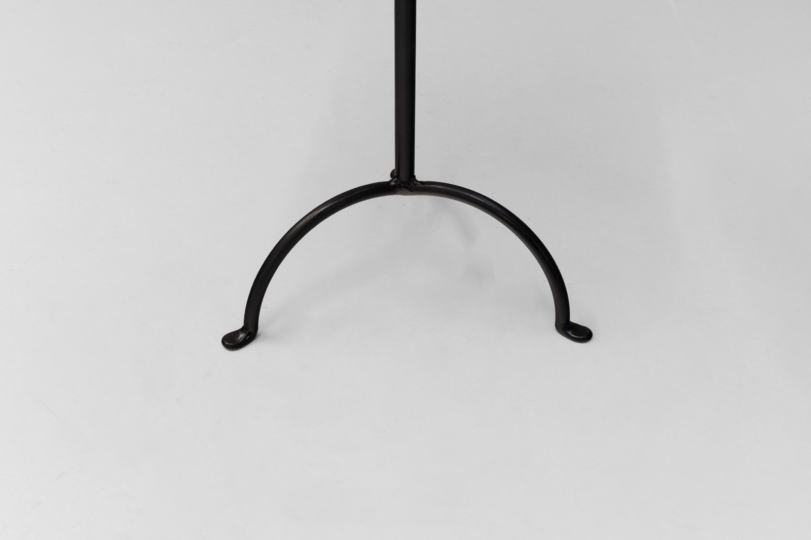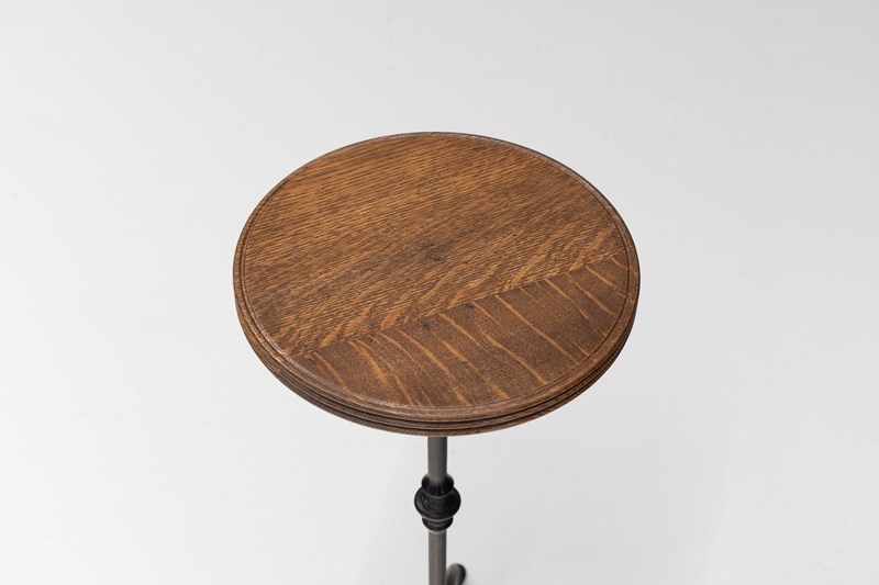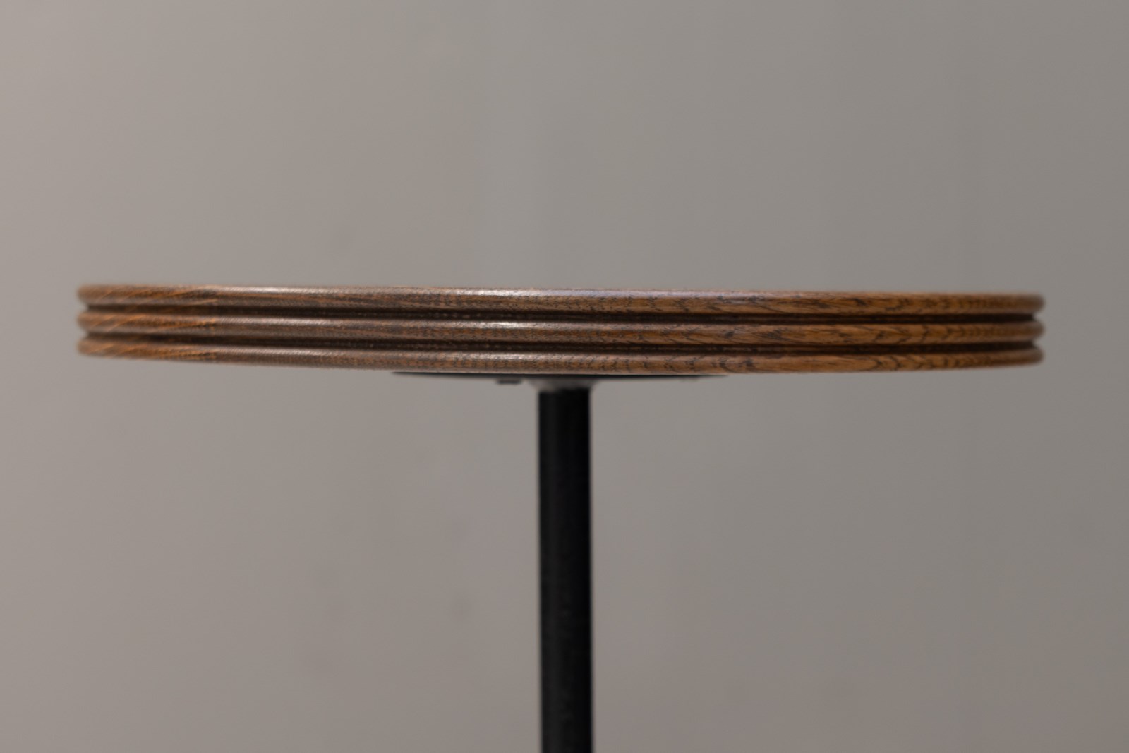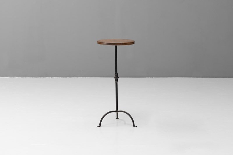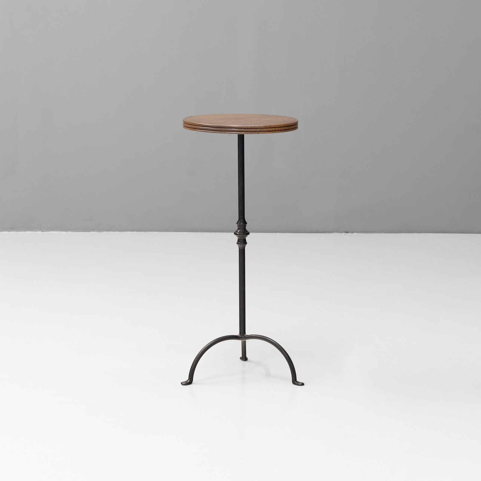 Newly manufactured martini table with reclaimed oak top on wrought iron tripod leg base. Circa 2025