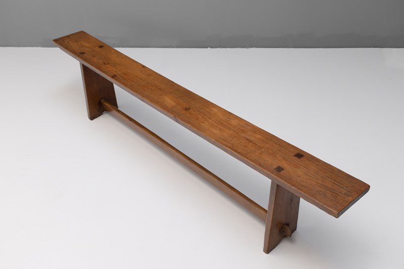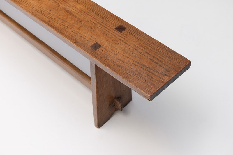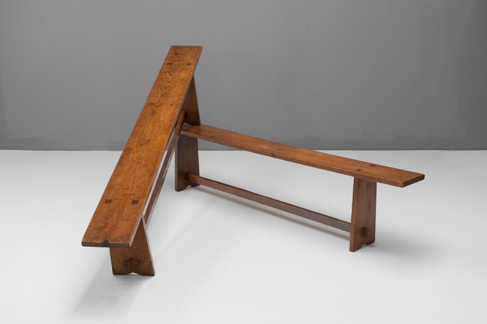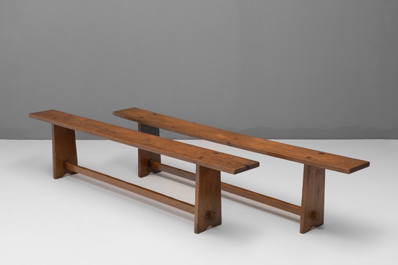 Pair of early 20th century solid pine benches. Great aged patina with signs of old worm. Fully treated and restored. France circa 1920.