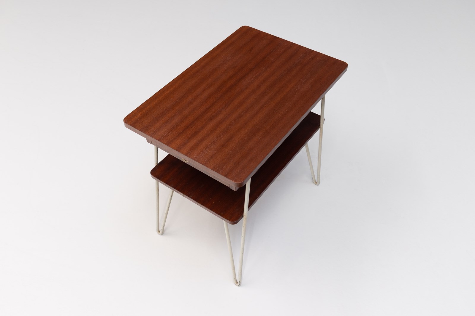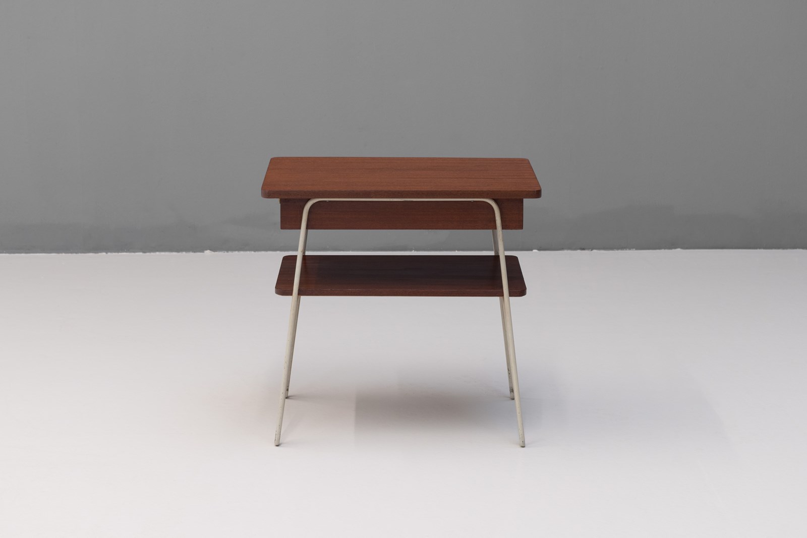 Pair of mid-century bedside tables in teak with original painted steel legs. Sweden circa 1960.