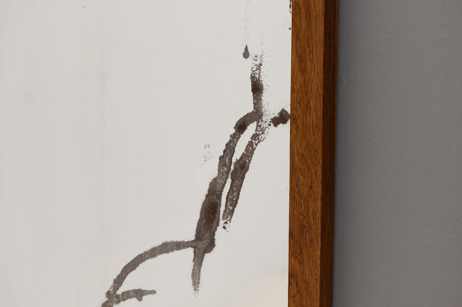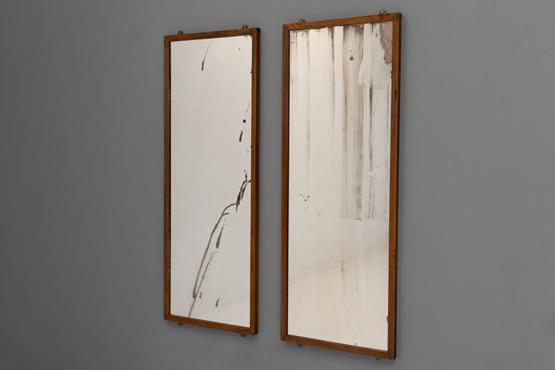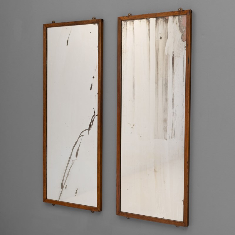 Pair of oak framed rectangular mirrors with original tarnished glass.