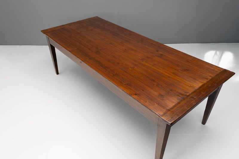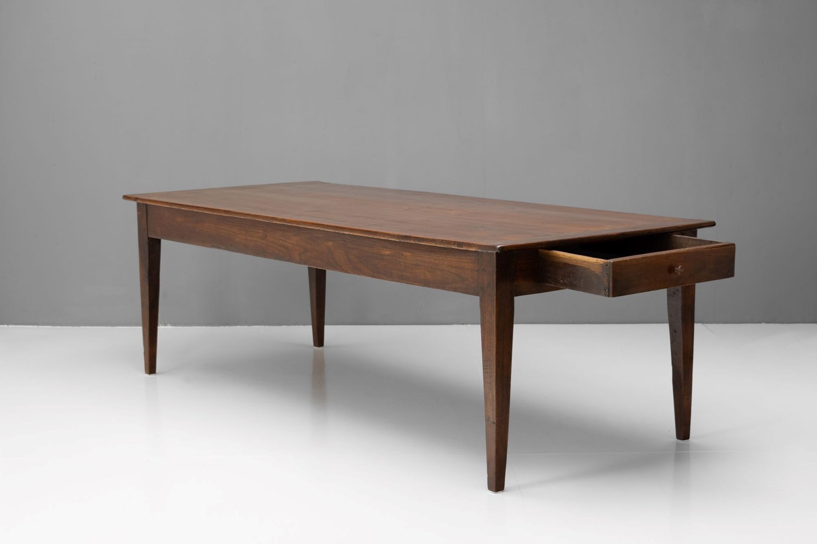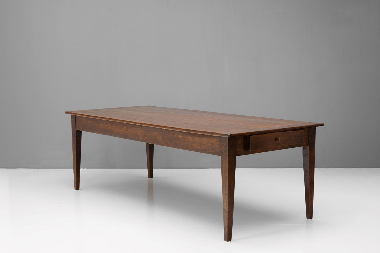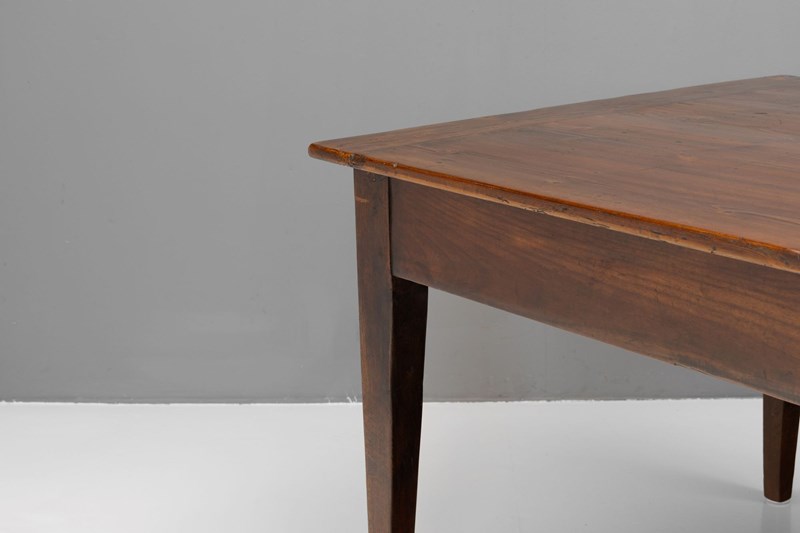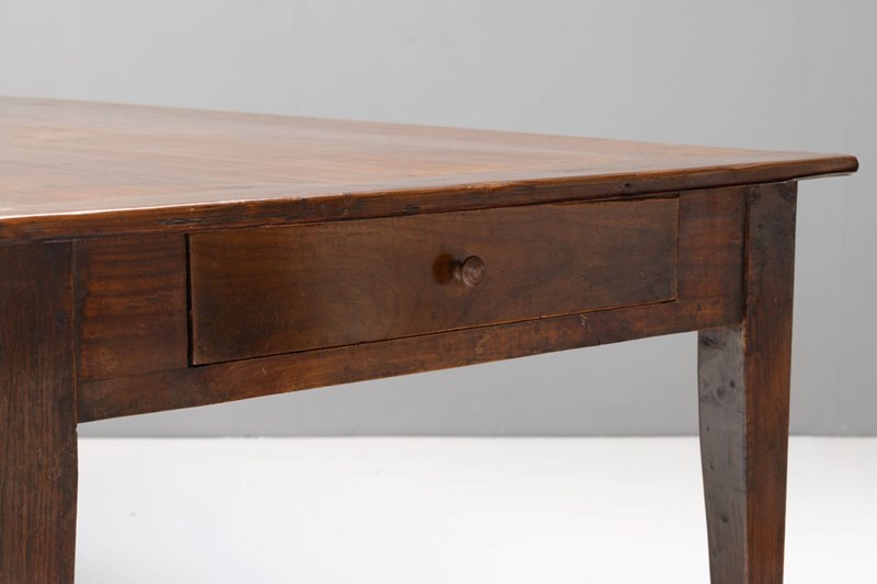 French farm table with polished pine top on cherry base and single drawer at one end. Circa 1880.