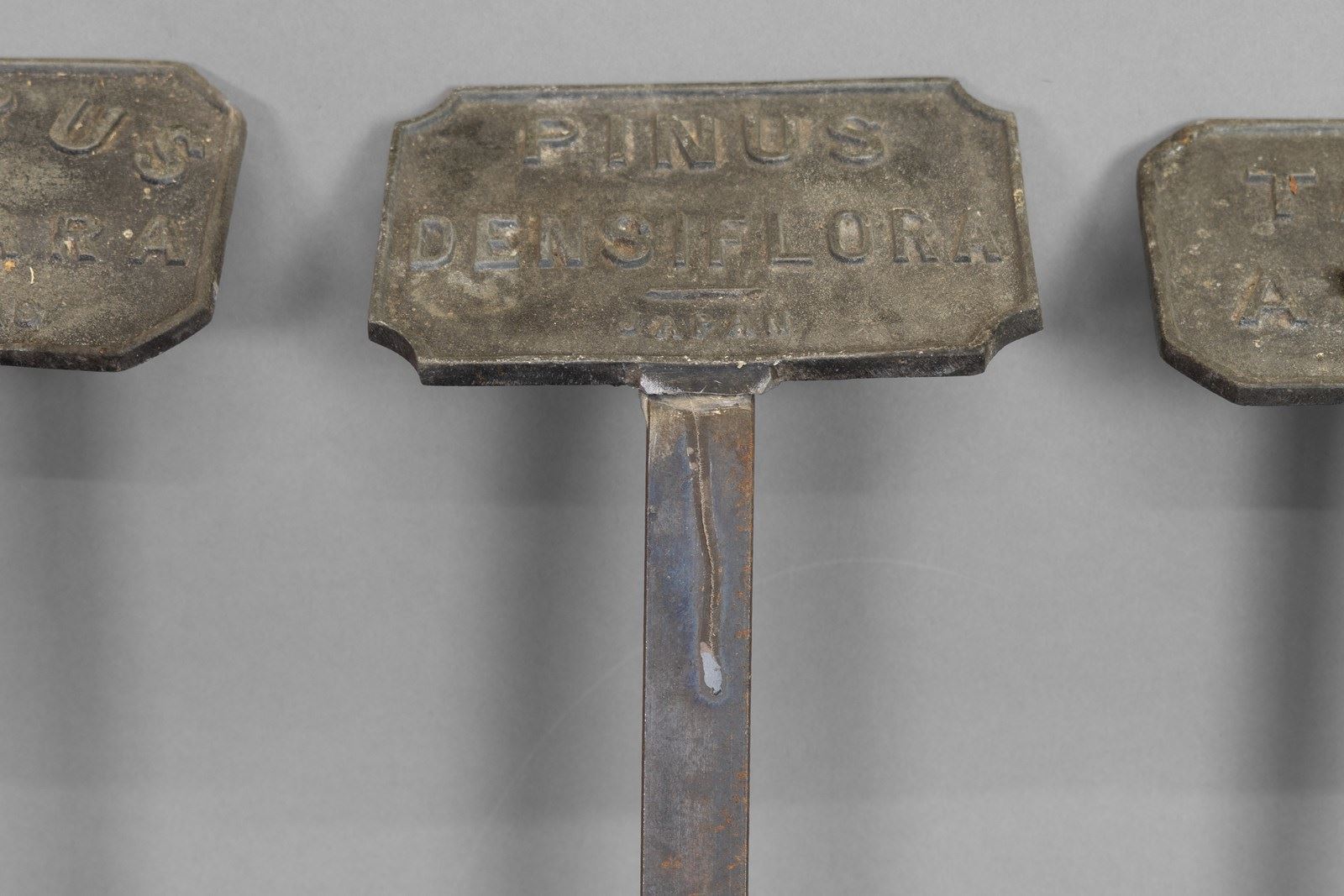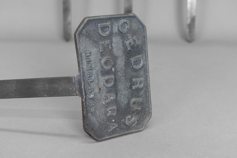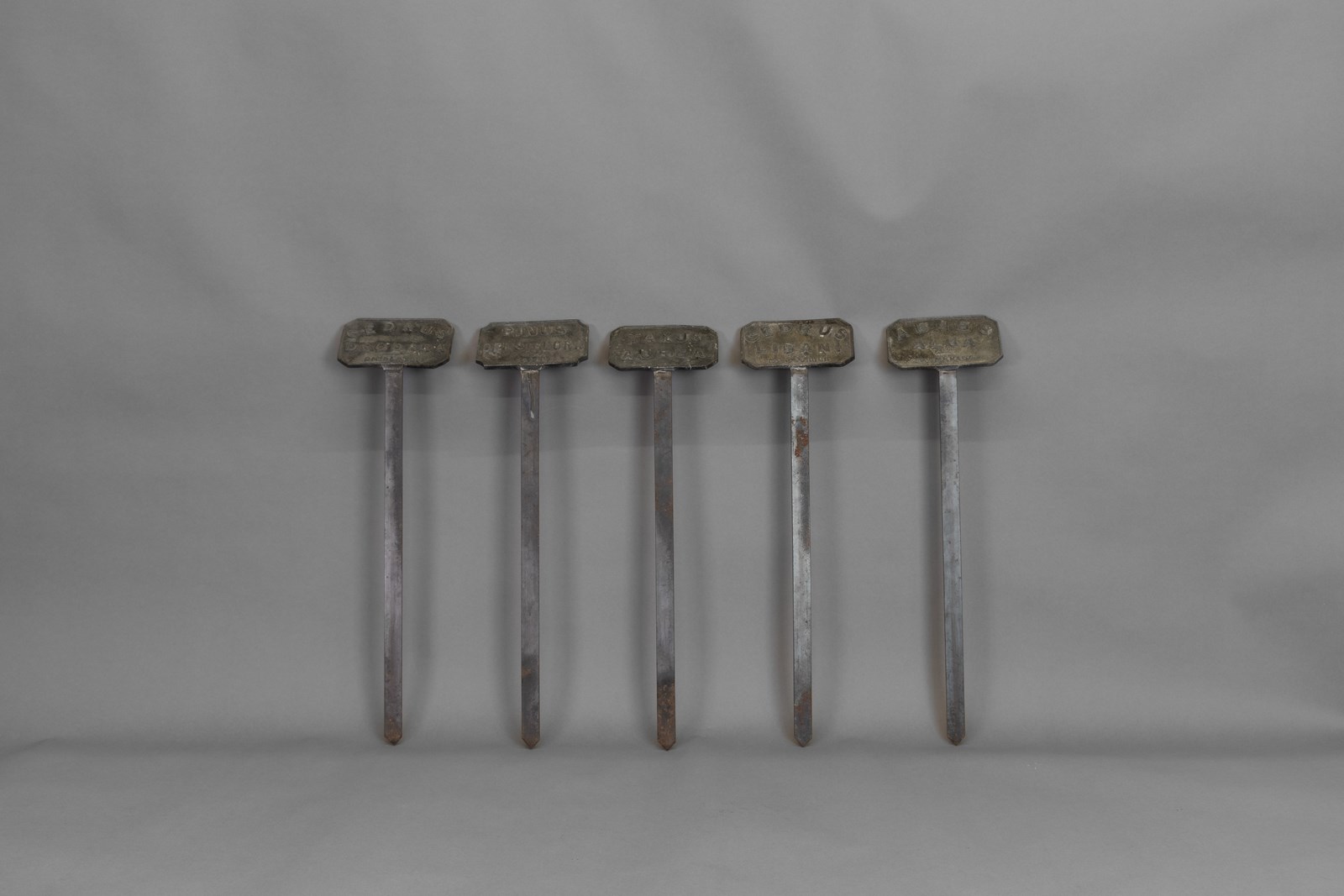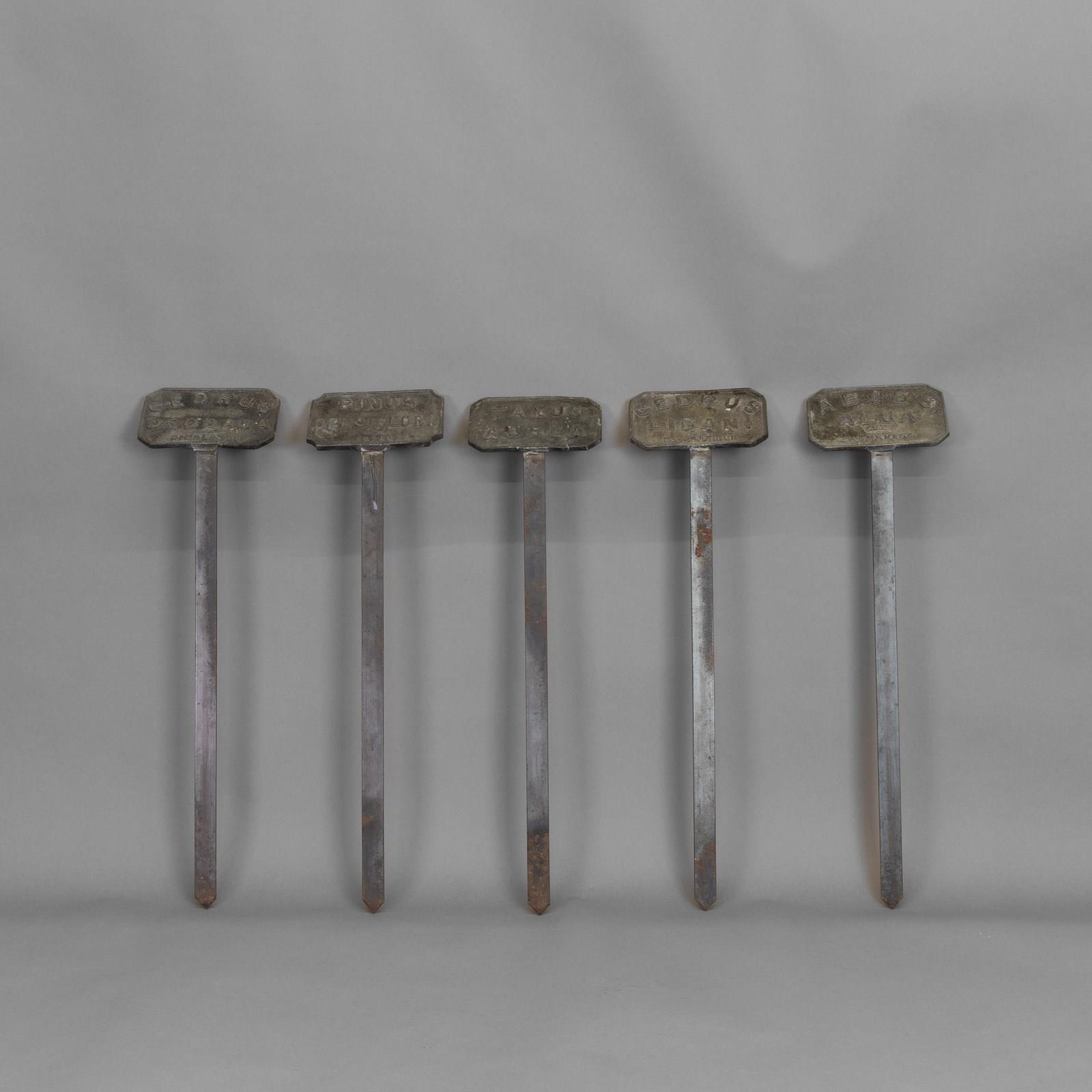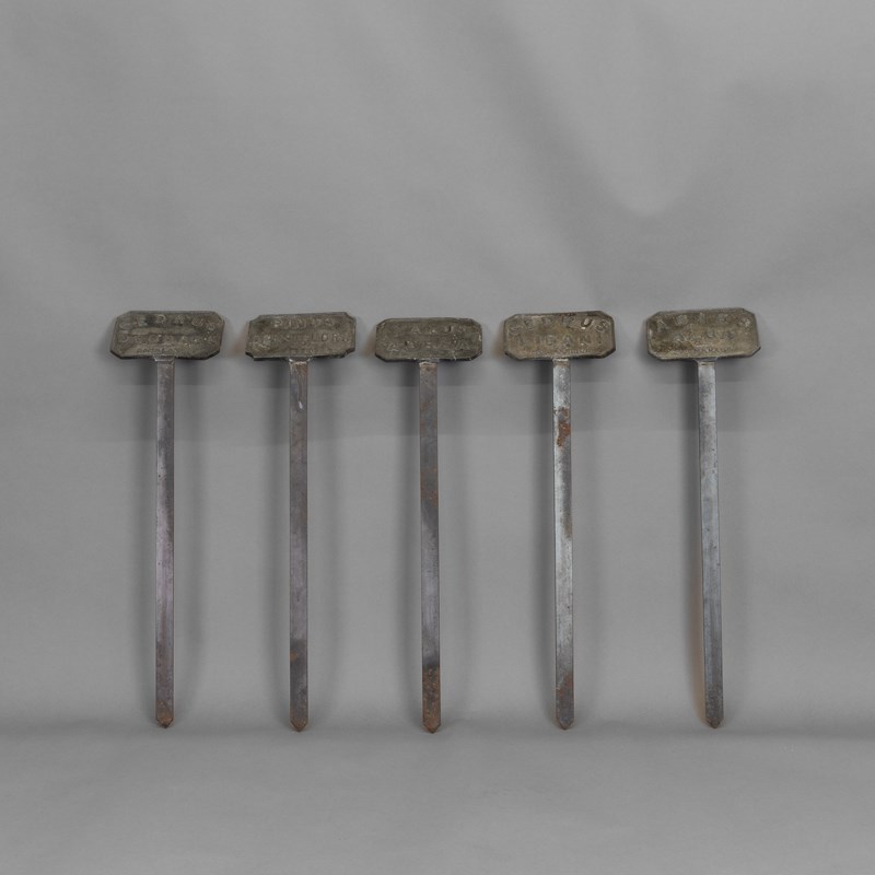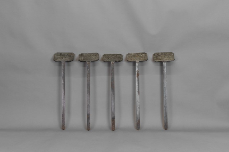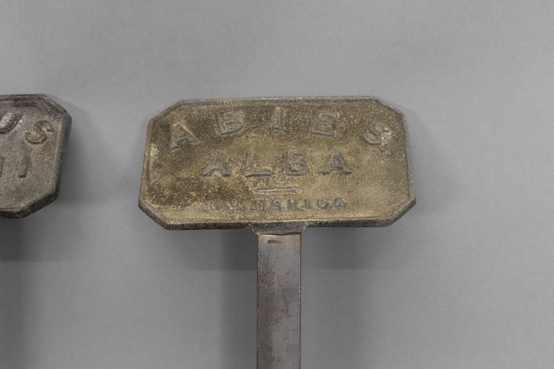 Lead tablet plant labels on spikes. Circa 1900
