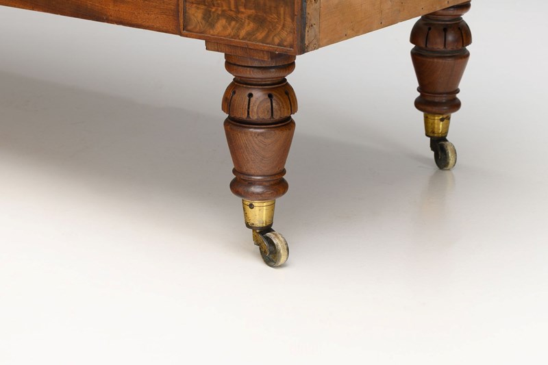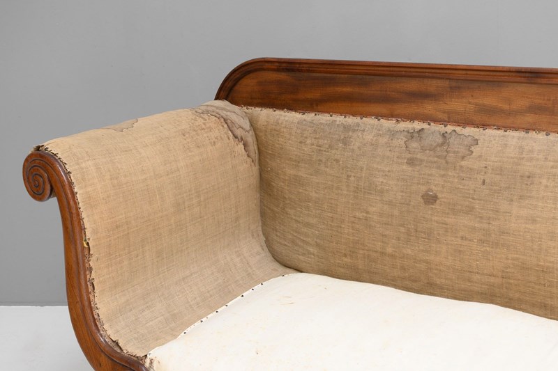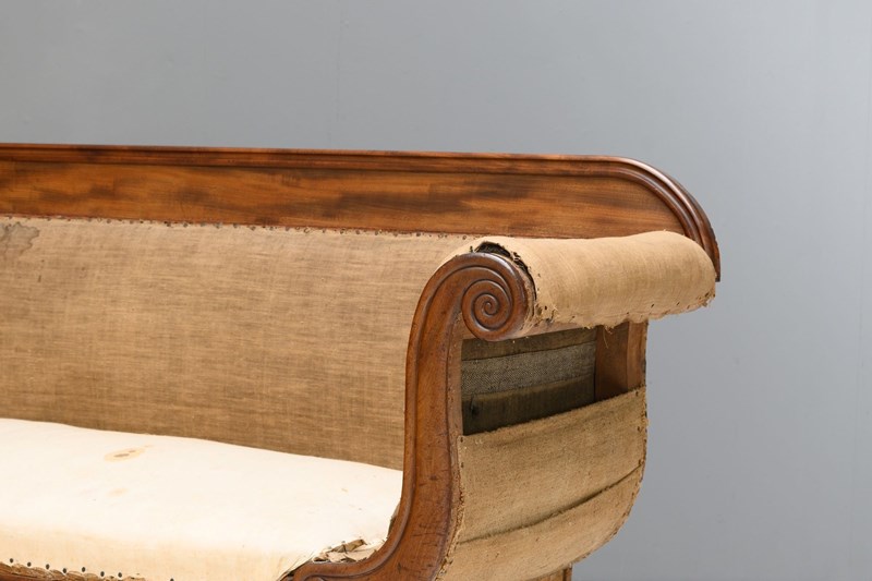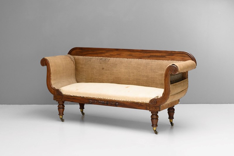 Mahogany framed scroll arm settee on turned legs and original brass casters. U.K circa 1850.