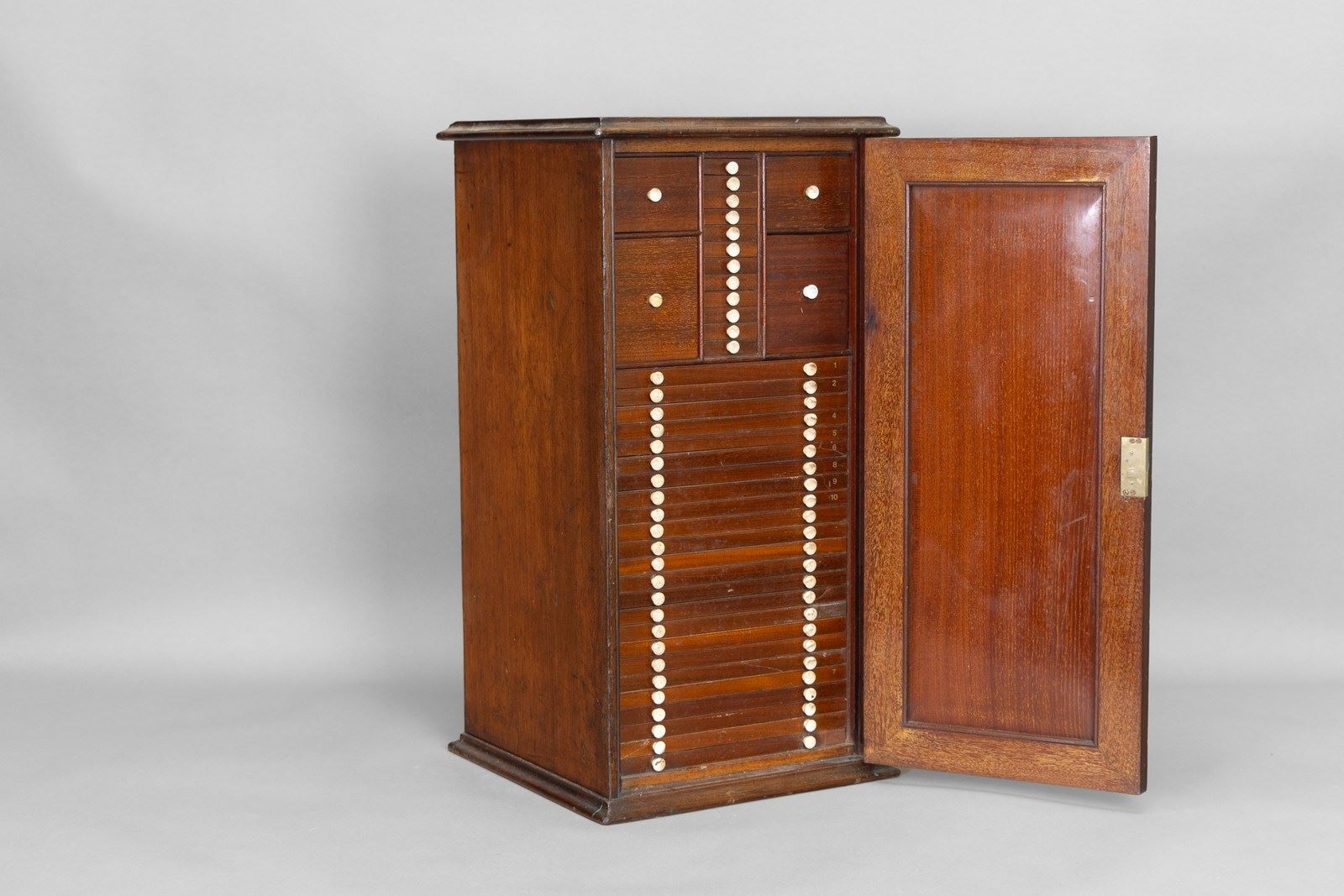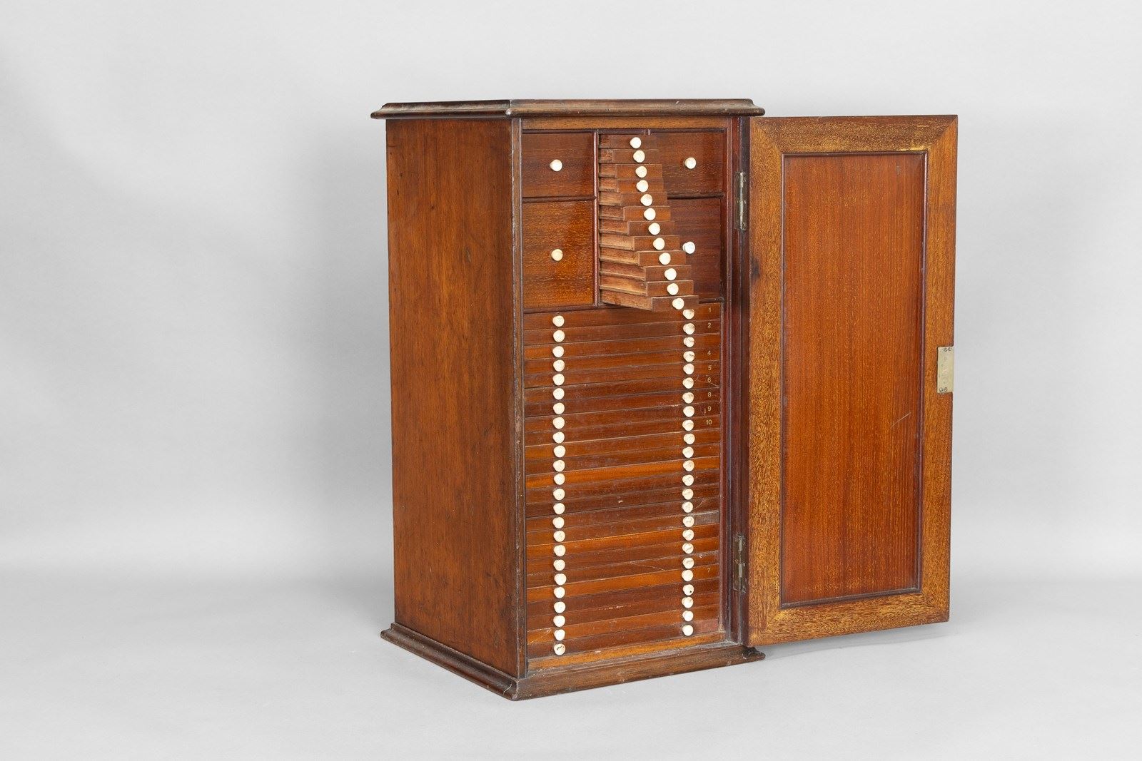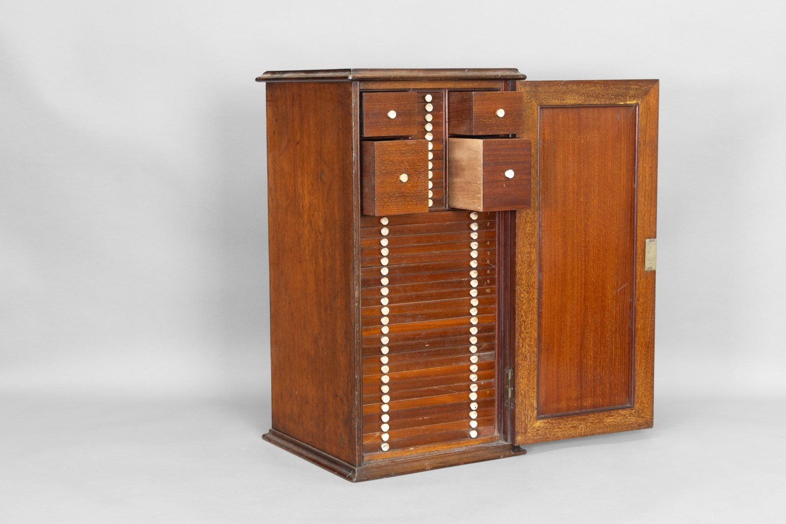Mahogany slide cabinet with inset brass carrying handle. Circa 1890.