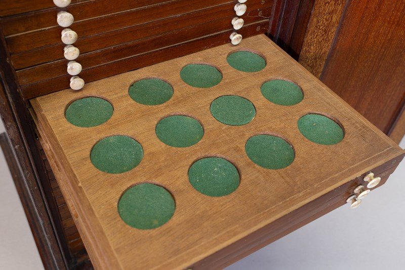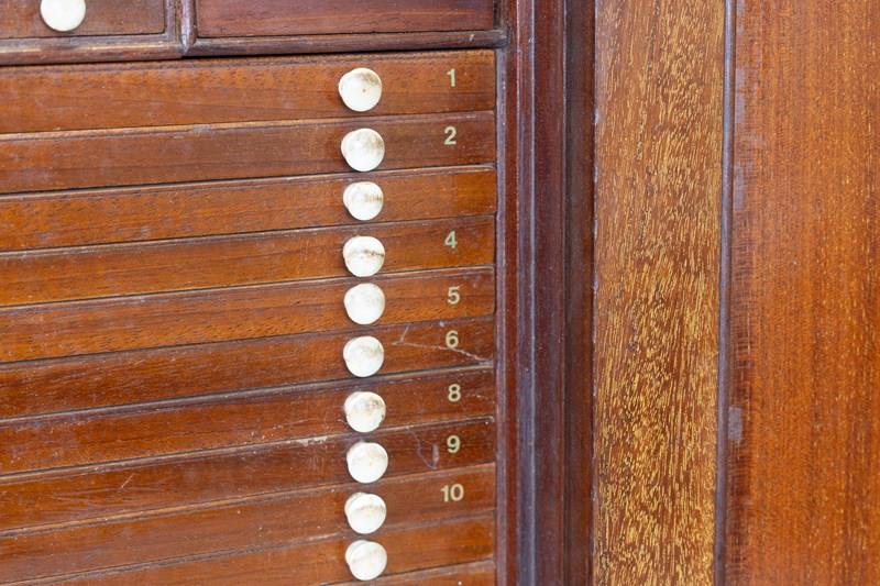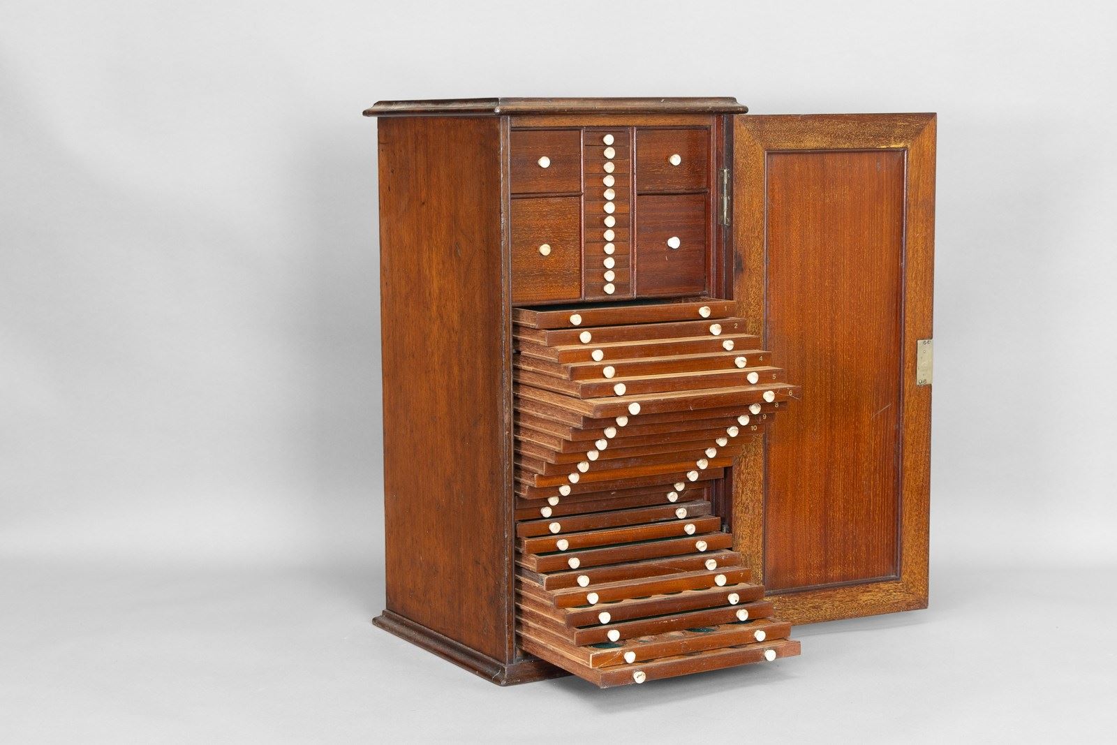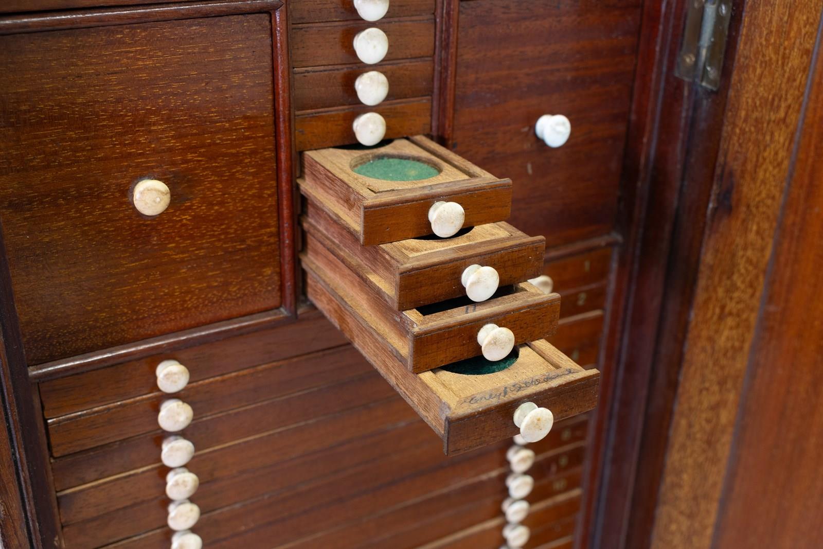 Mahogany slide cabinet with inset brass carrying handle. Circa 1890.
