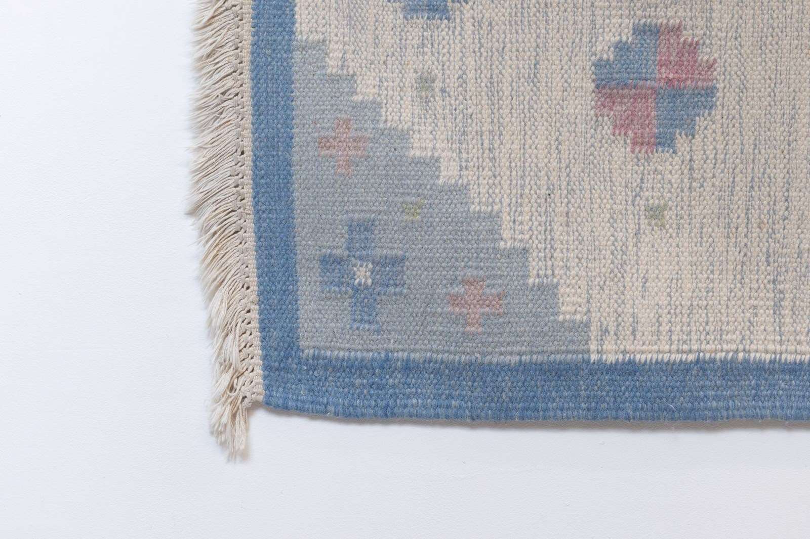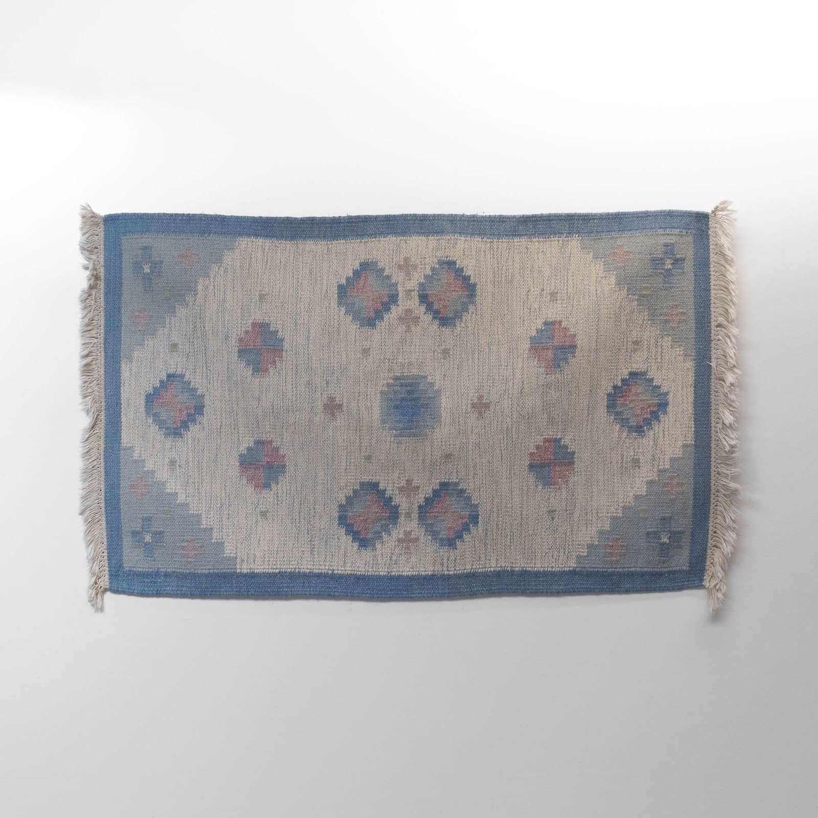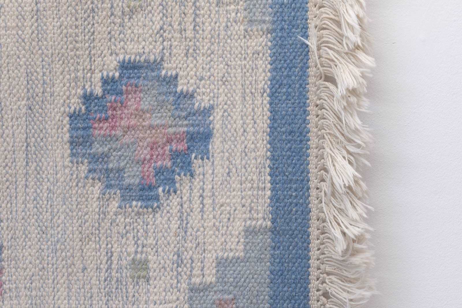 Small sized Swedish kilim with a cream base and blue border, hints of pink.